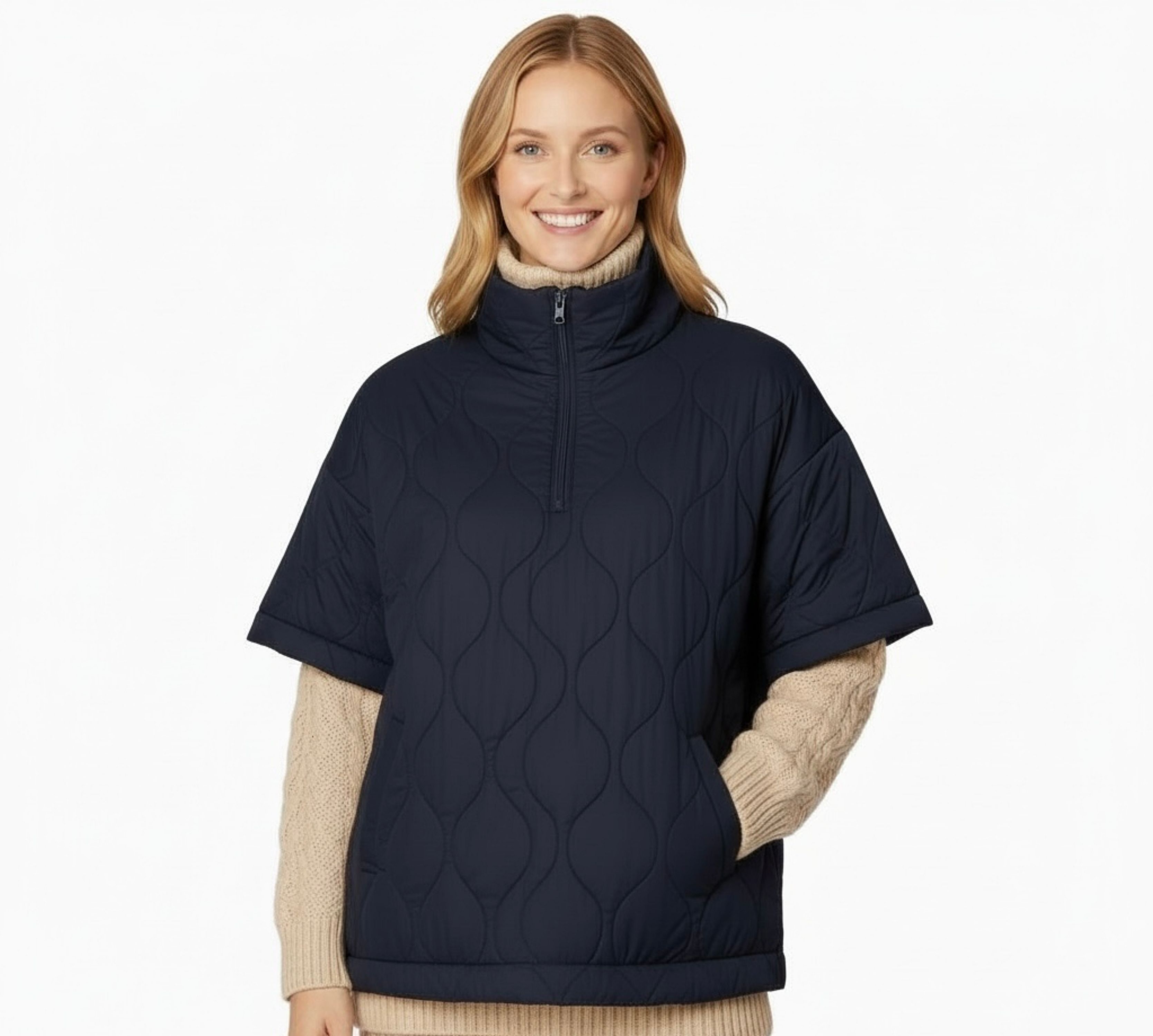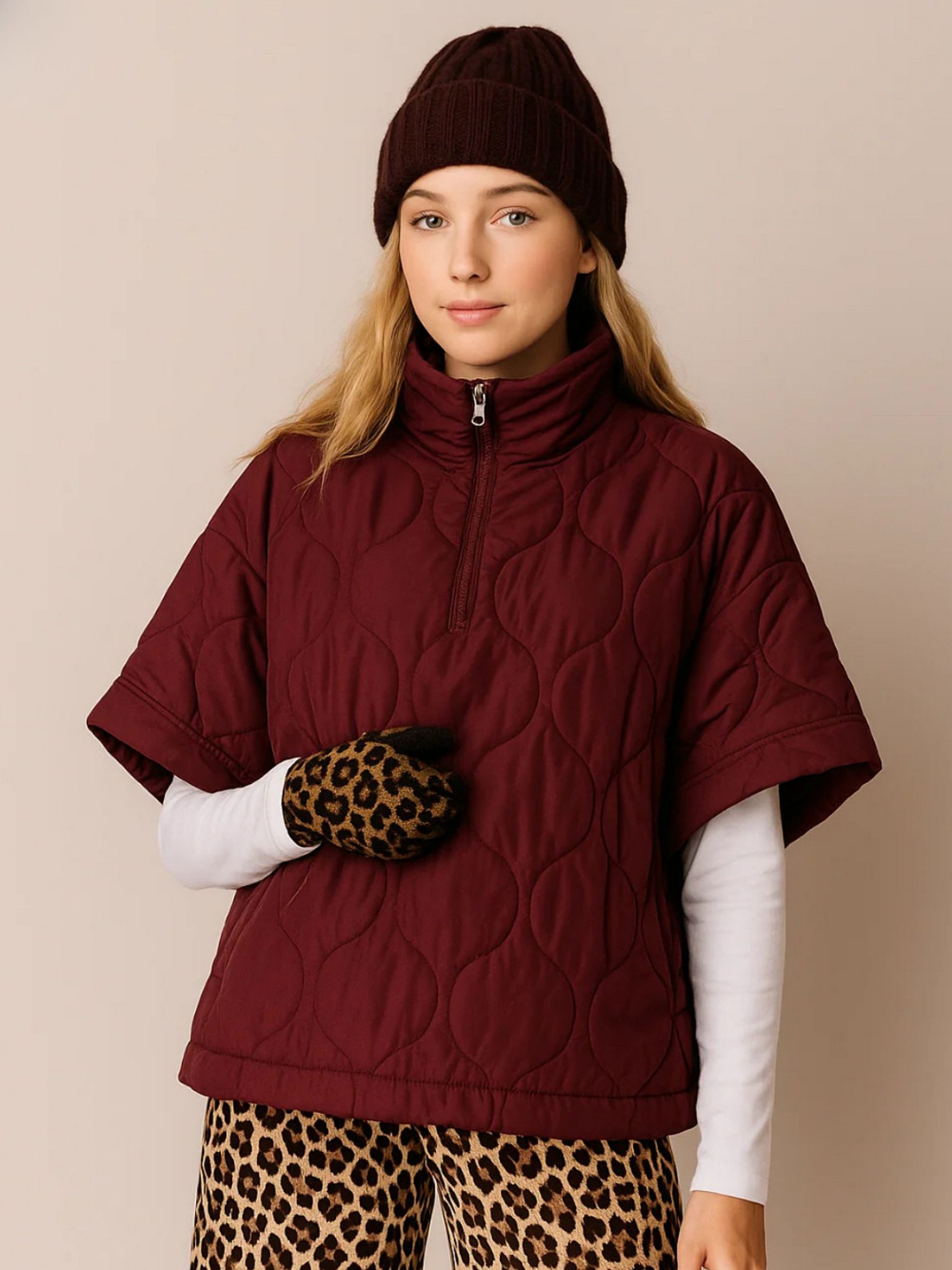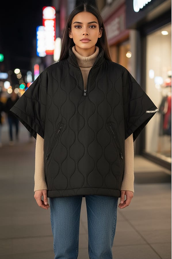 Stay warm and in style with this unique oversized poncho that's designed to keep you cozy in chilly weather. Absolutely stunning design for the season - this stylish and versatile jacket features a convenient half front zipper, with front pockets to keep your essentials close at hand. Available in burgundy and black, this quilted half zip poncho combines fashion and function, making it a must-have addition to your wardrobe. It has a loose and roomy design so you can wear it comfortably with a sweater underneath.