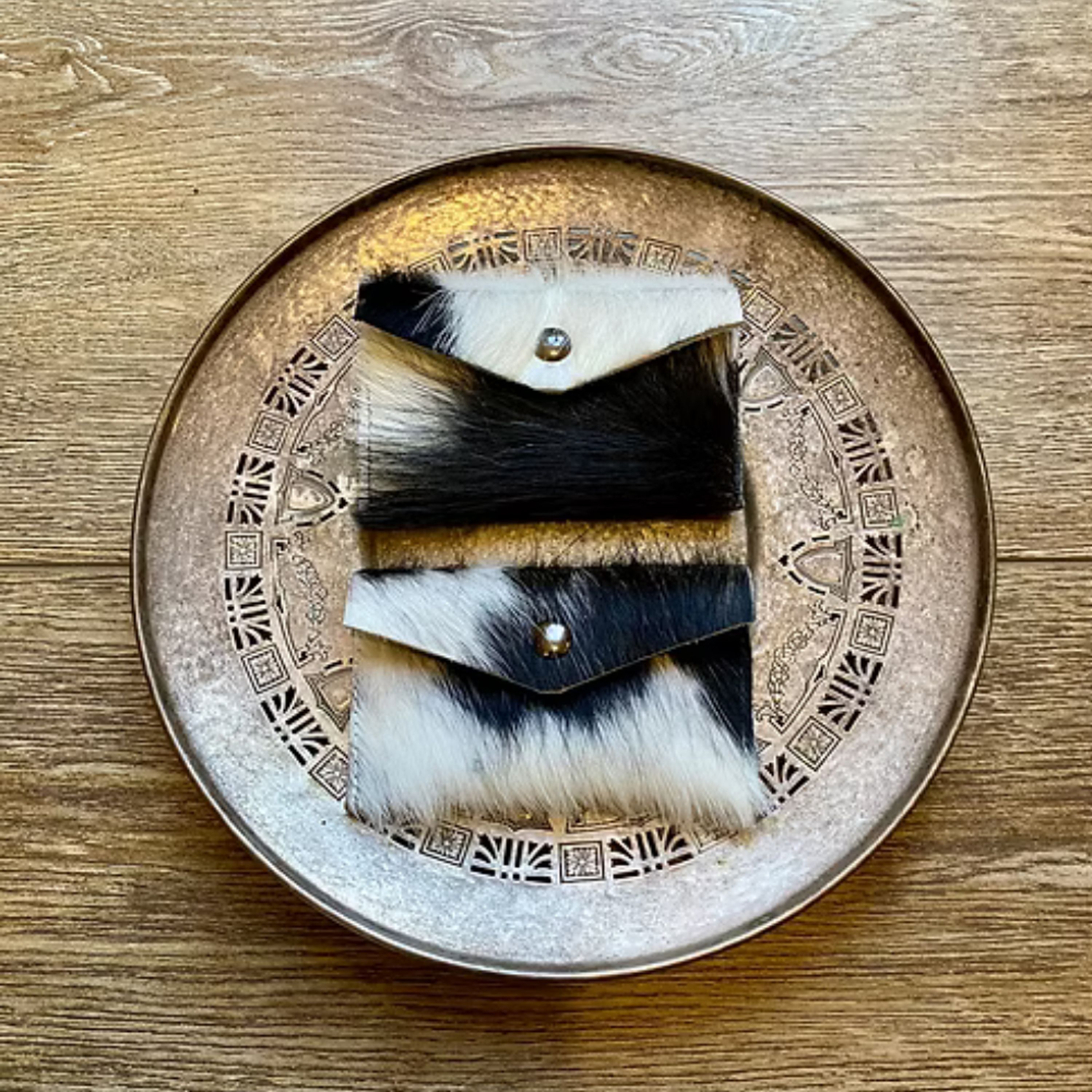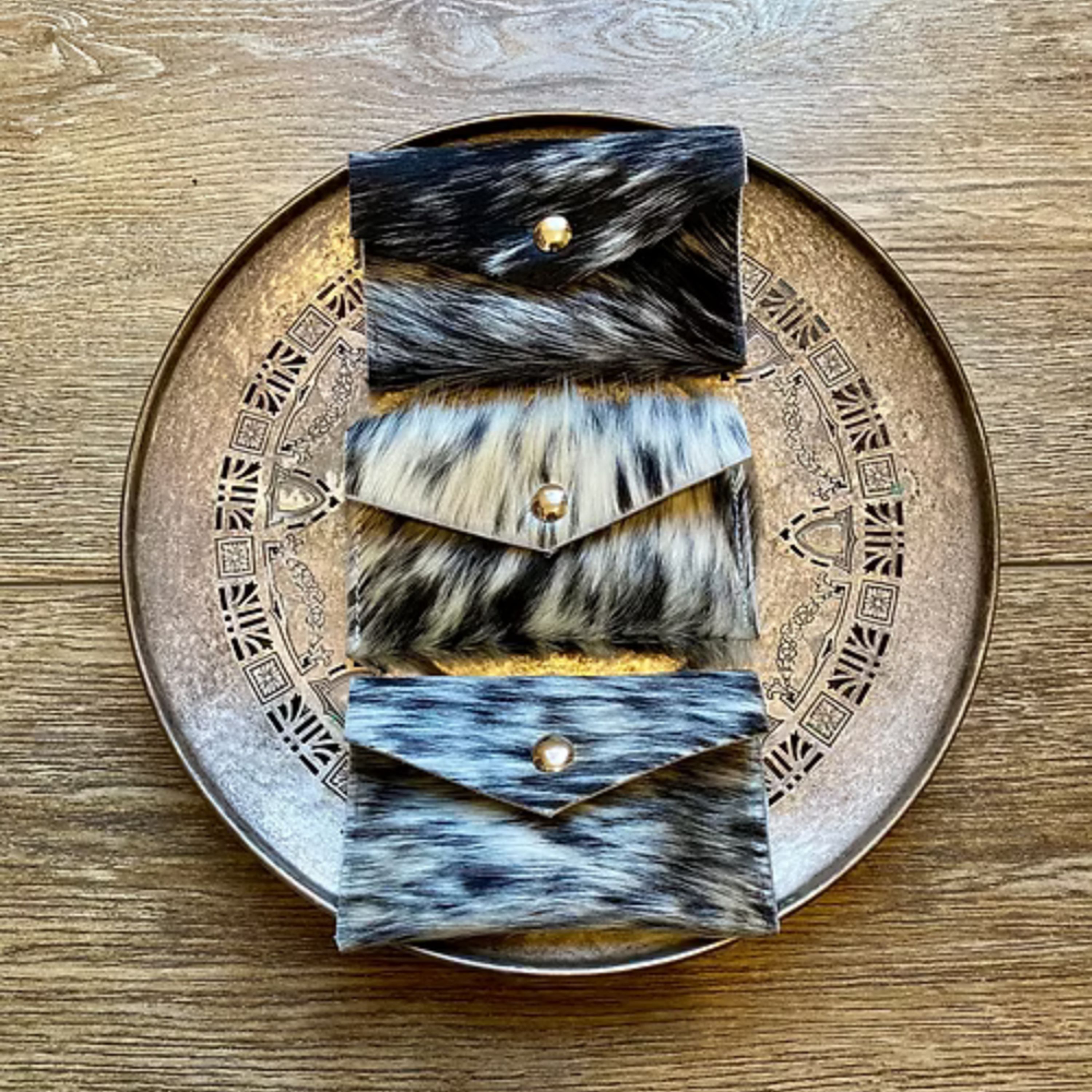 Choose from two sleek and unique black and white patterned hides, or classic solid black. Each case snaps closed with a sturdy magnetic snap for easy opening & closing while keeping the contents secure. Snap color is chosen to complement each wallet, and may be gold, antique bronze, silver, or black. If you prefer to choose, send a message with your order.