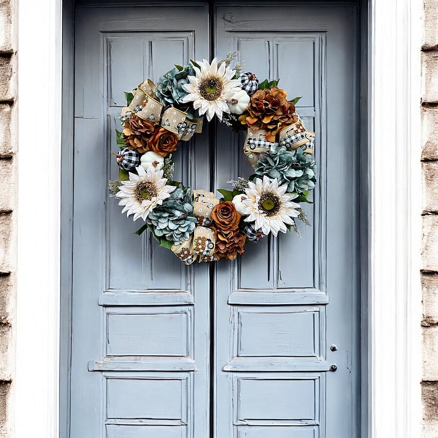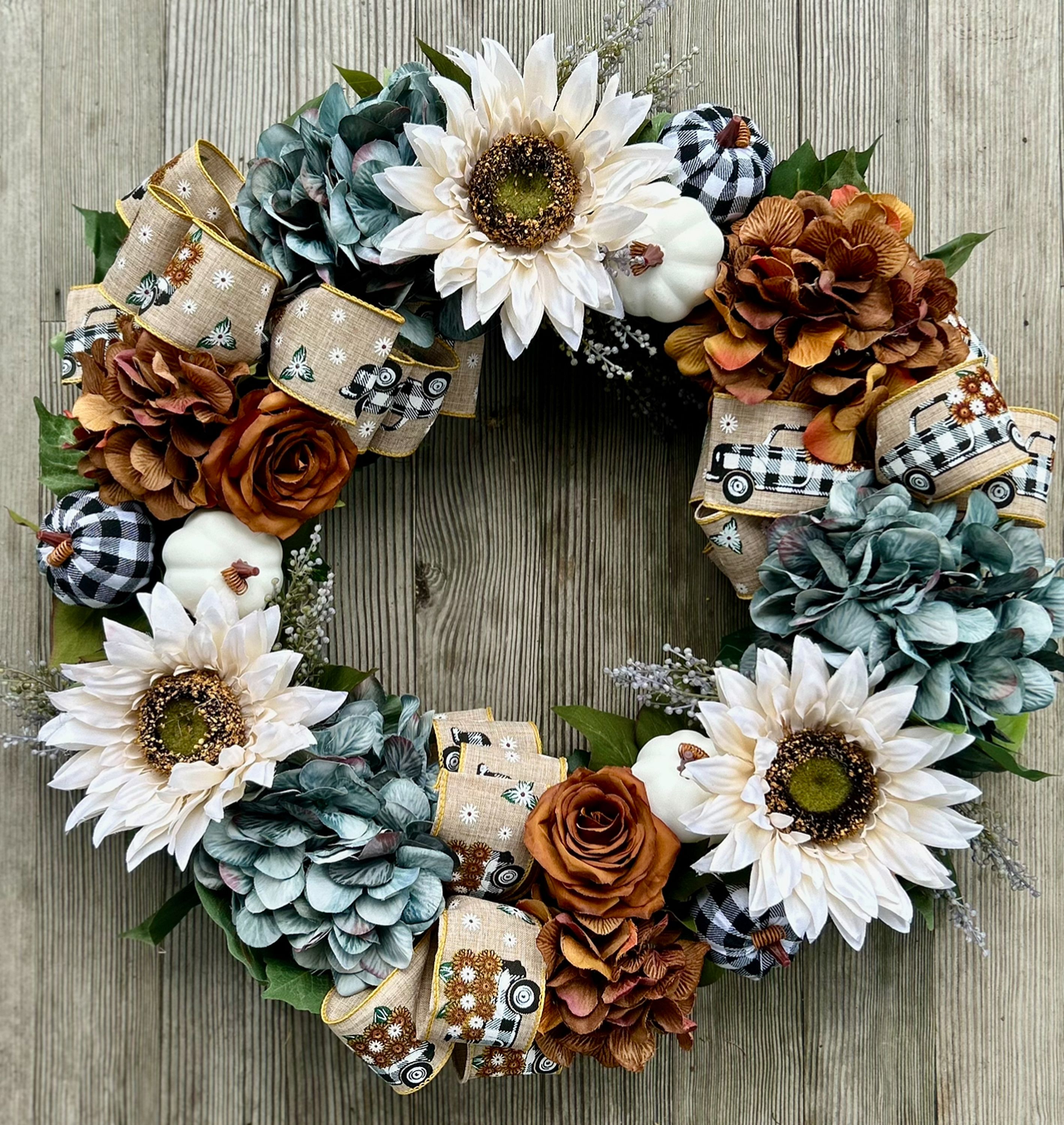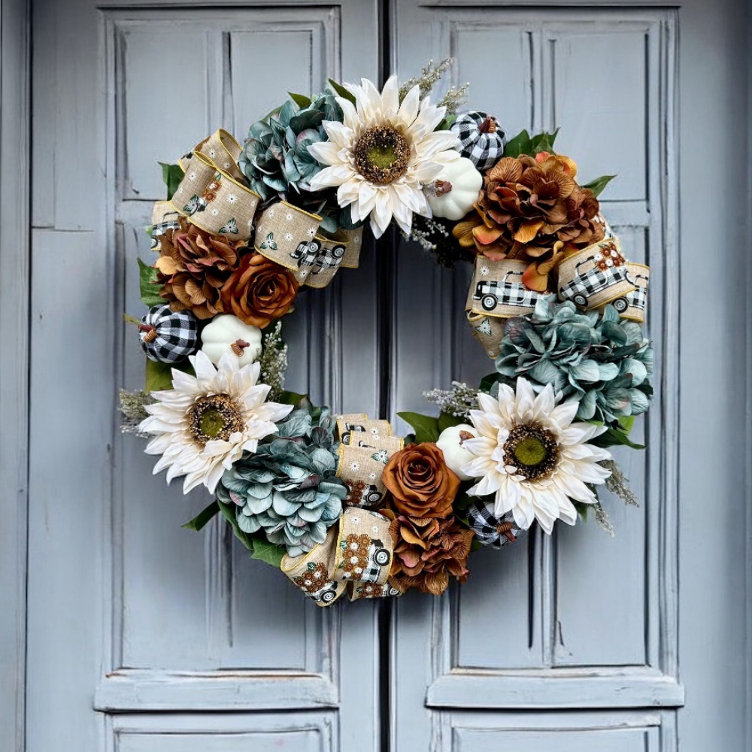 Stunning in blue, brown. and white, this autumn wreath is a standout. Designed and created with hydrangeas, roses, white sunflowers and foliage this is a unique take on an autumn wreath. Finished with 3 linen and gingham wired bows this wreath will give you great street appeal when dressed on your front door.