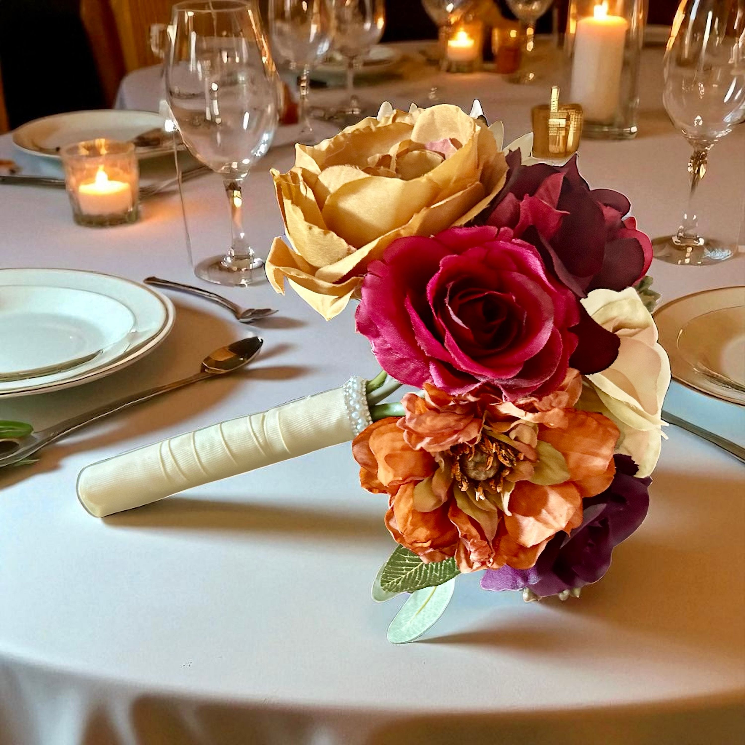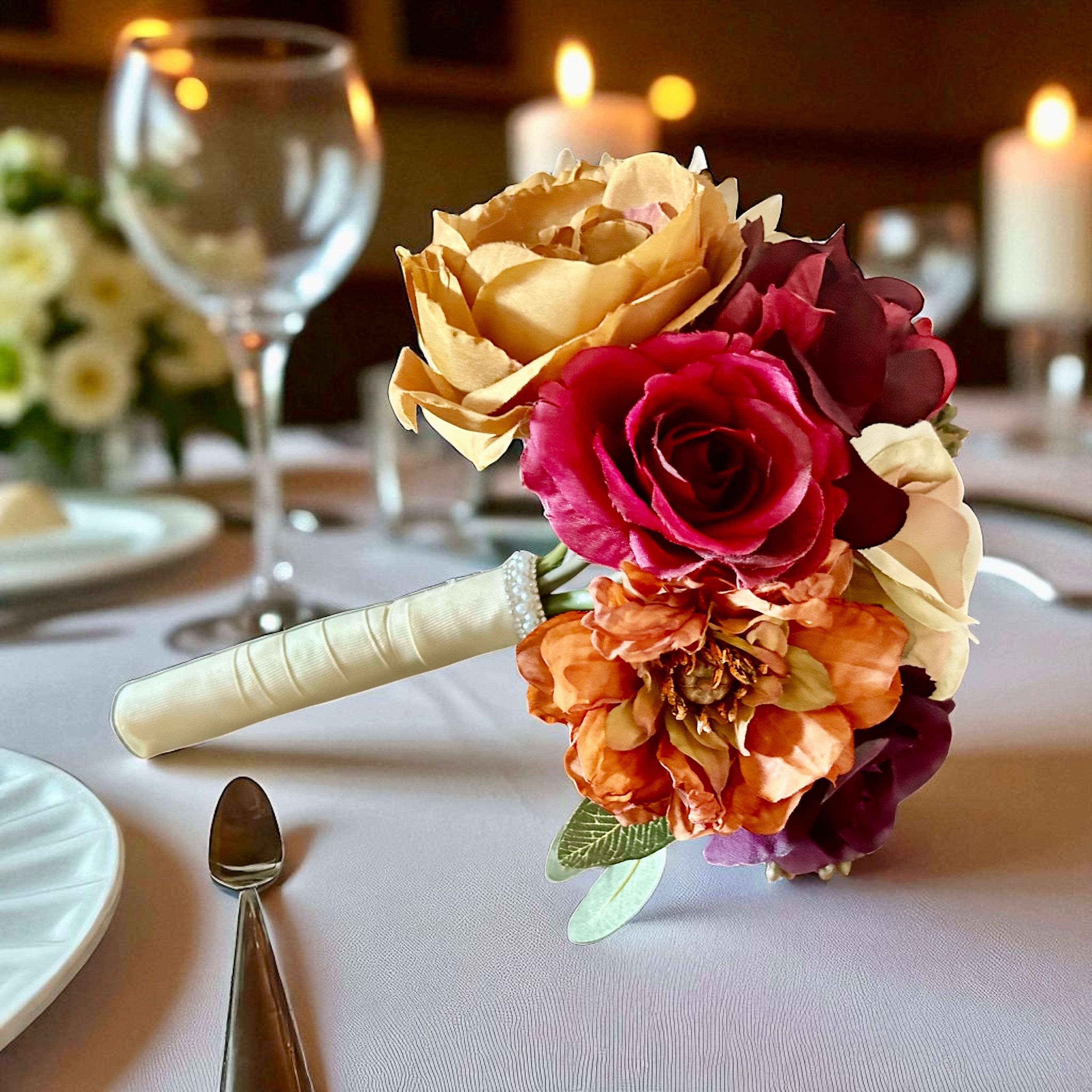 Exquisite silk floral bouquet suitable for a fall/winter special occasion, or destination wedding. It is a mixed bouquet of the highest quality silk flowers in rich tones of gold, burgundy, plum and ivory gross grain ribbon with an ivory pearl and rhinestone trim at the top. It is perfect for photographs and makes a wonderful keepsake.