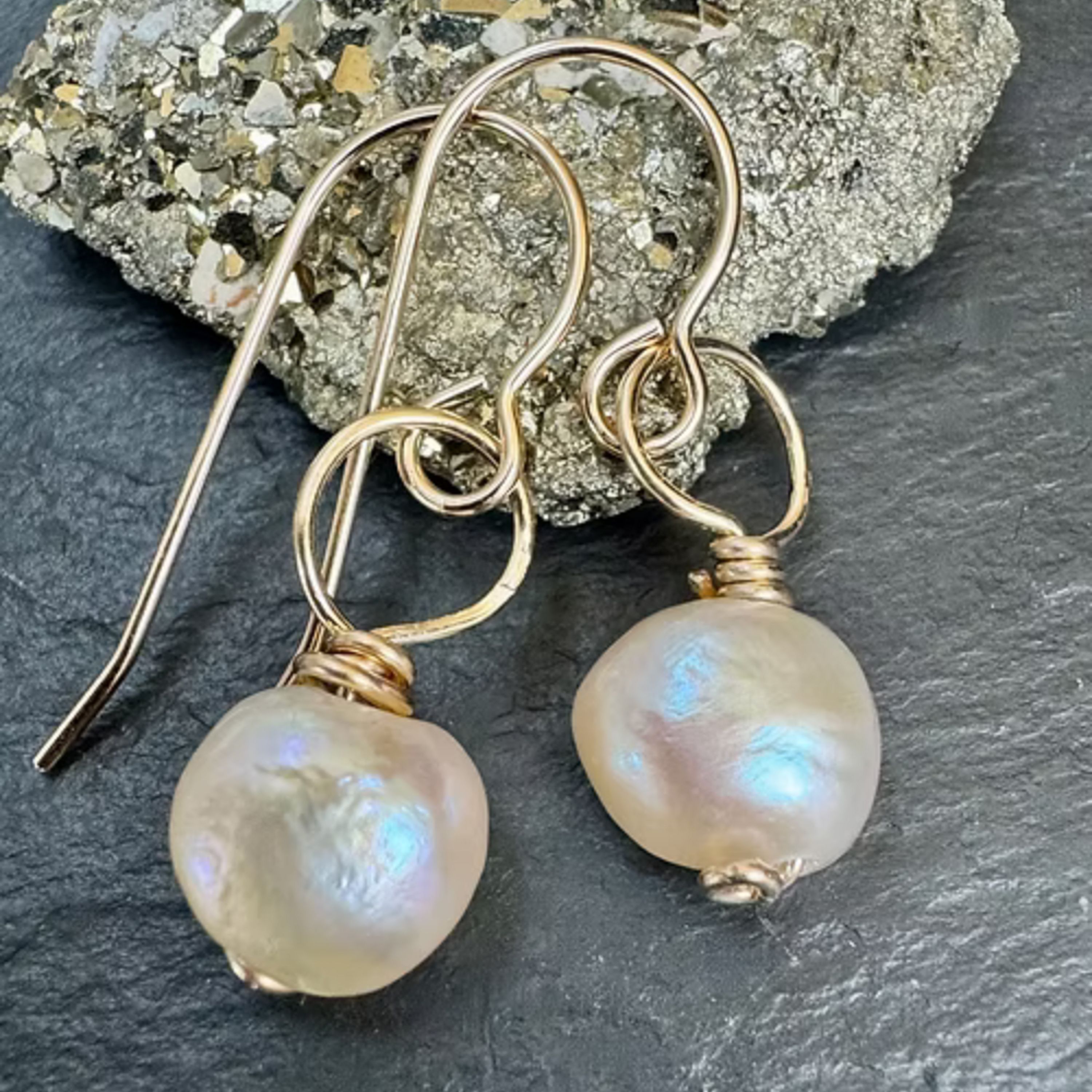 A modern take on the classic pearl earrings that never go out of style. These are the prettiest freshwater pearls with the most subtle hint of irridescent peachy blush pink. Each pearl is unique, perfect in it's irregularity, shaped by the elements that created it. In 14kt gold filled or sterling silver.