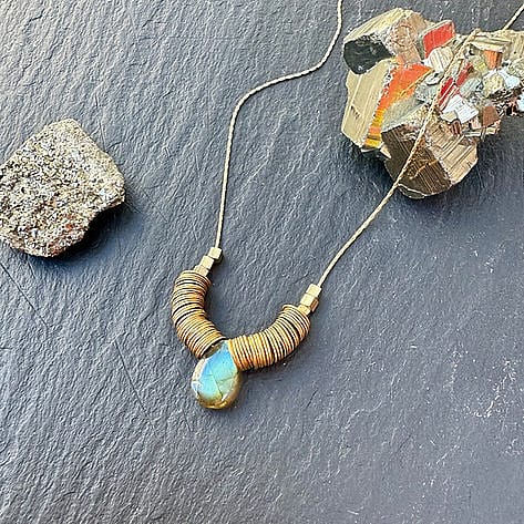 Channel your inner goddess in this slinky necklace. A single luminous labradorite teardrop stone is framed with thin brass circle beads. The 14kt gold filled snake chain is strong and thin, and is adjustable from 16-18".