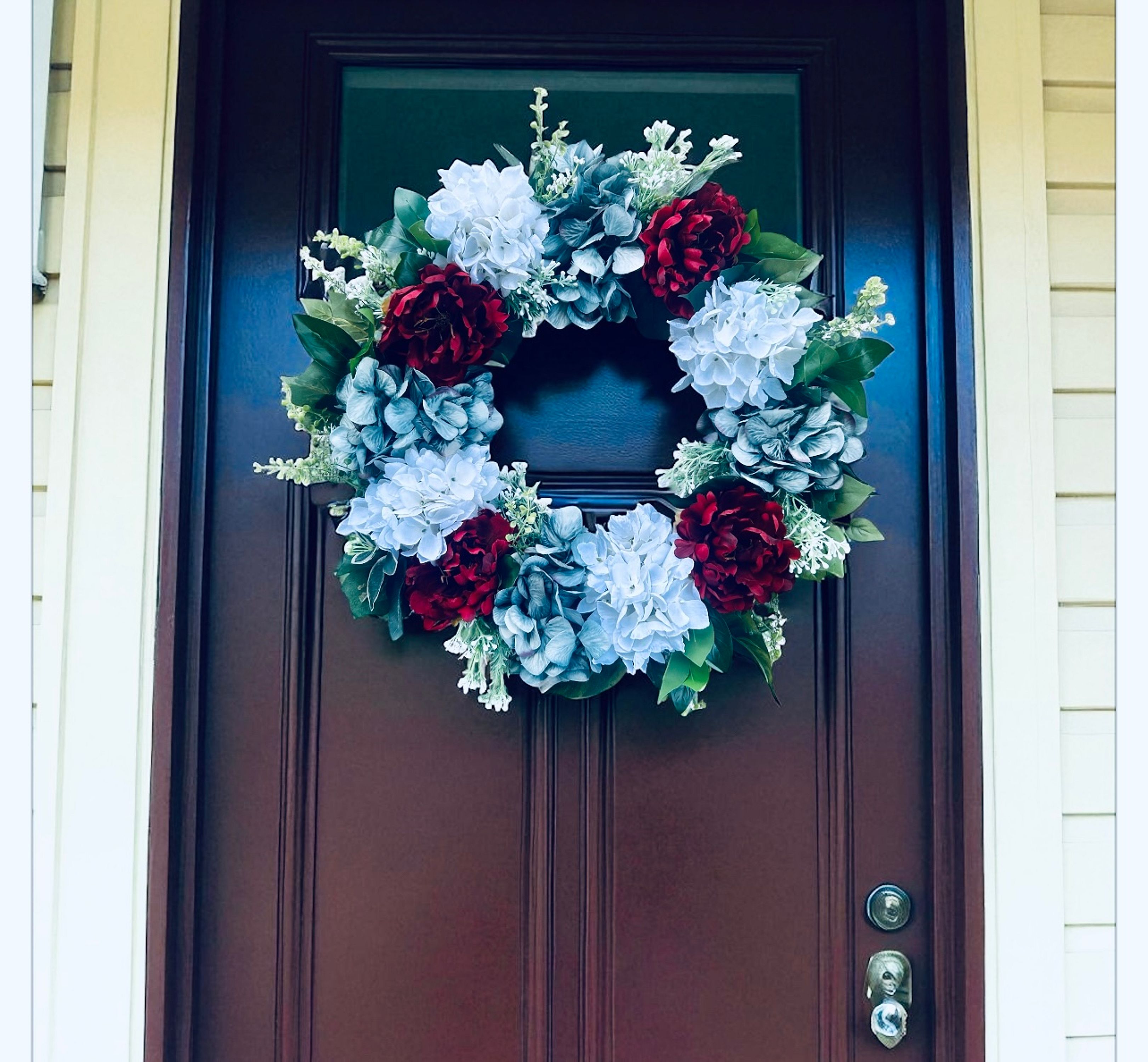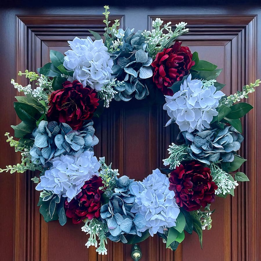 Dress your door with a beautiful high quality Americana wreath. It is made with red white and blue dahlias, hydrangeas, floral liege and berries. It is finished with 3 themed bows.