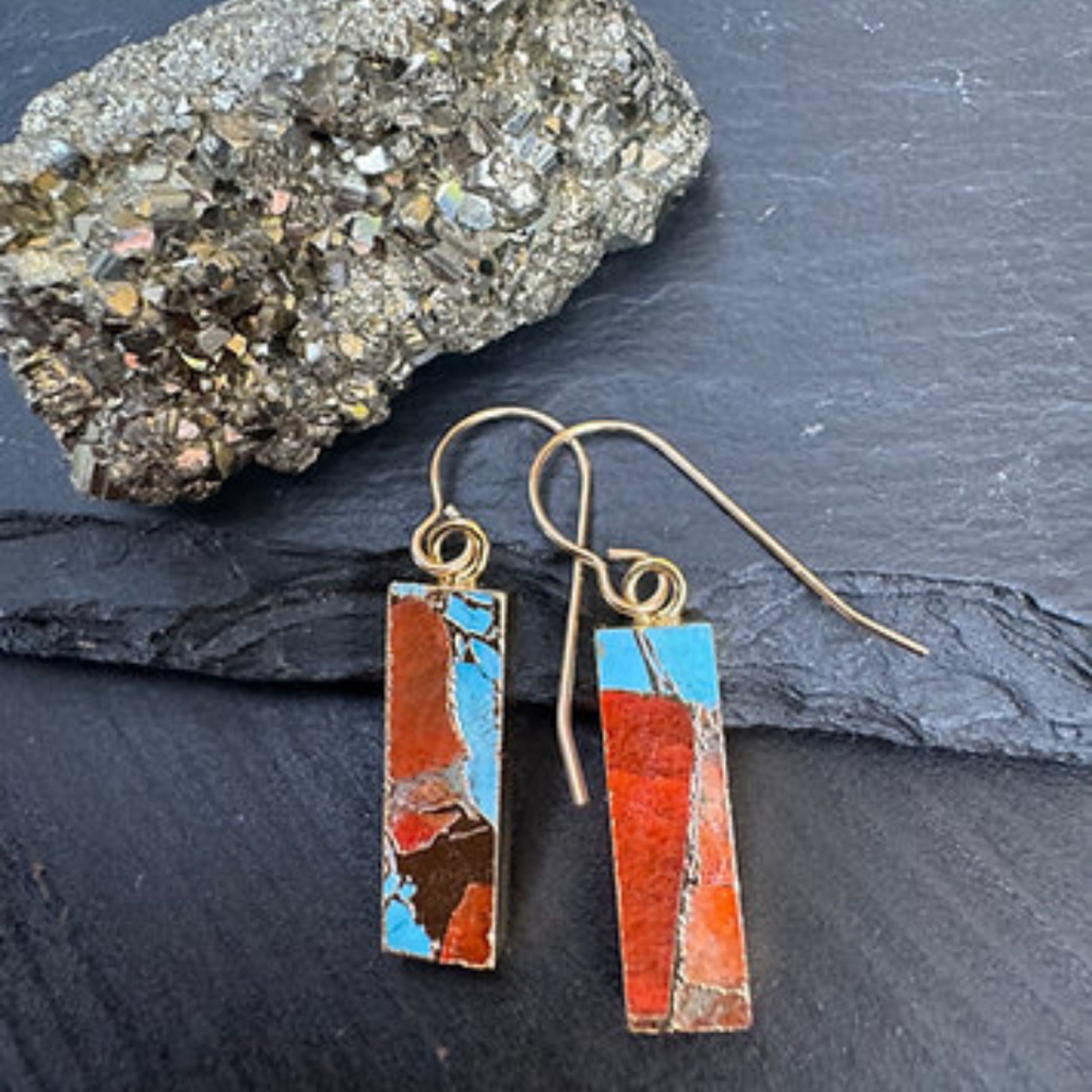 Show your true colors! These vibrant earrings showcase the beauty of natural stone, each one a unique mosaic of vibrant red-orange carnelian and turquoise with rivers of copper running through. Rectangle cut stones are edged with gold plate and hung on 14kt gold filled hooks for a shine that lasts and doesn't irritate skin.