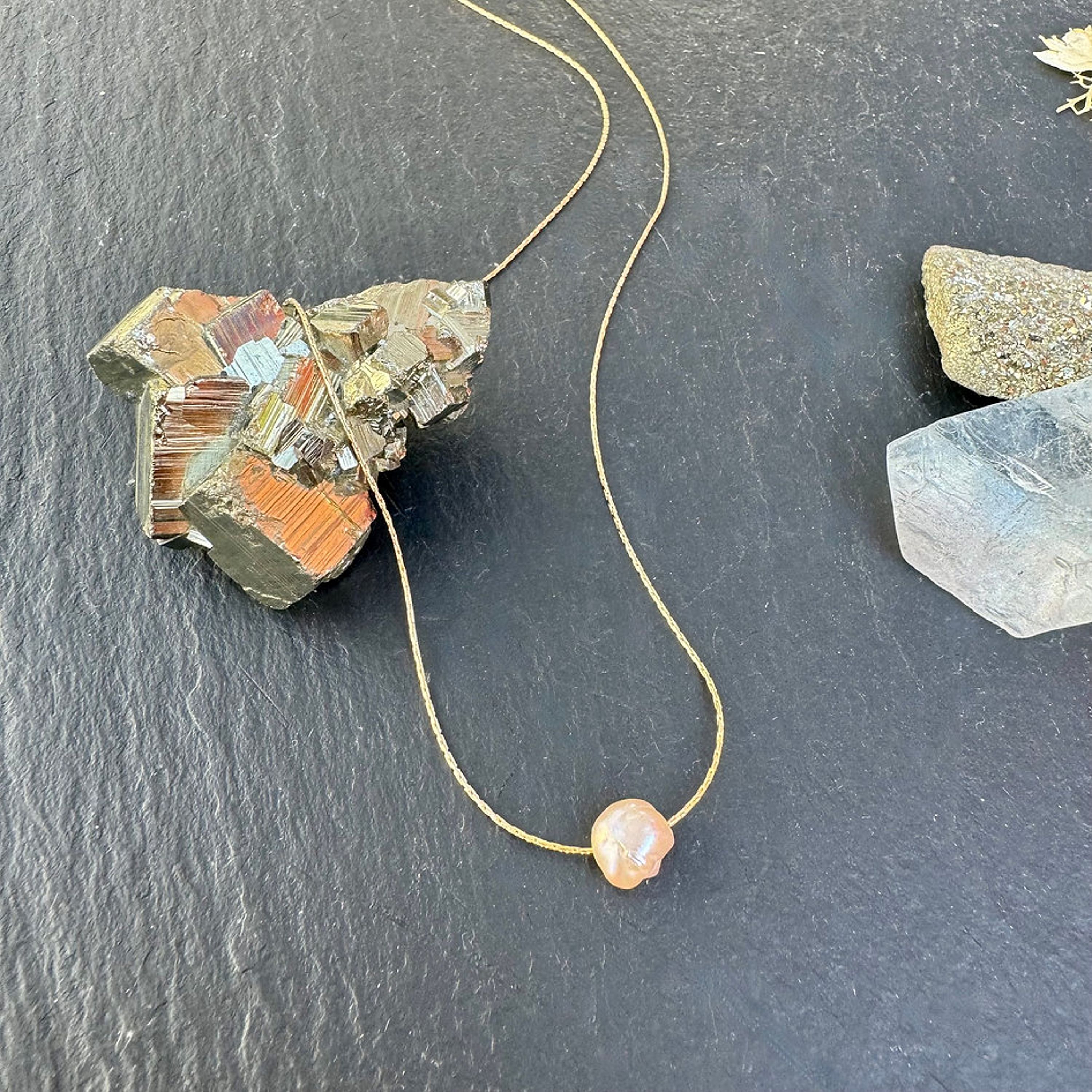 Simple elegance. A single freshwater pearl in the subtlest shade of peachy blush pink, perfect in it's irregularites, reminiscent of the ebb and flow of the ocean. The thin but strong 14kt gold filled snake chain drapes so beautifully over the collarbones. Adjustable length from 16-18".
