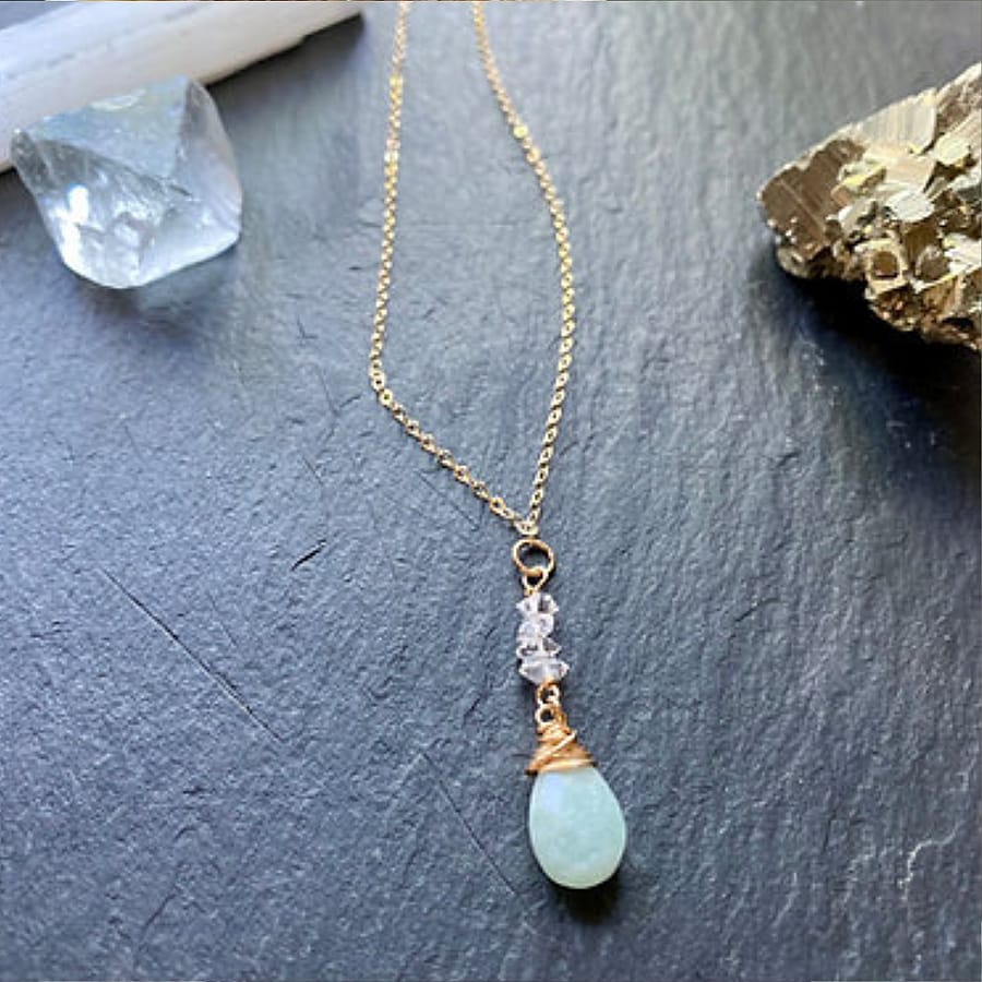 Delicate and strong at the same time, amazonite brings a calming, balancing energy. This beautiful faceted amazonite teardrop is paired with 4 tiny, perfect herkimer diamonds with double terminated points. Choose from 14kt gold fill or sterling silver. Chain is 18" long and total drop with pendant is 10". Can be shortened or lengthened upon request.