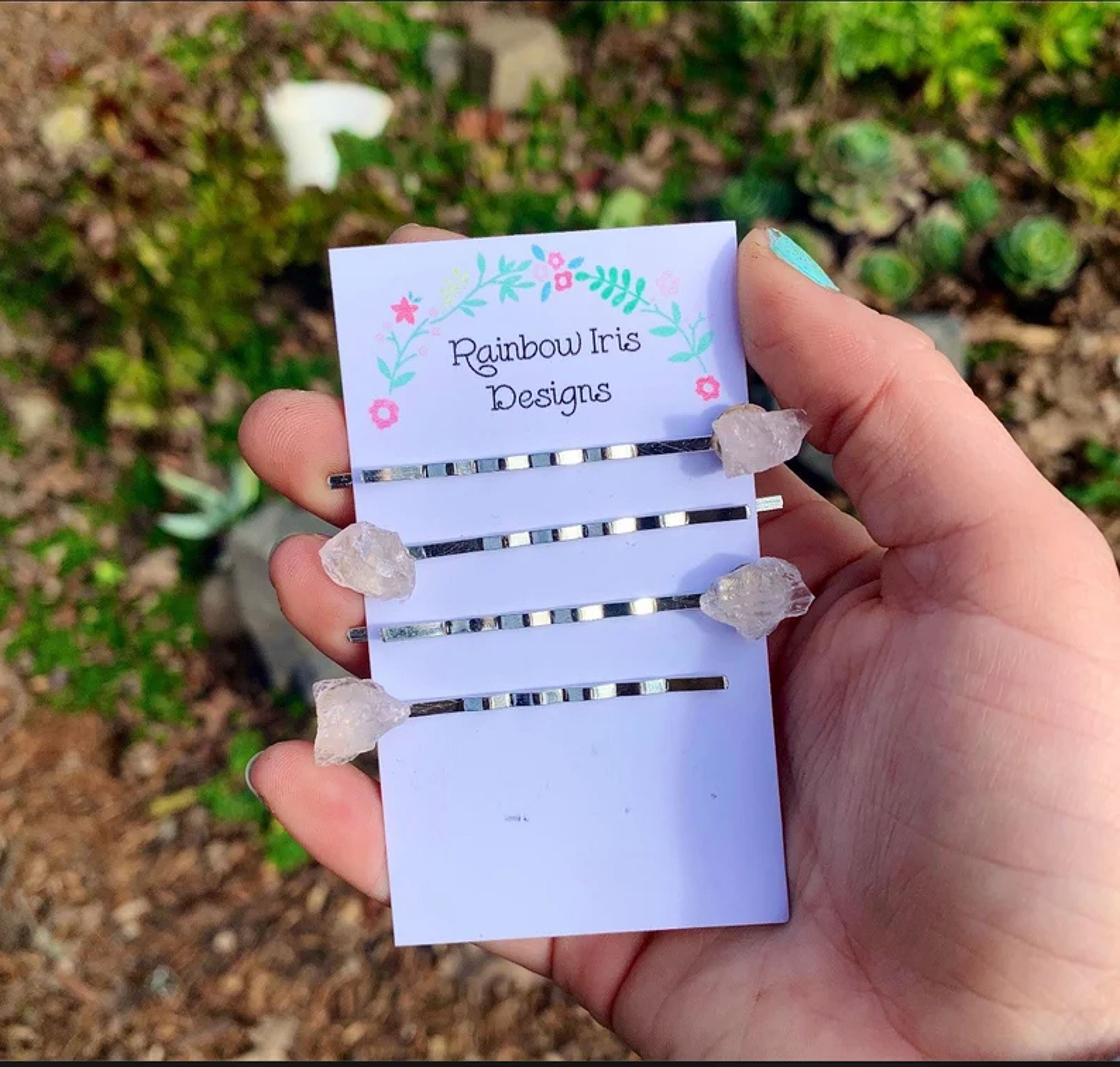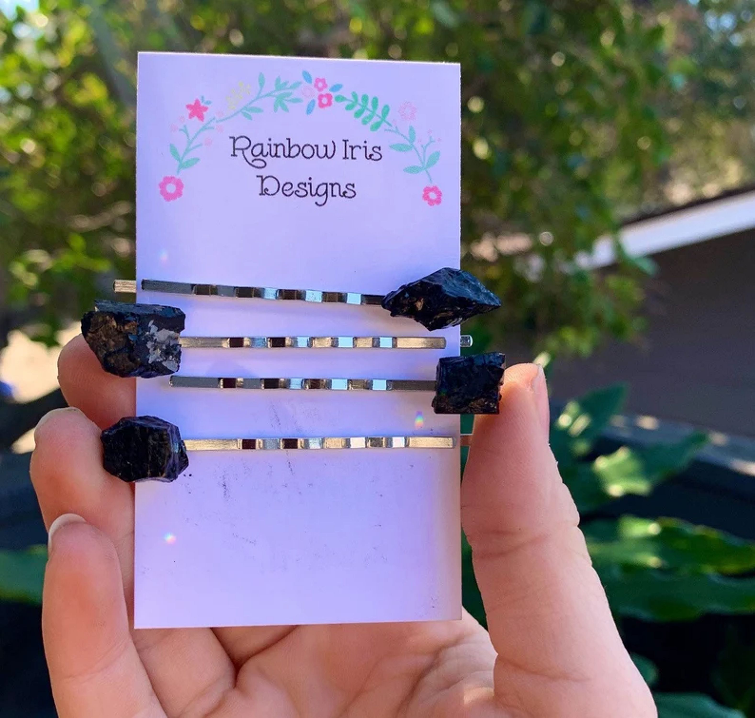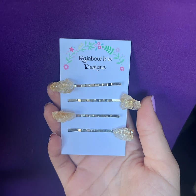 Each hairpin is carefully crafted with a silver colored alloy bobby pin and strong industrial strength adhesive. This is for either a 2-pack or 4-pack crystal hair pin set.