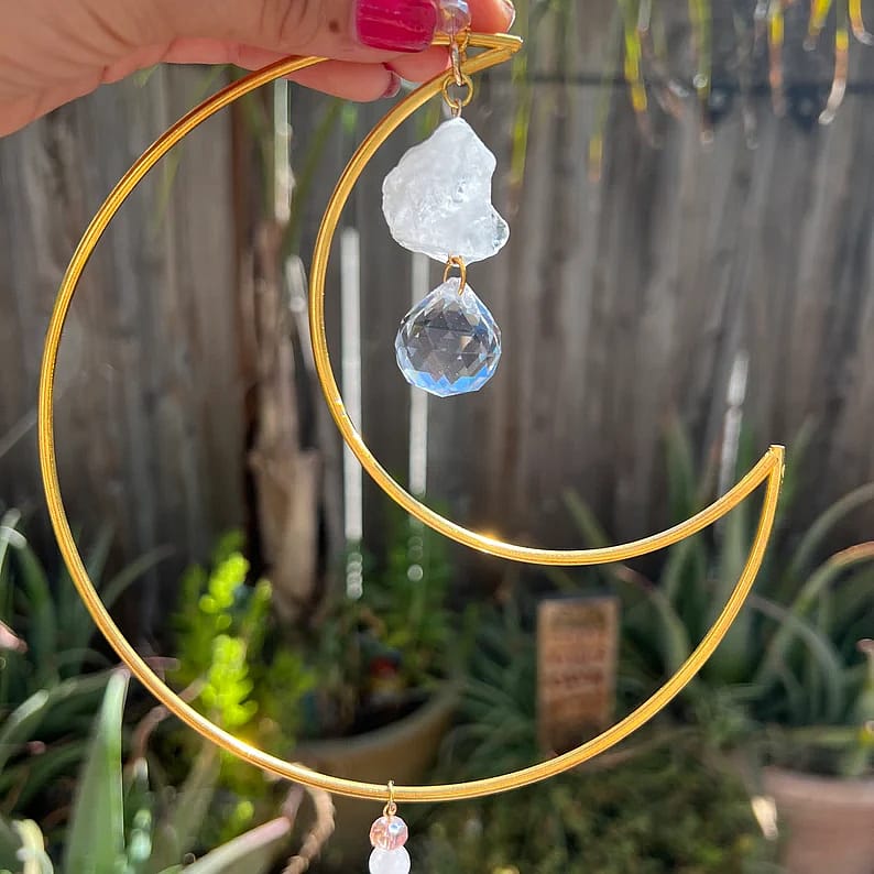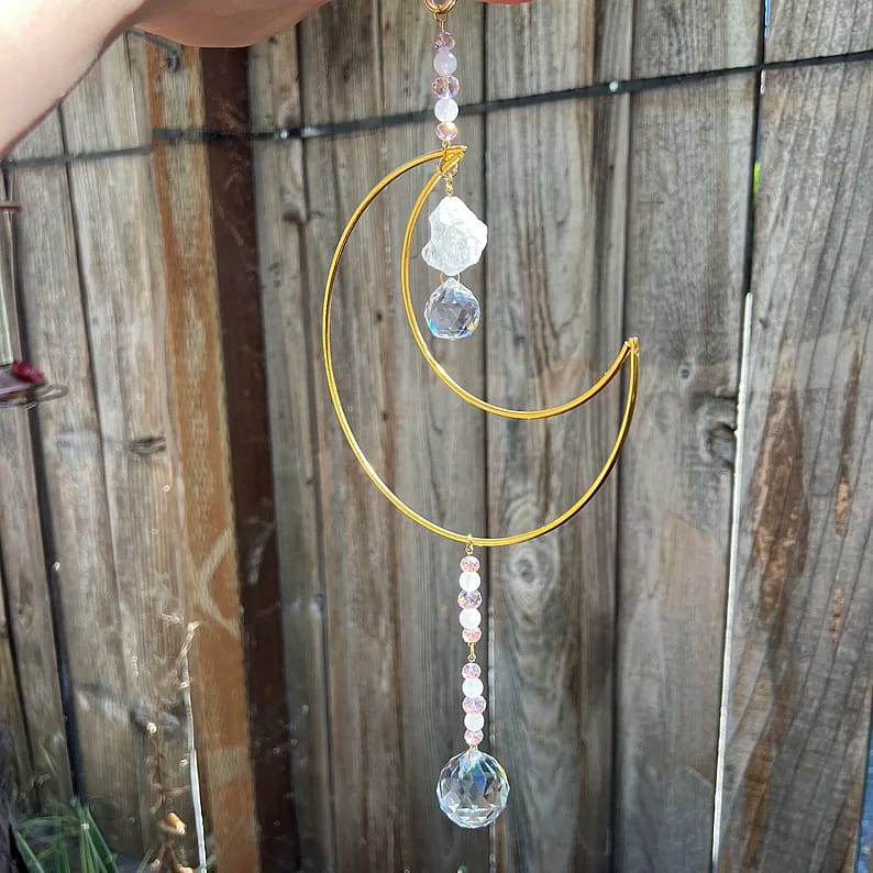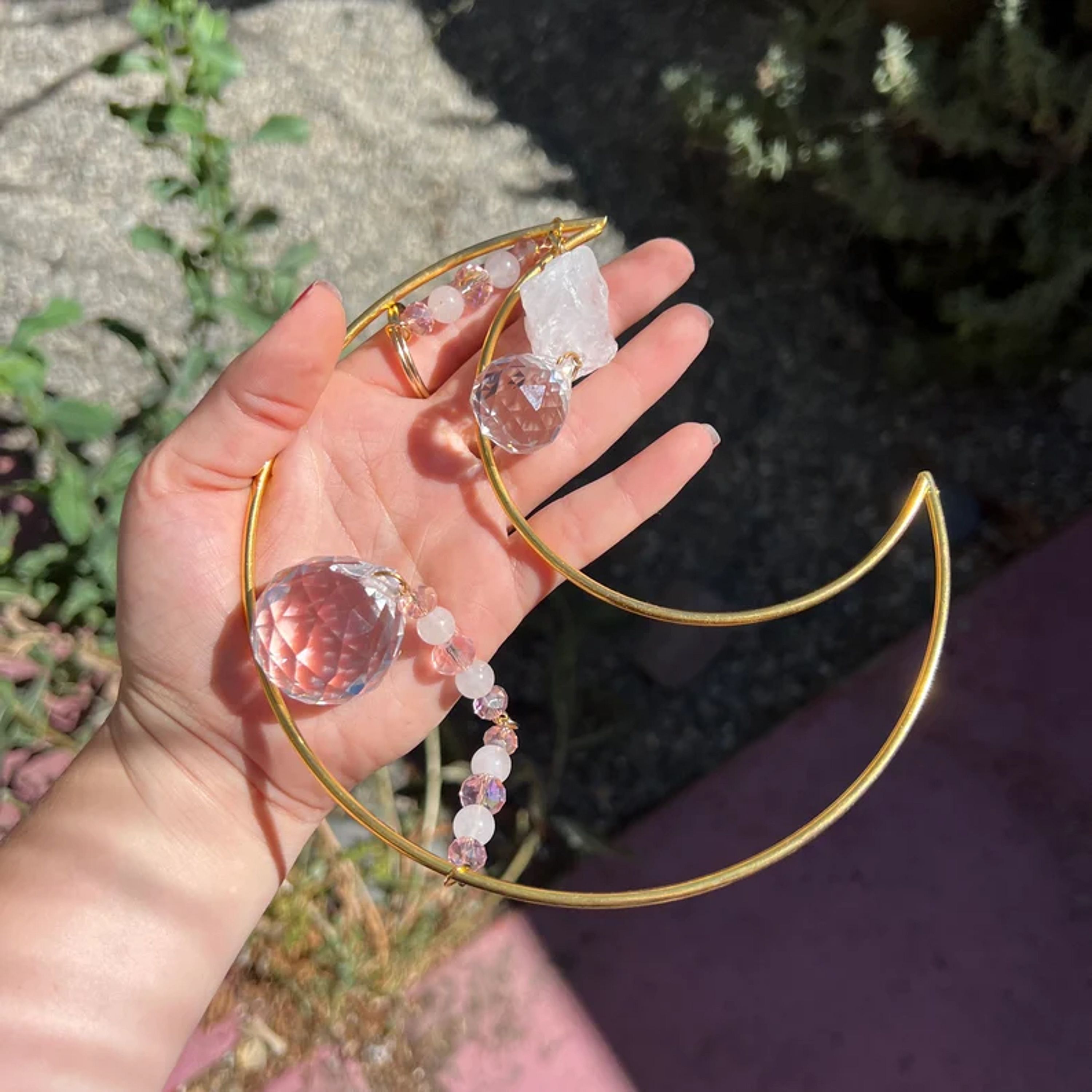 This handmade crescent moon suncatcher is made with light pink rose quartz and glass beads, a large gold crescent moon and a 20mm and 30mm clear glass prism.