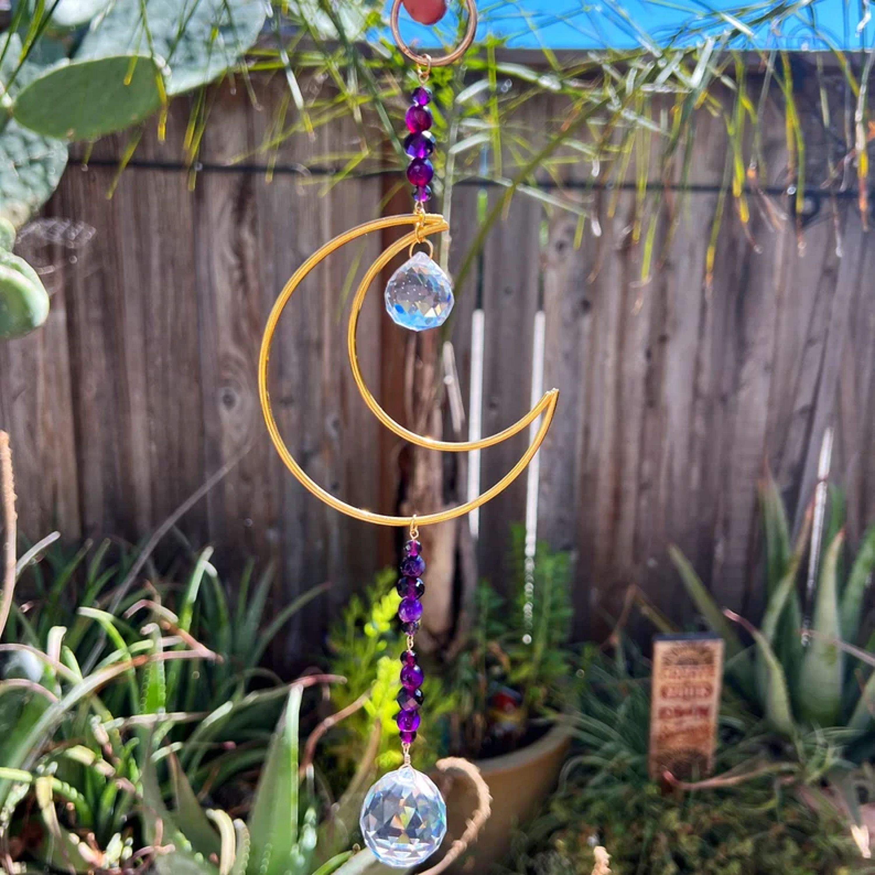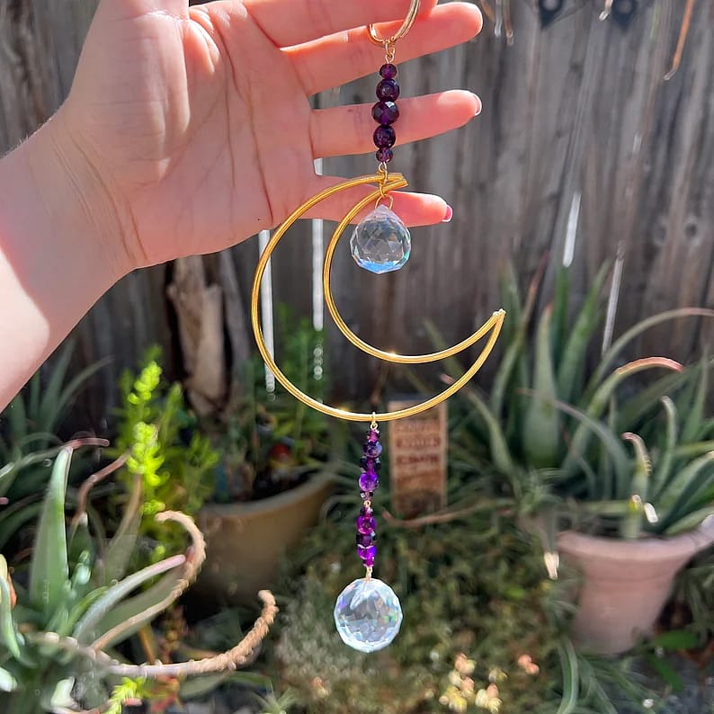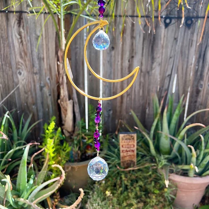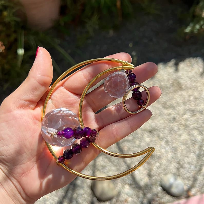 This handmade crescent moon suncatcher is made with purple agate and glass beads, a gold crescent moon and a 20mm and 30mm clear glass prism.