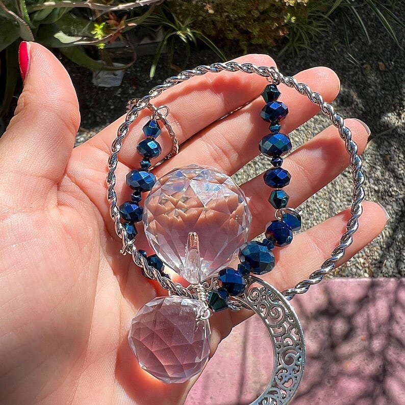 This handmade suncatcher is made with glass or stone beads, a silver bangle and charm, and a 20mm and 30mm clear glass prism.