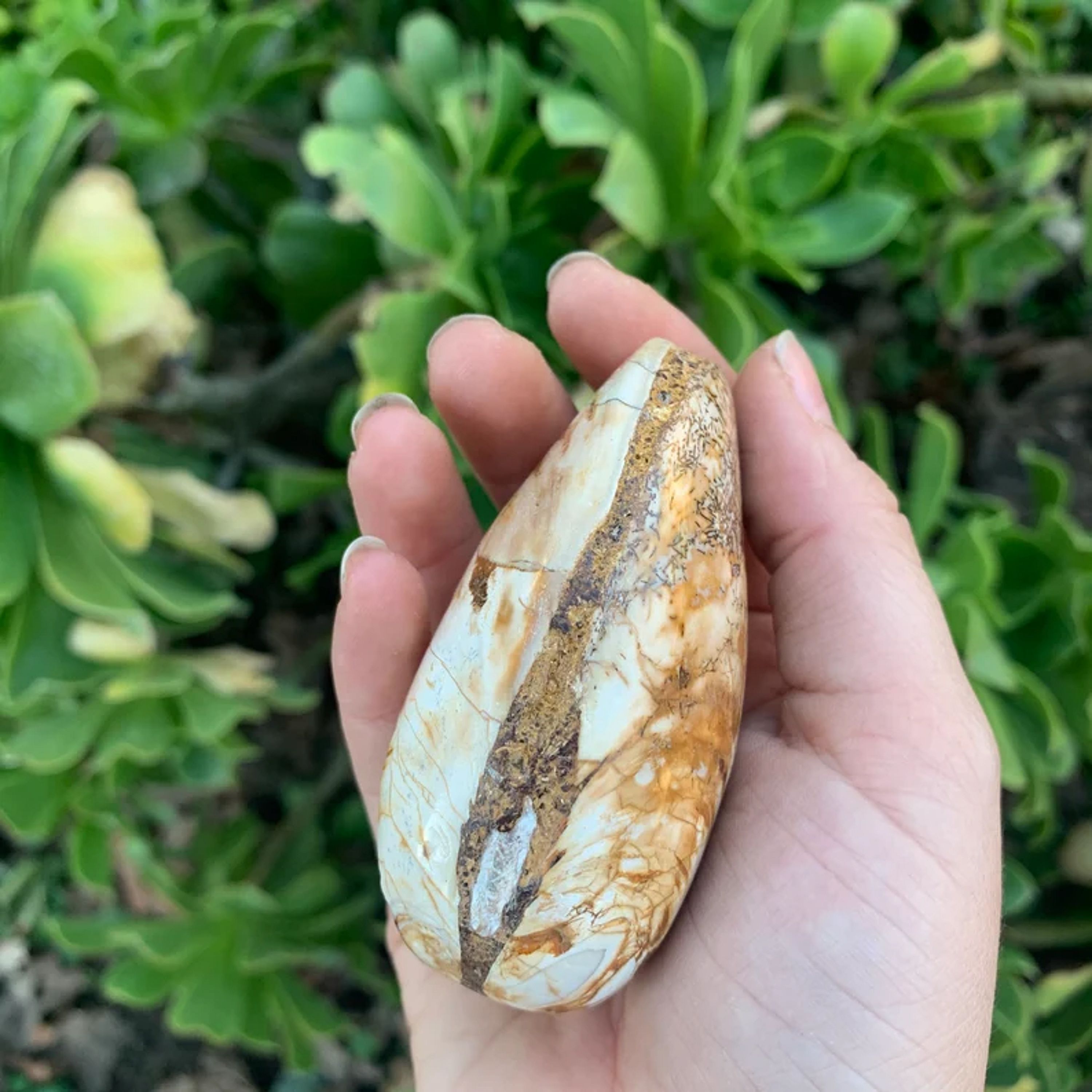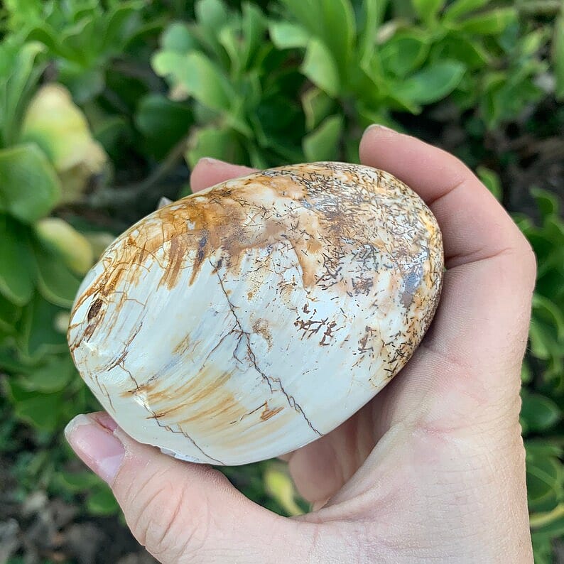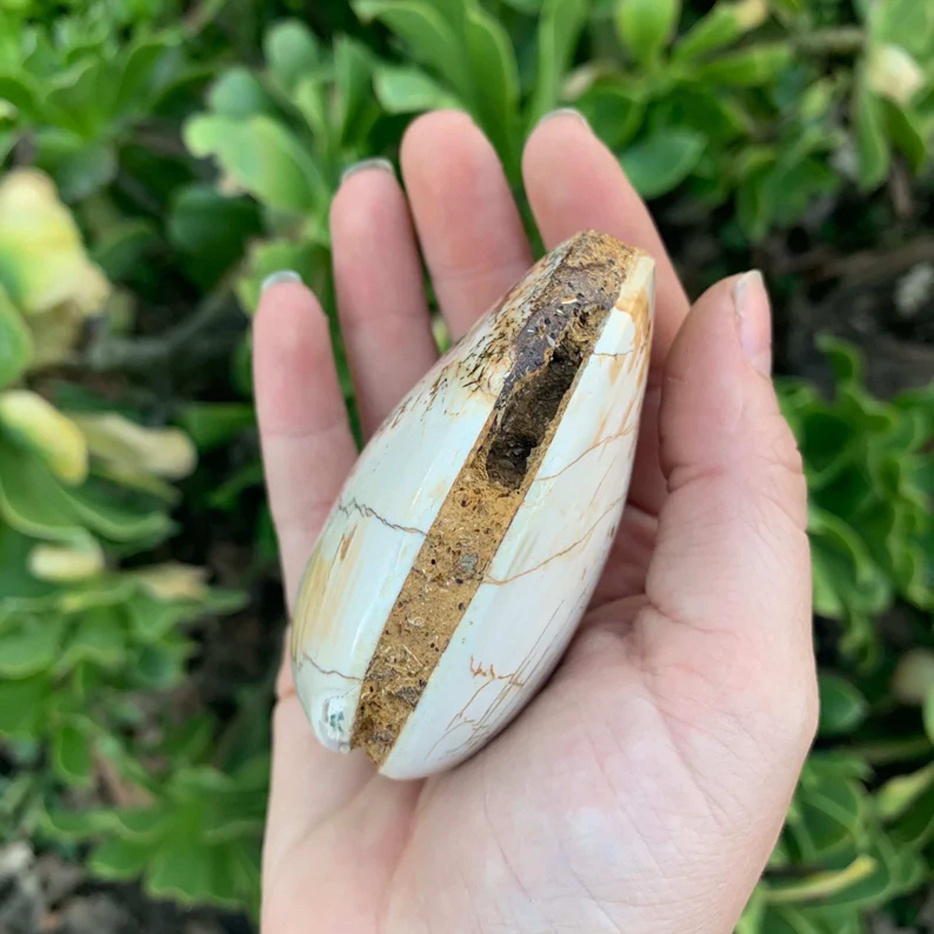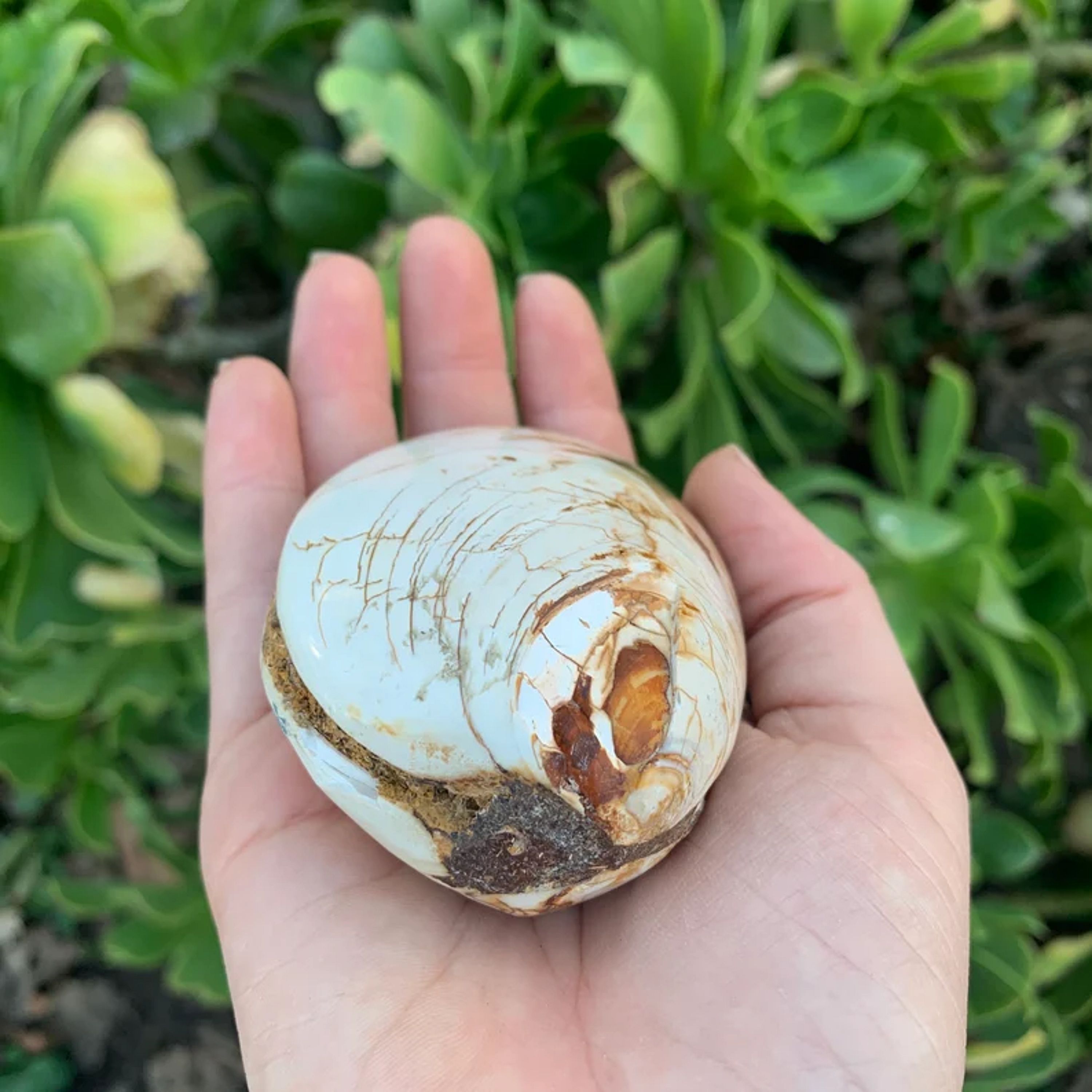Beautiful Polished Clam Shell Fossil Bivalve. You will receive the same fossilized clam shell photographed here.