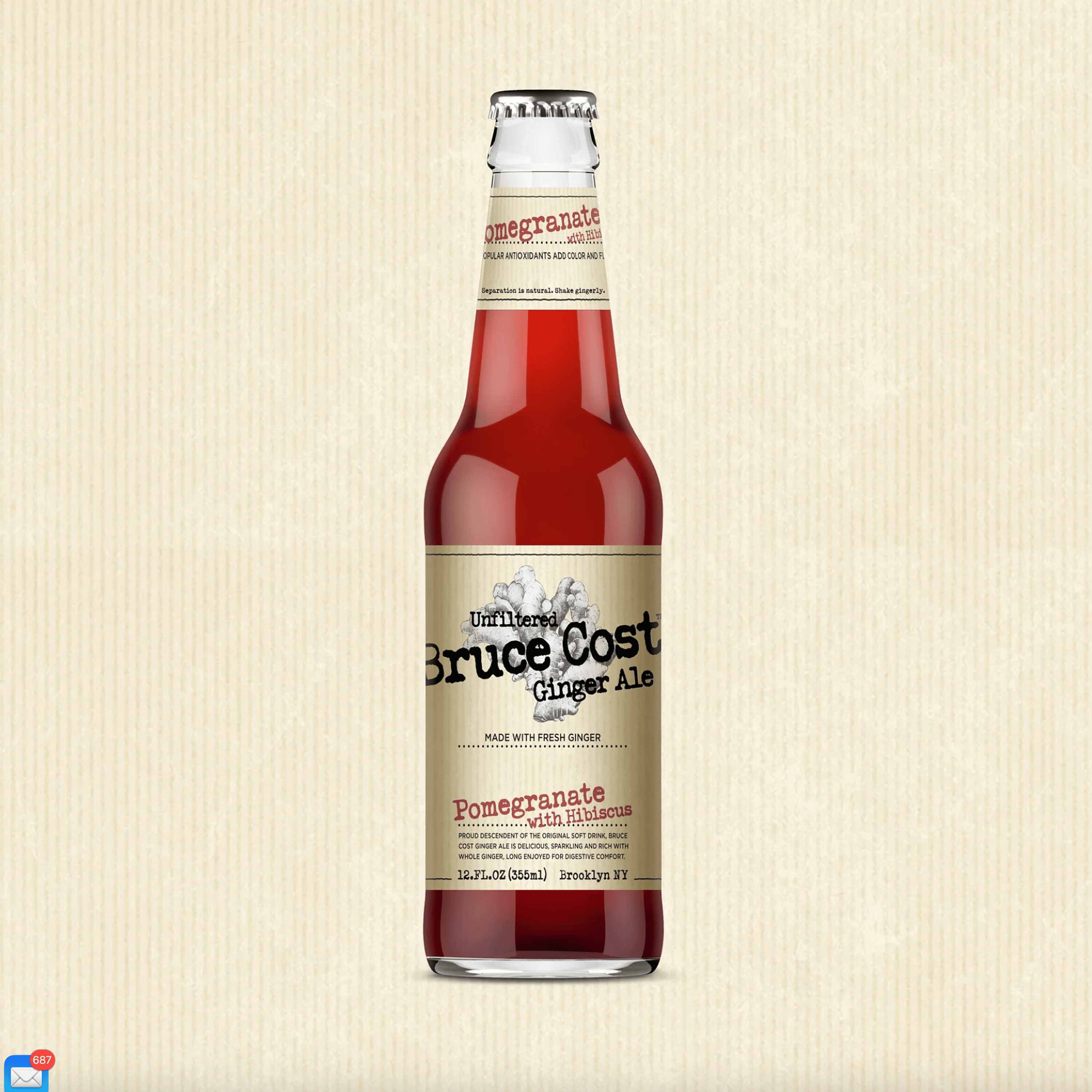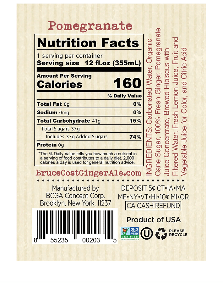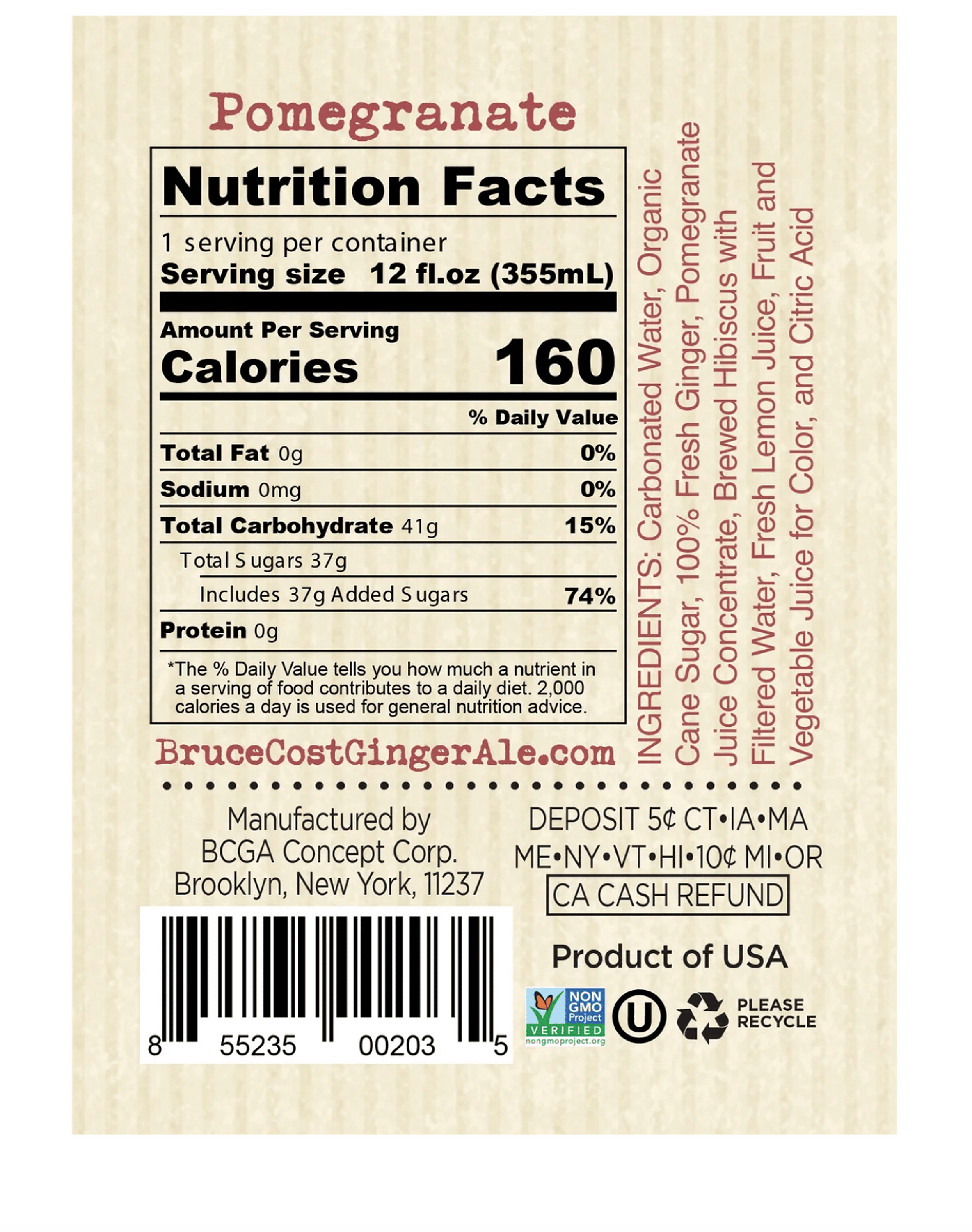 Ingredients: Carbonated Water, Organic Cane Sugar, 100% Fresh Ginger, Pomegranate Juice Concentrate, Brewed Hibiscus with Filtered Water, Fresh Lemon Juice, Fruit and Vegetable Juice for Color, and Citric Acid