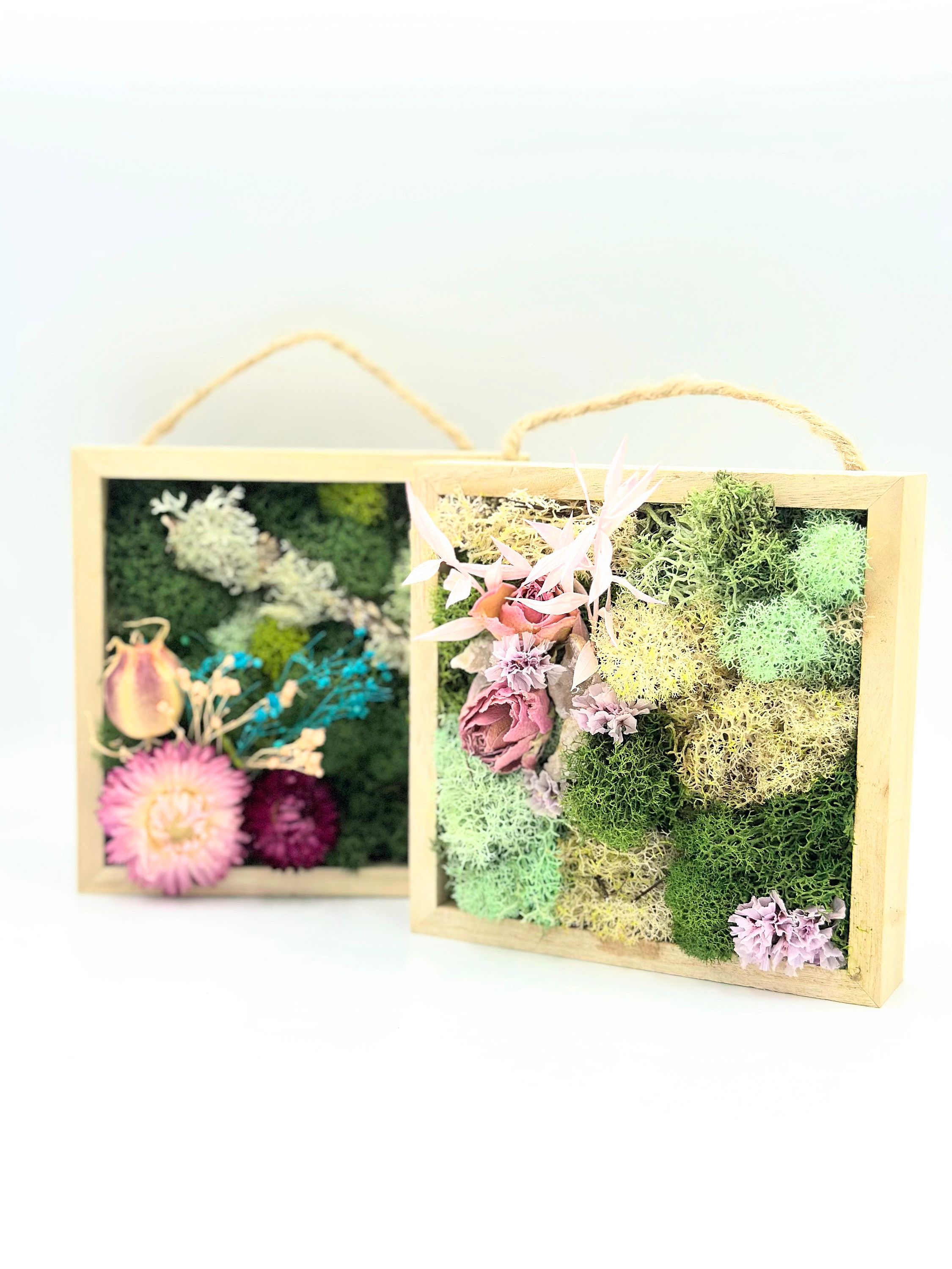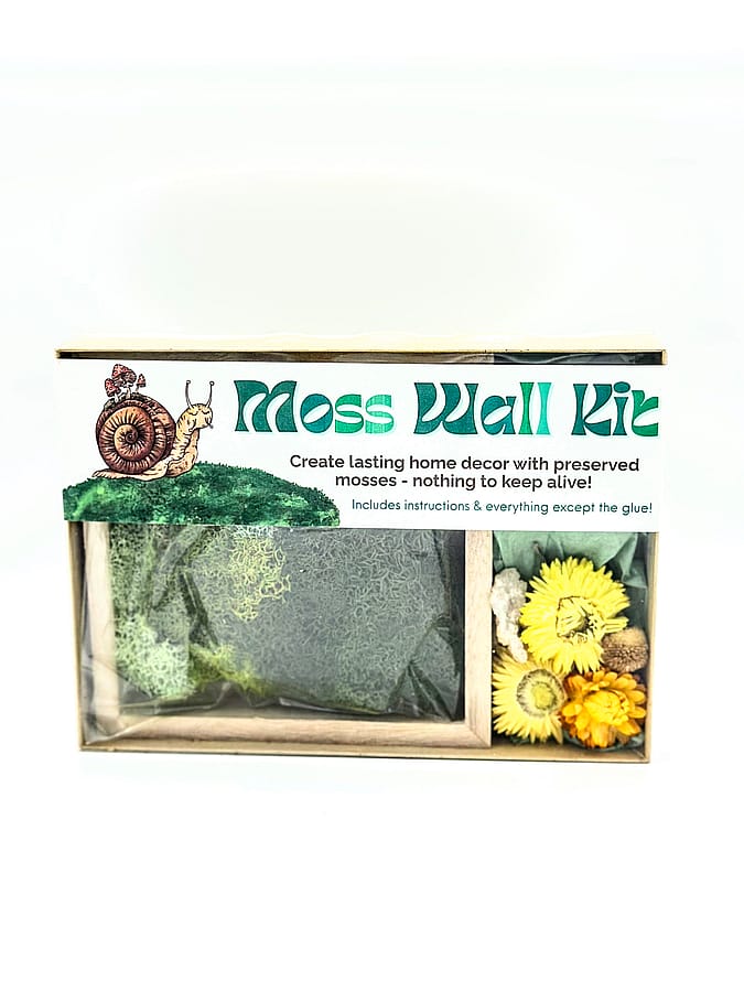 These kits are made in-house and include a 5" square frame with twine hanger; a variety of preserved mosses in shades of green; and a handful of dried flowers and other decorative elements to decorate your moss wall. (Glue is not included; basic white glue is all you need!)