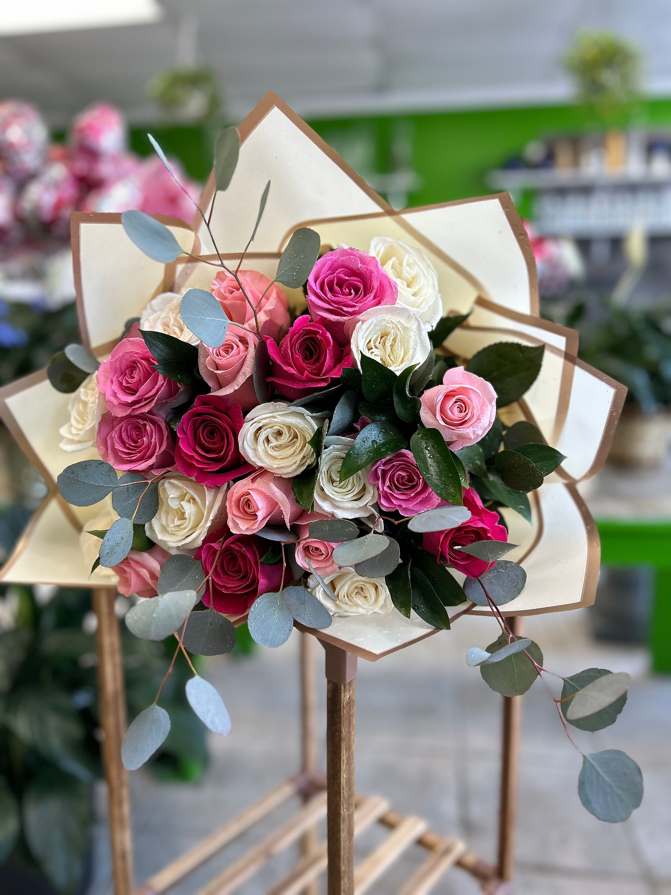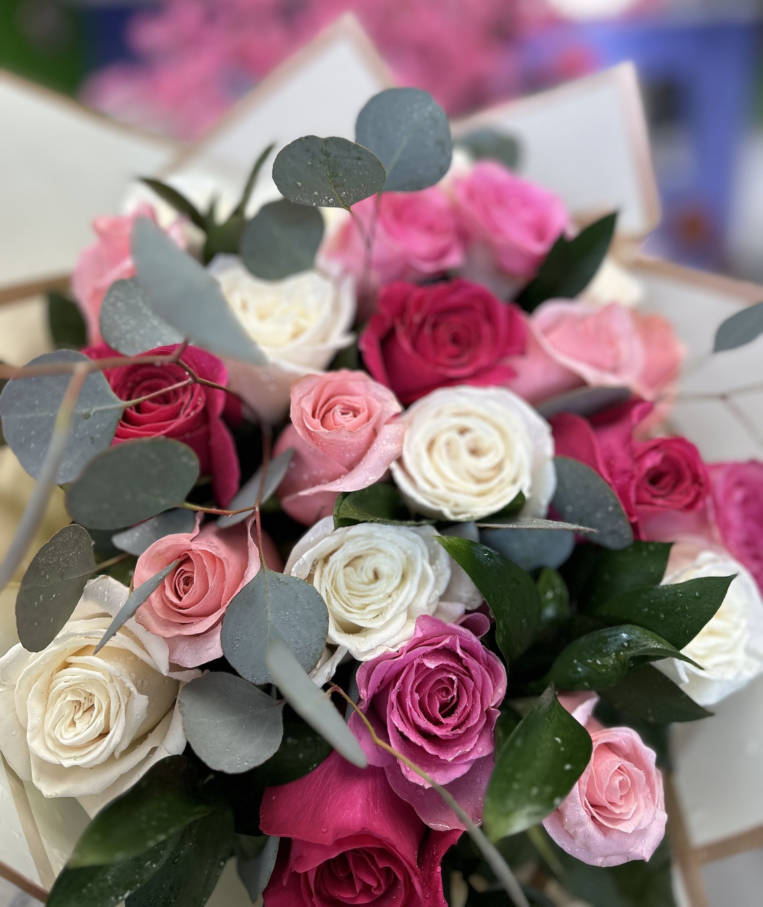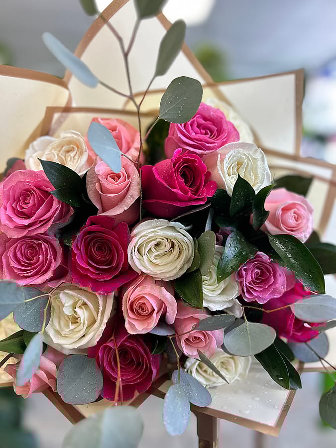 Is there anything more romantic than a stylish roses bouquet with multi-colored roses? Set apart from the traditional single-color rose bouquet, this stylish color combination of hot pink, pink, and white bouquet #vday26