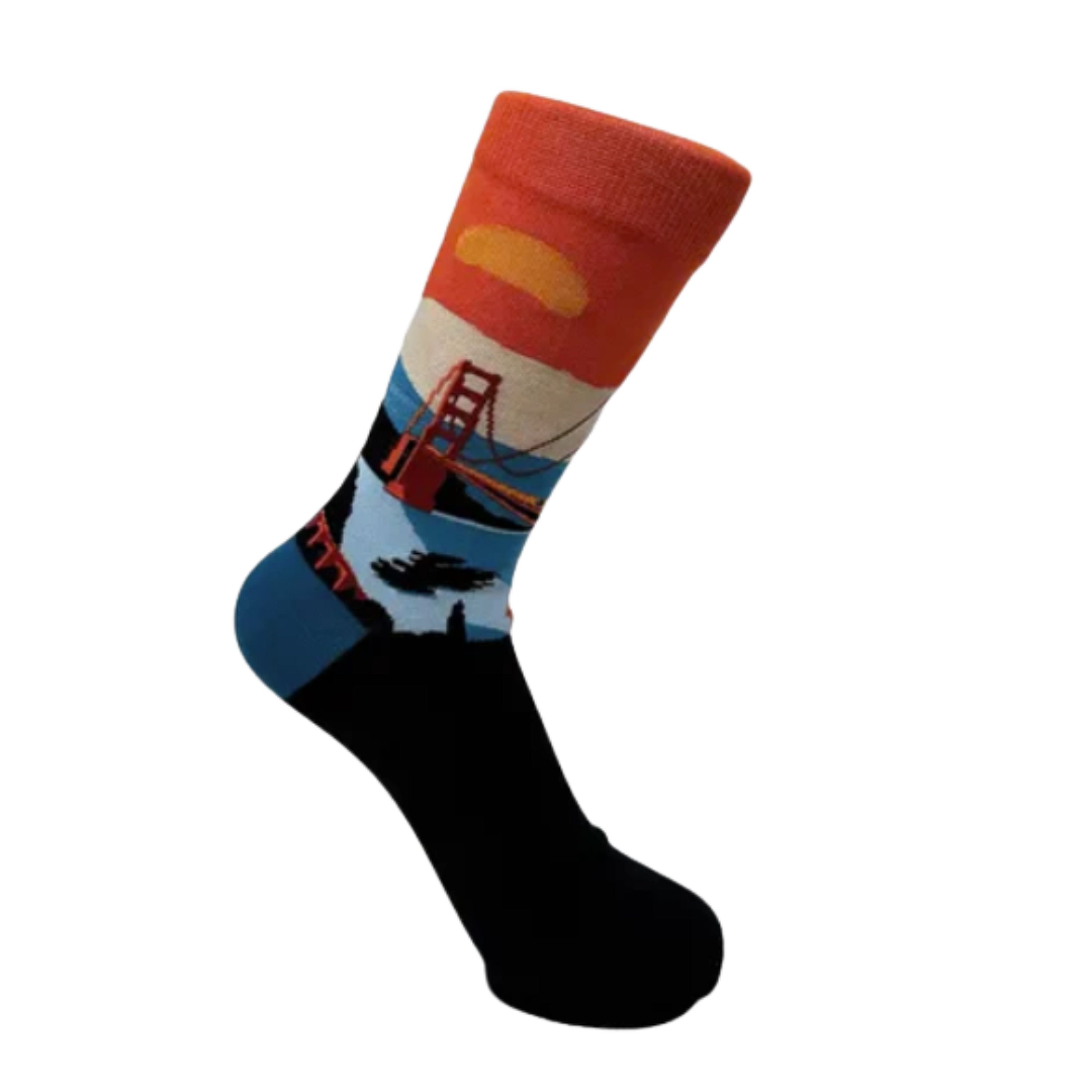 Step into San Francisco style with these crew socks featuring the iconic Golden Gate Bridge at dusk — a fun and wearable tribute to the city by the bay.