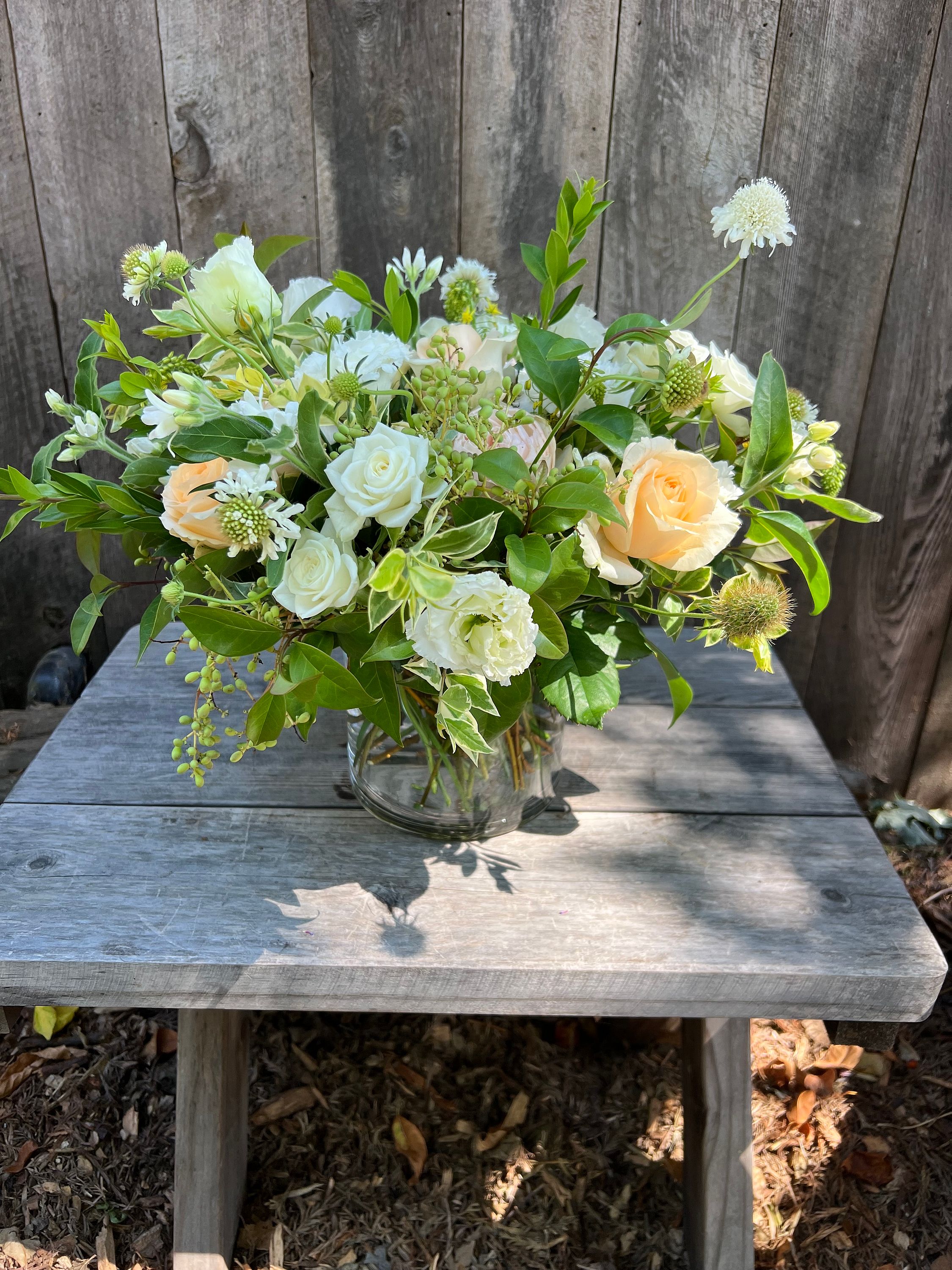 A beautiful designer's choice arrangement from our garden and other's in a simple glass vase. Featuring fresh in-season flowers with a soft + sweet color palette. #vday26 #SaintPatricksDay