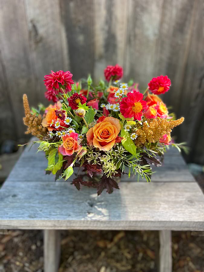 A beautiful designer's choice arrangement from our garden and other's in a simple glass vase. Featuring fresh in-season flowers with a bold + bright color palette.