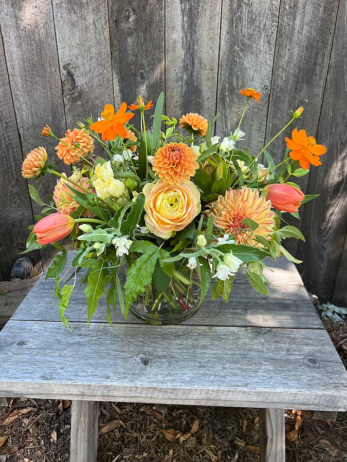 A beautiful designer's choice arrangement from our garden and others in a simple glass vase. Featuring fresh in-season flowers with a citrus-toned color palette.