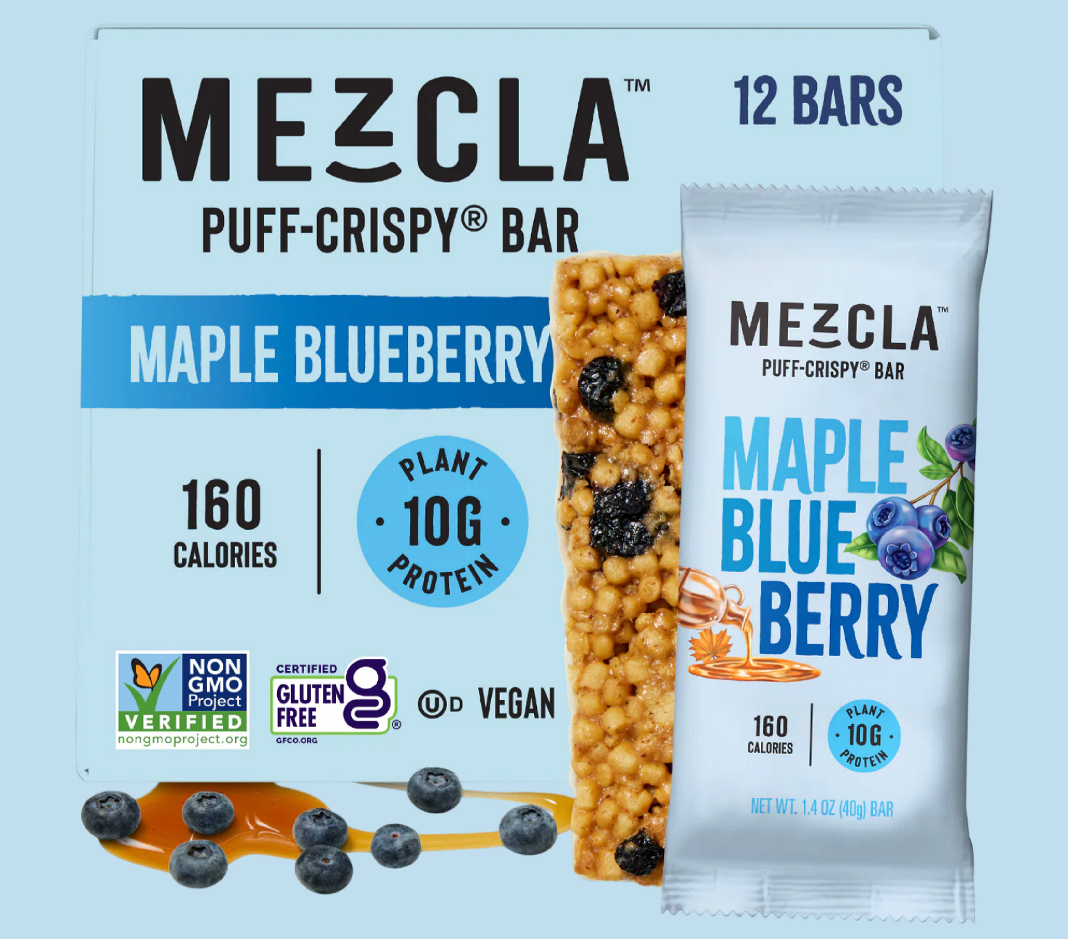 Take your tastebuds out to brunch! Our Maple Blueberry Puff-Crispy Bar features sweet blueberries, mapley vanilla drizzle, and all the joy of a blueberry pancake on Sunday morning. Non-GMO Plant Based Items per case: 12 - 1.4oz each