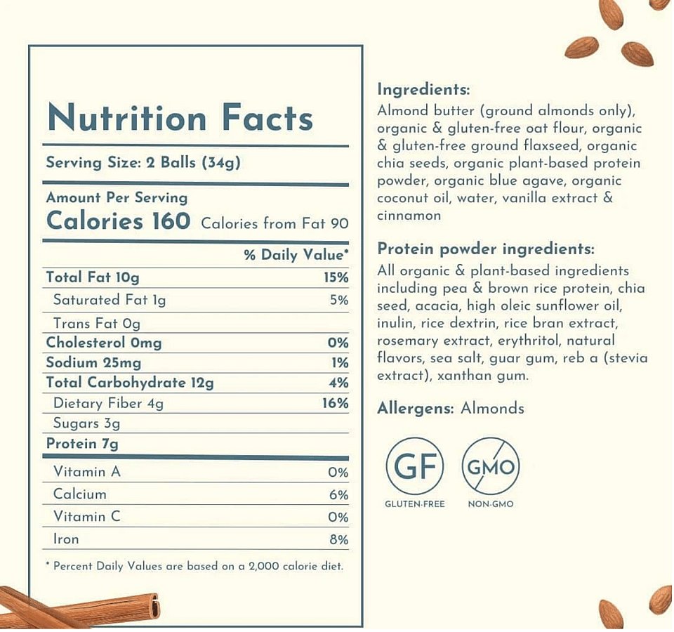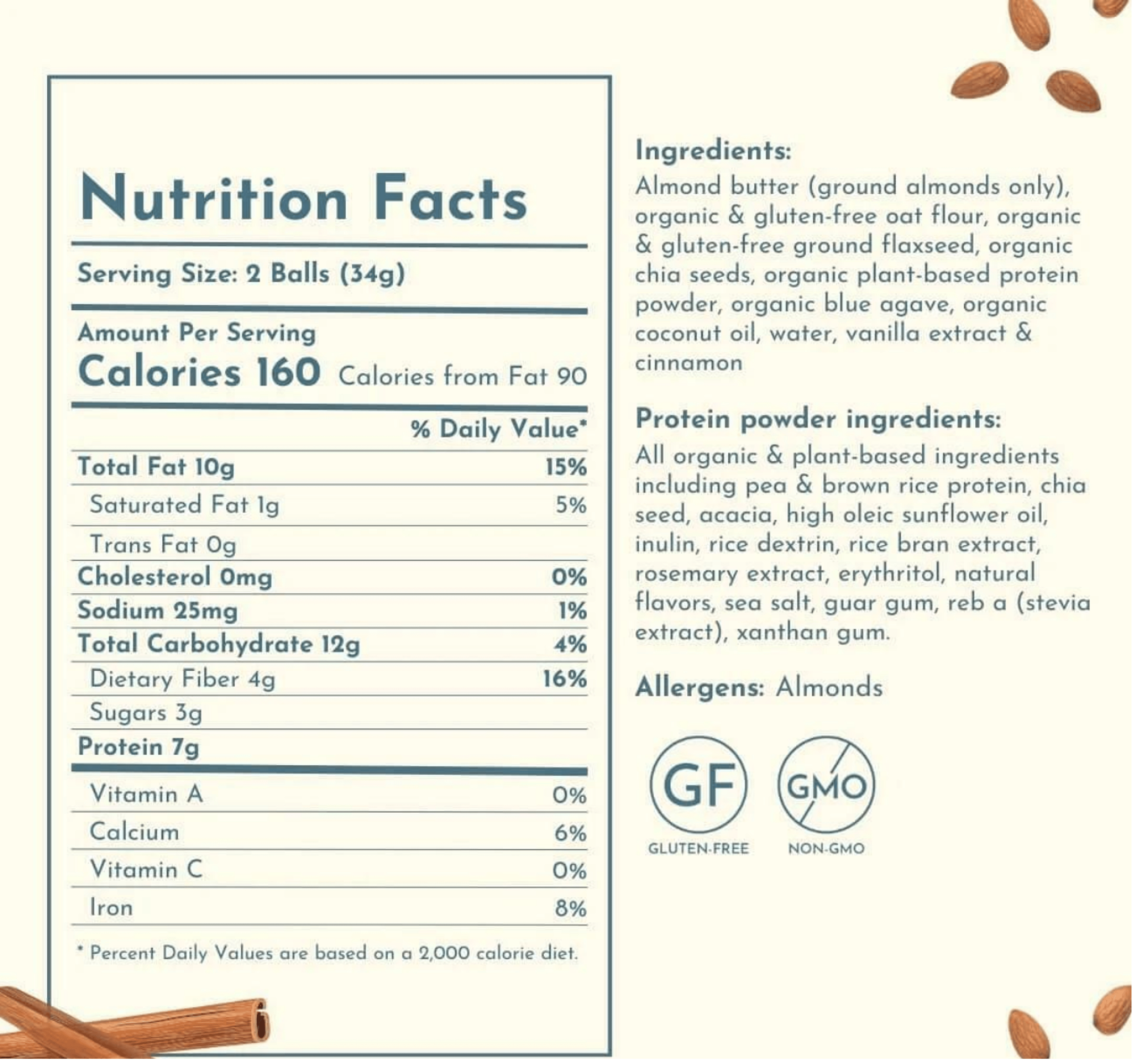 Our Snickerdoodle recipe is the quintessential New England cinnamon sugar cookie rolled up into a healthy ball. Our protein balls are gluten-free, dairy-free, soy-free with non-GMO ingredients. Items per case: 6 - 1.6oz each
