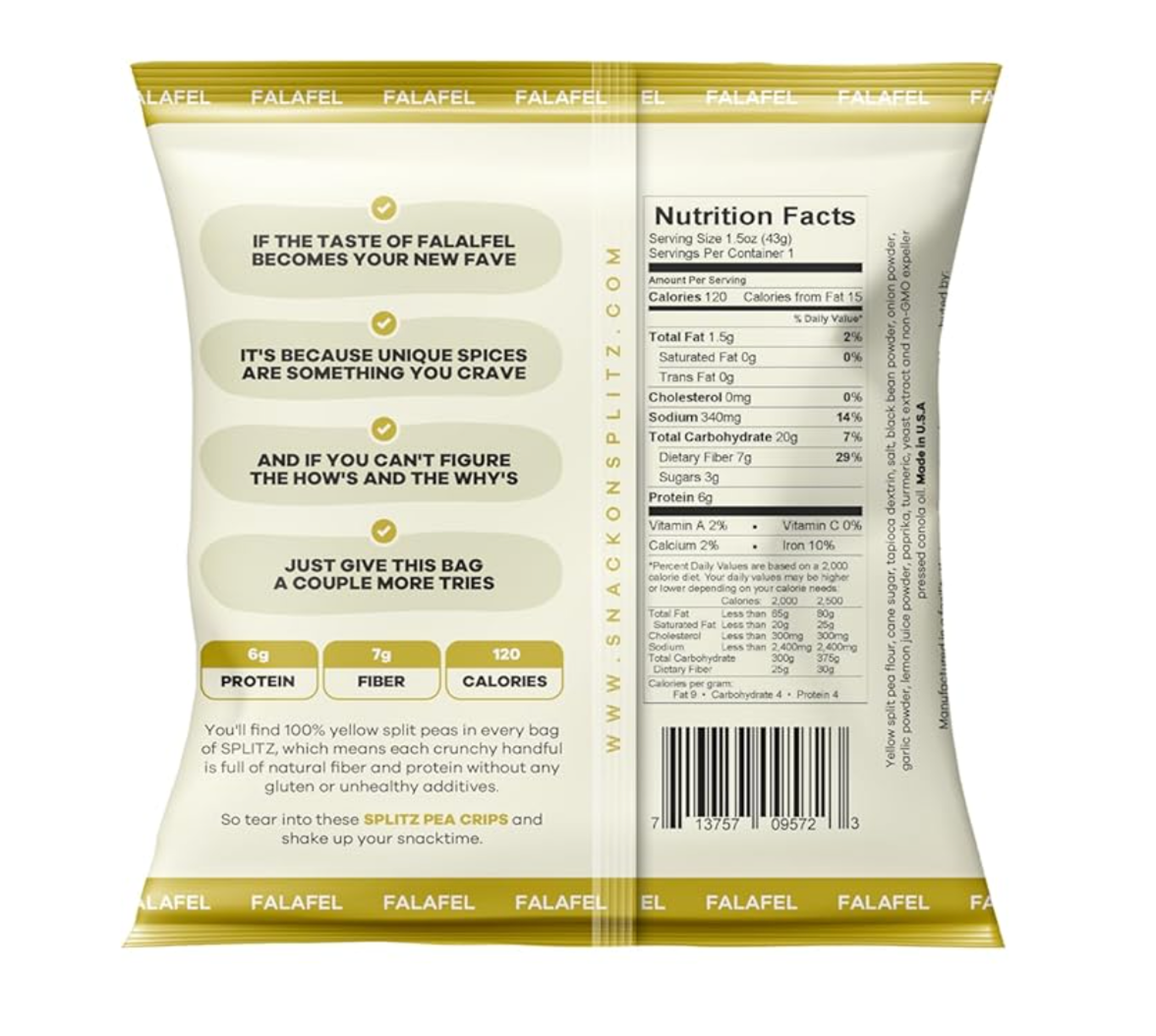 DELICIOUS, HEALTHY SNACK. Instead of filling up on snacks that are bad for you, grab a bag of gluten-free Splitz Pea Crisps instead. Made from 100% yellow split peas with no GMOs, this healthy, all-natural snack is packed with fiber and protein for your whole family.