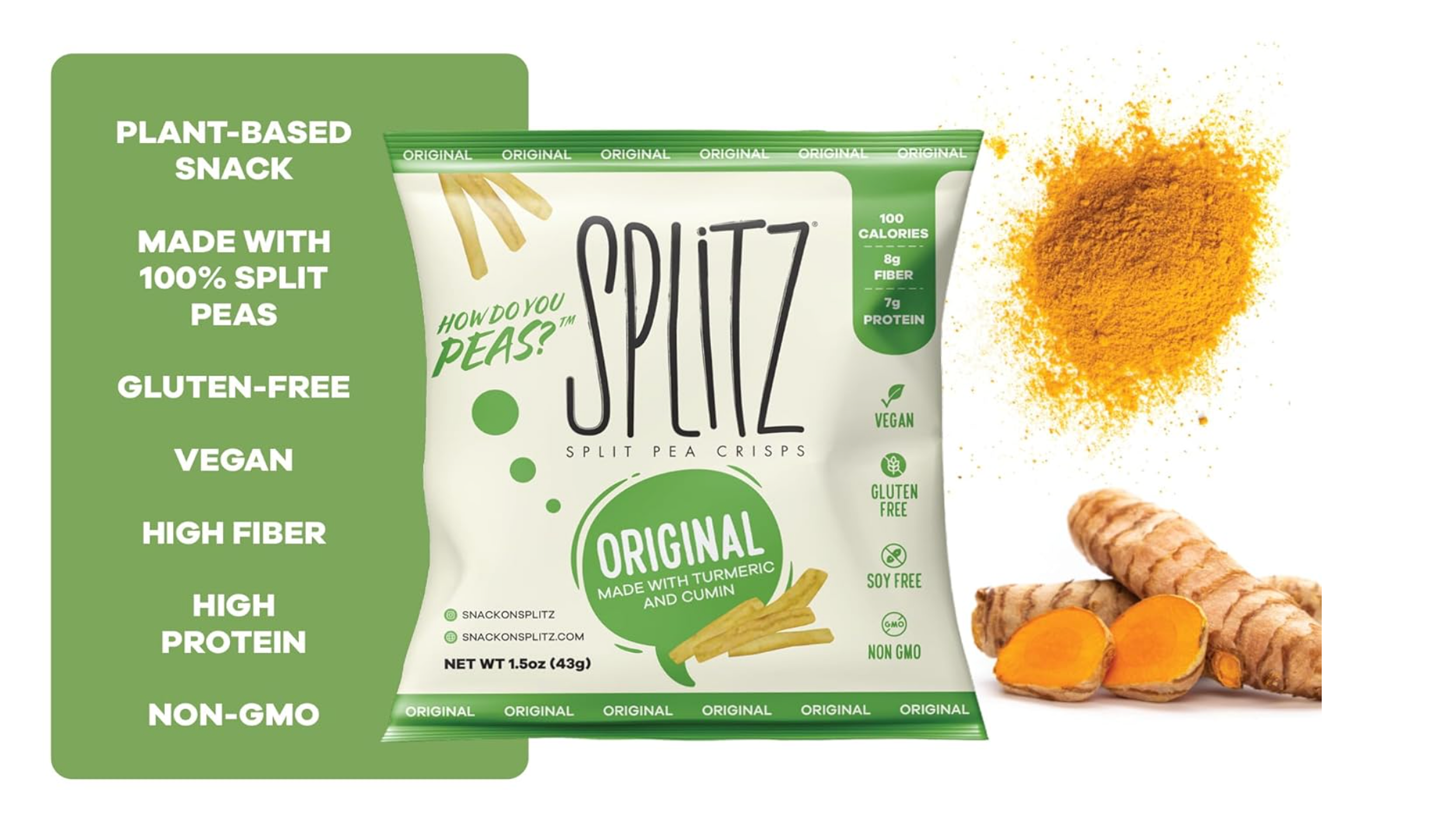 DELICIOUS, HEALTHY SNACK. Instead of filling up on snacks that are bad for you, grab a bag of gluten-free Splitz Pea Crisps instead. Made from 100% yellow split peas with no GMOs, this healthy, all-natural snack is packed with fiber and protein for your whole family.