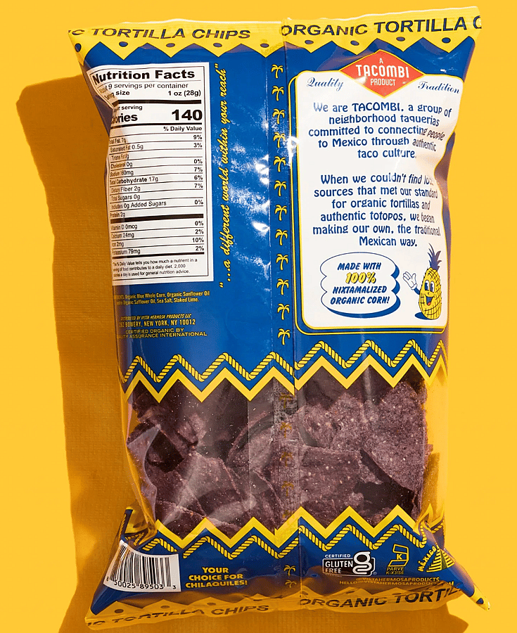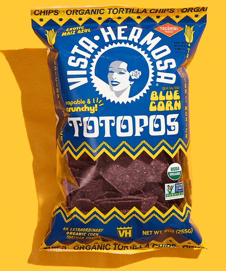A result of resourceful ingenuity, the ancient civilizations of Mexico used to dry and fry their stale tortillas to make a delicious, crunchy corn snack known as Totopos. Honoring this tradition, we craft our own USDA Certified Organic Totopos in small batches, from 100% nixtamalized organic blue corn tortillas that we cut and fry into thick and crunchy triangles, adding a pinch of sea salt for ultimate snacking pleasure and versatility.