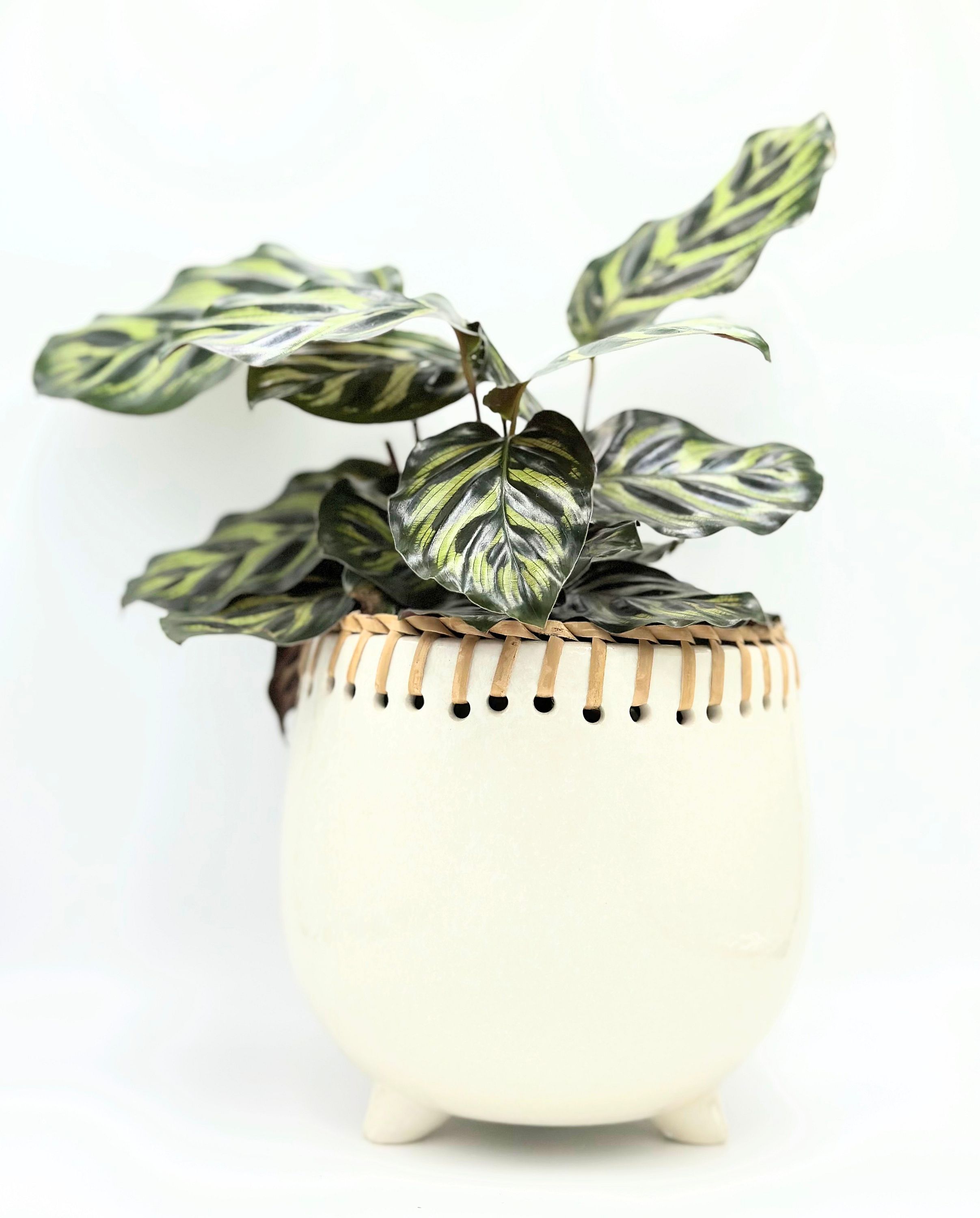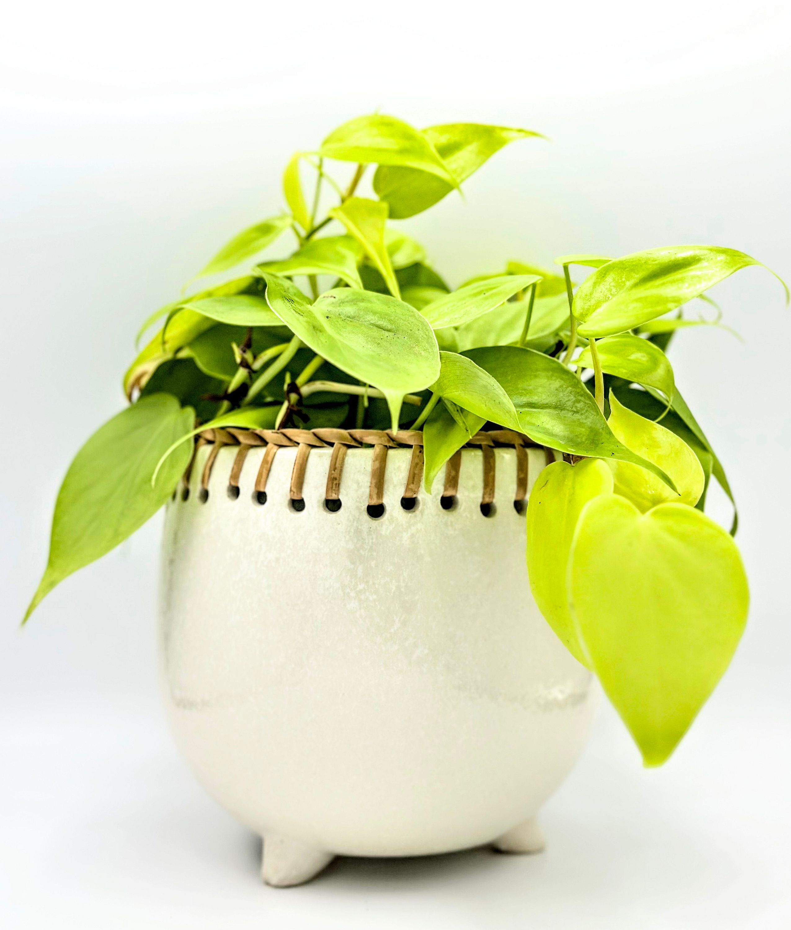 This ceramic footed pot is accented with a raffia binding around the top edge. It fits our 4" plants.