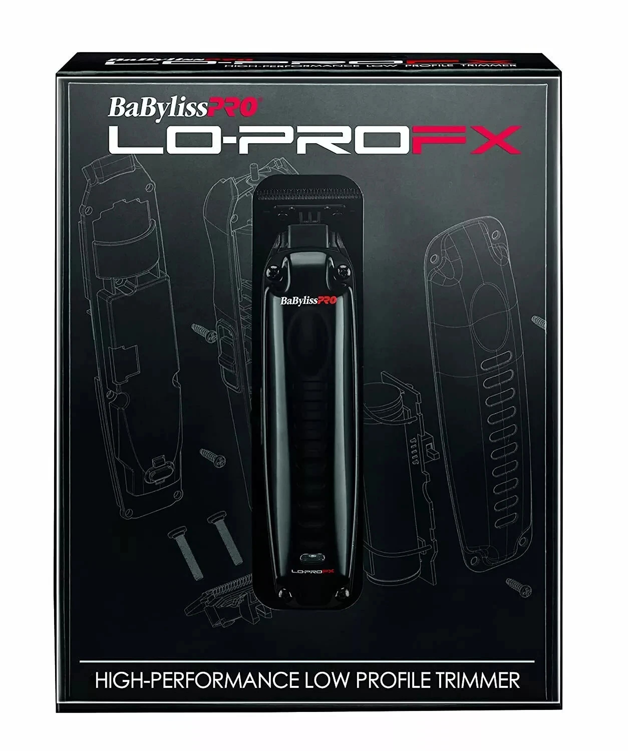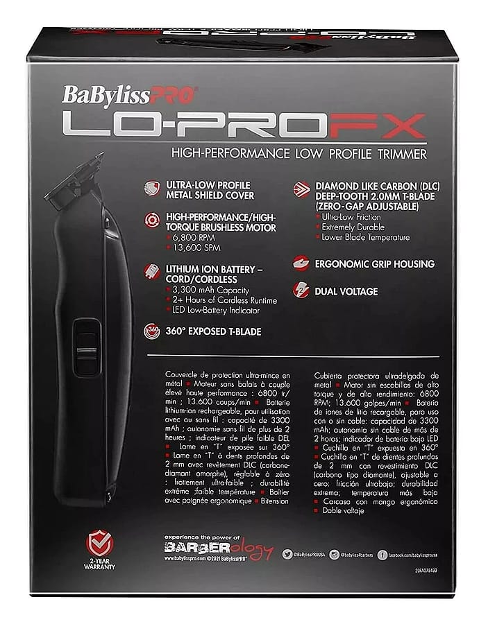 The BabylissPro Lo-ProFX trimmer features an Ultra-low profile metal shield cover and ergonomic grip housing. It is powered by a high-performance brushless 6,800 RPM motor with a high-capacity 3,300 mAh lithium-ion battery.