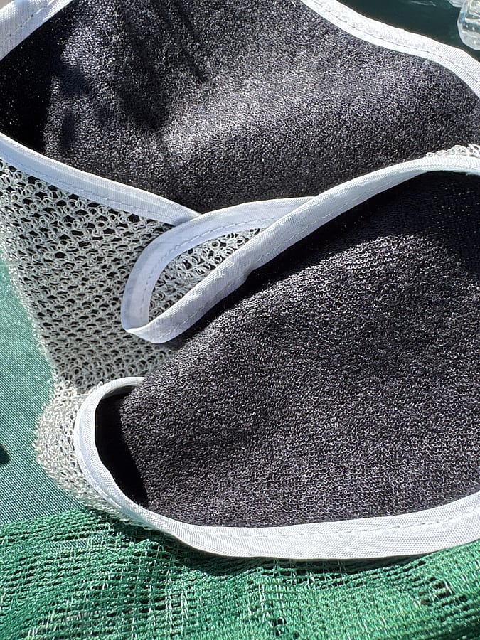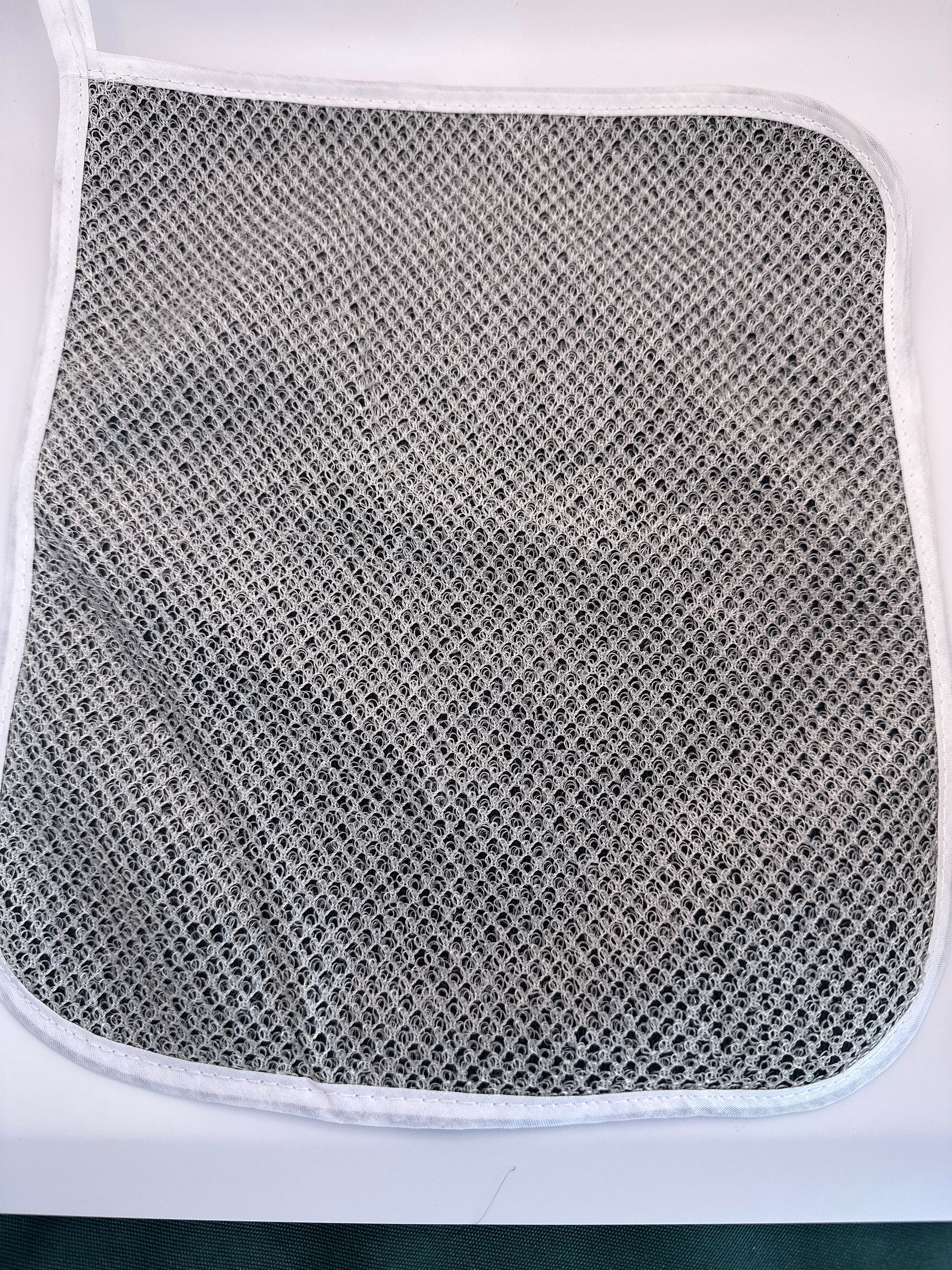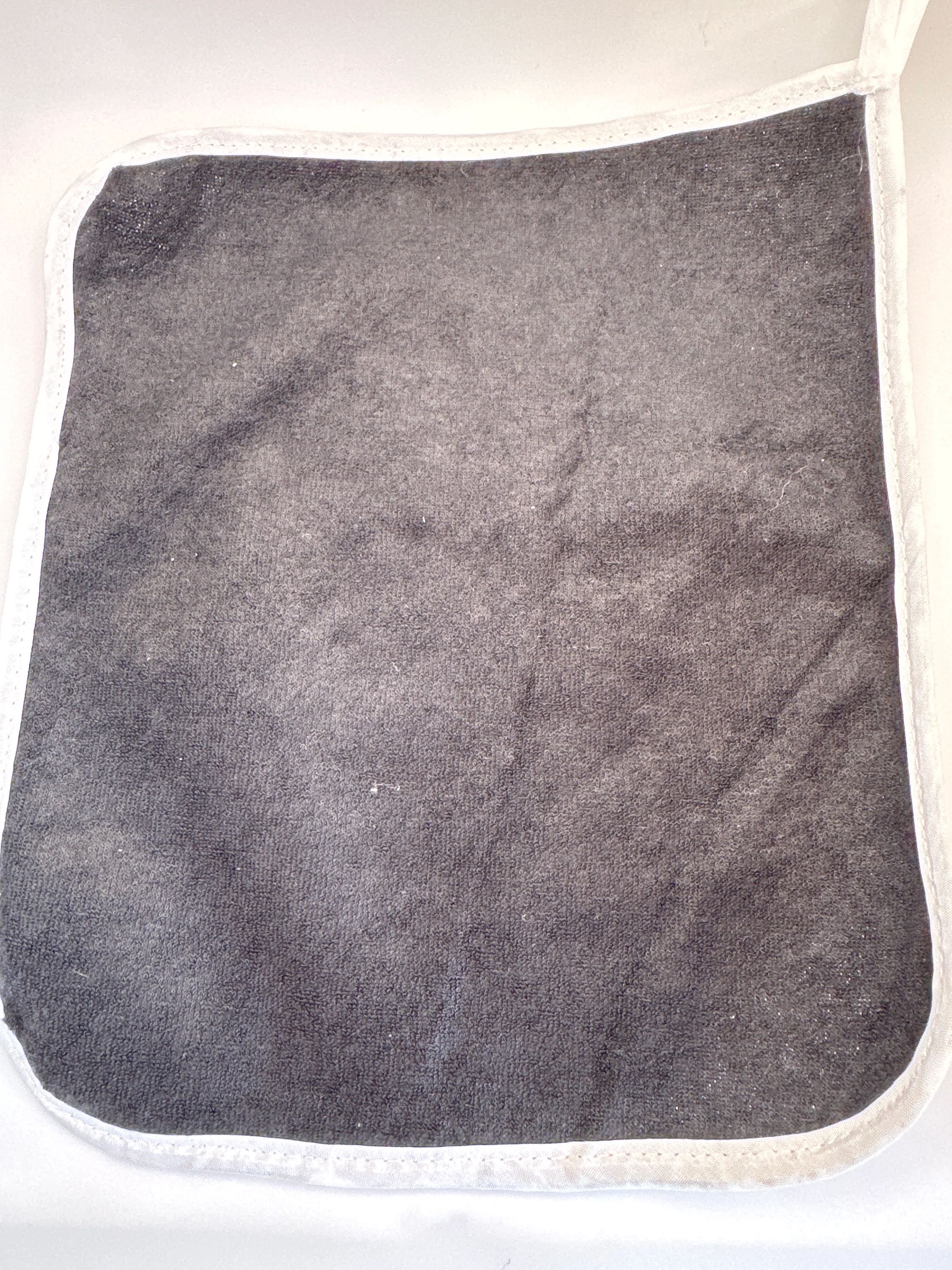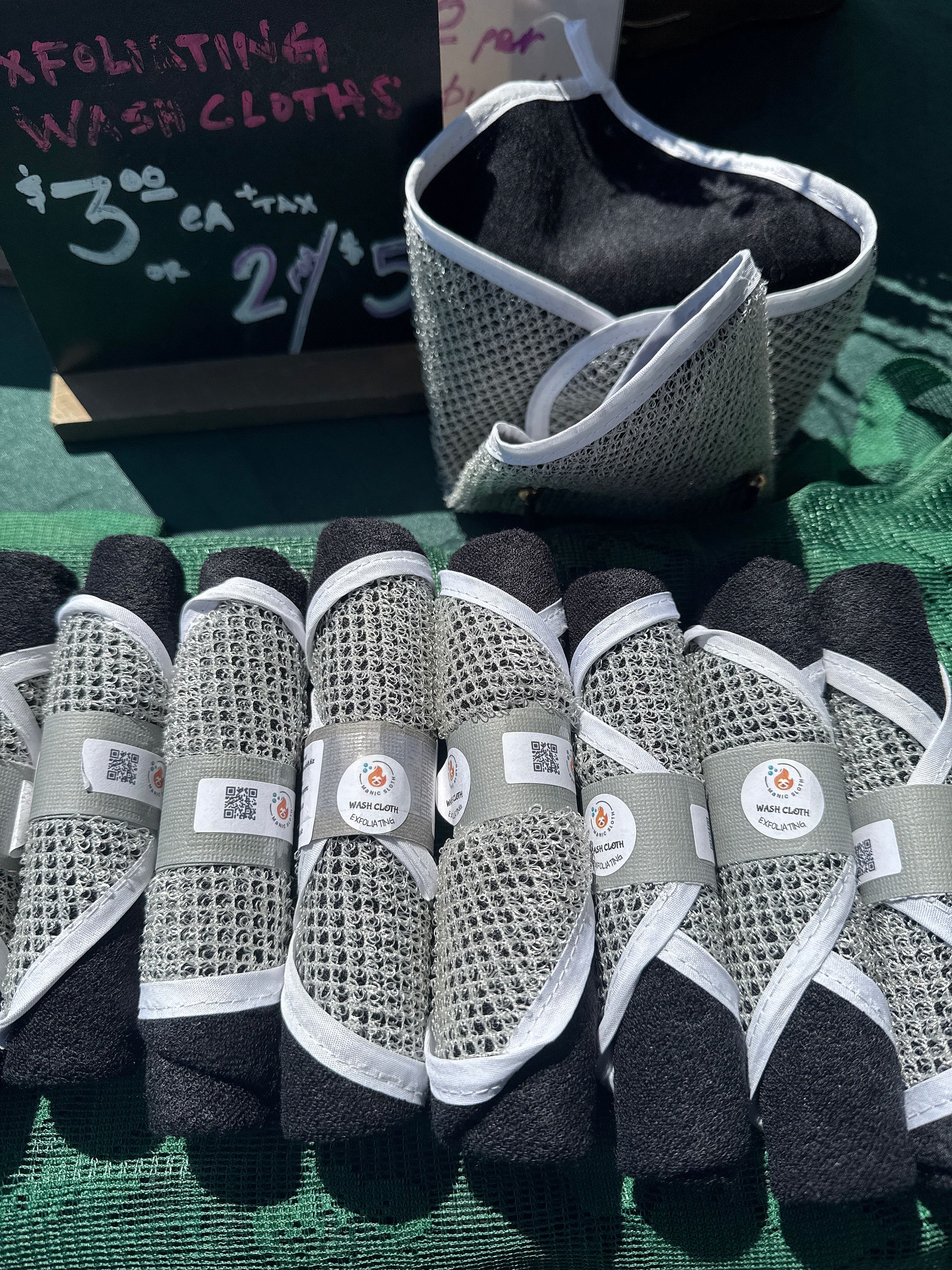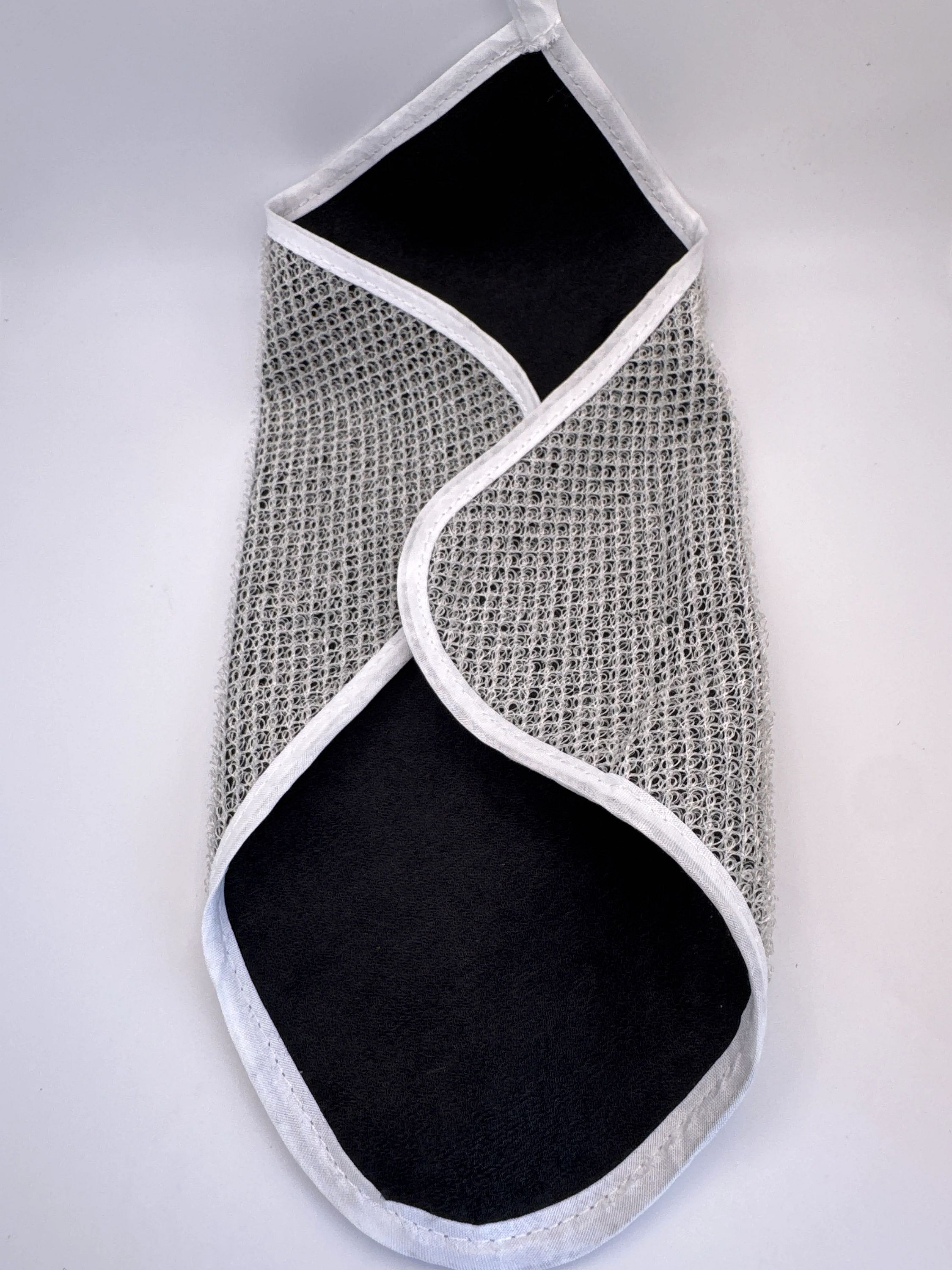 Solid Black Color with white trim. Dual-sided exfoliating body wash cloth. Can also be used for face.