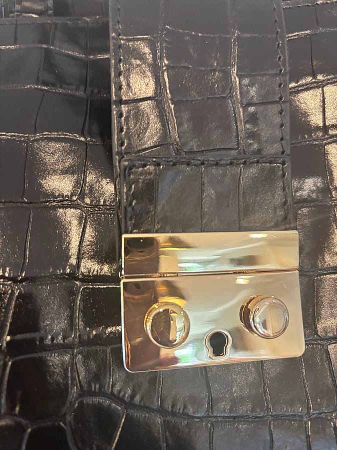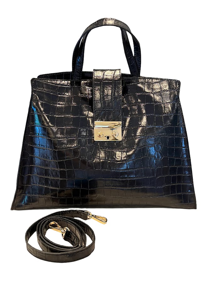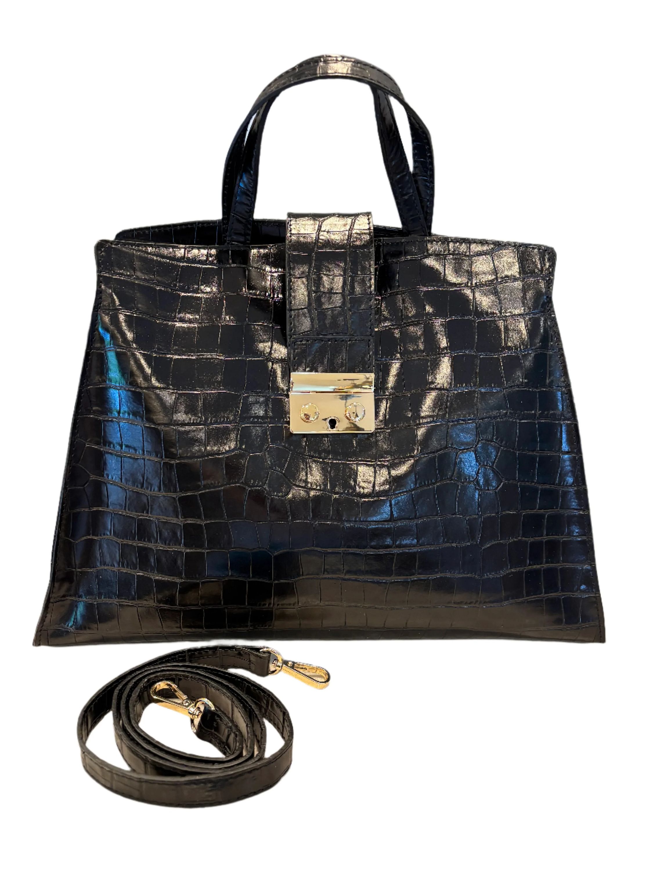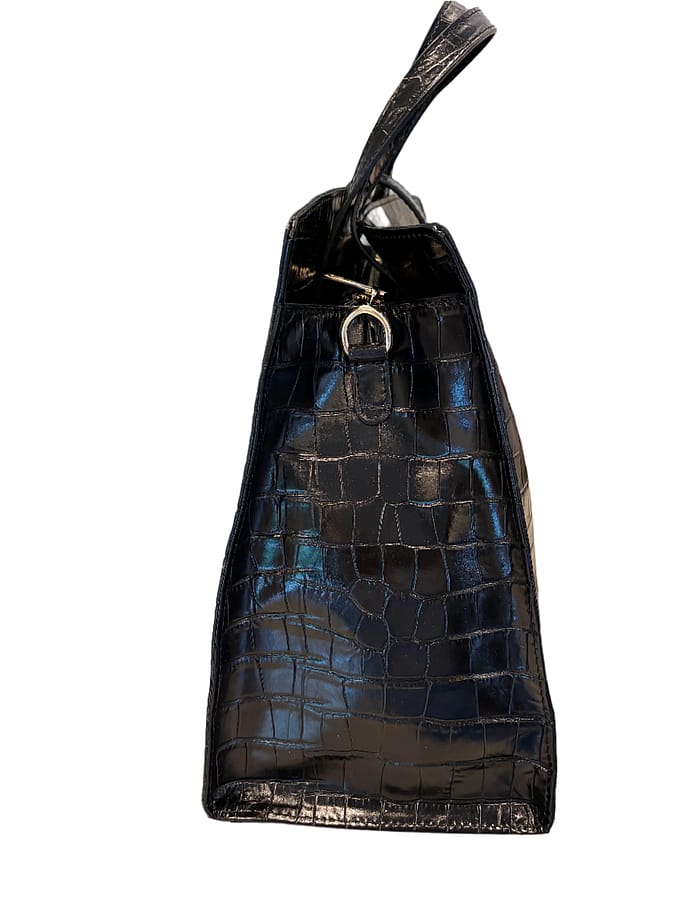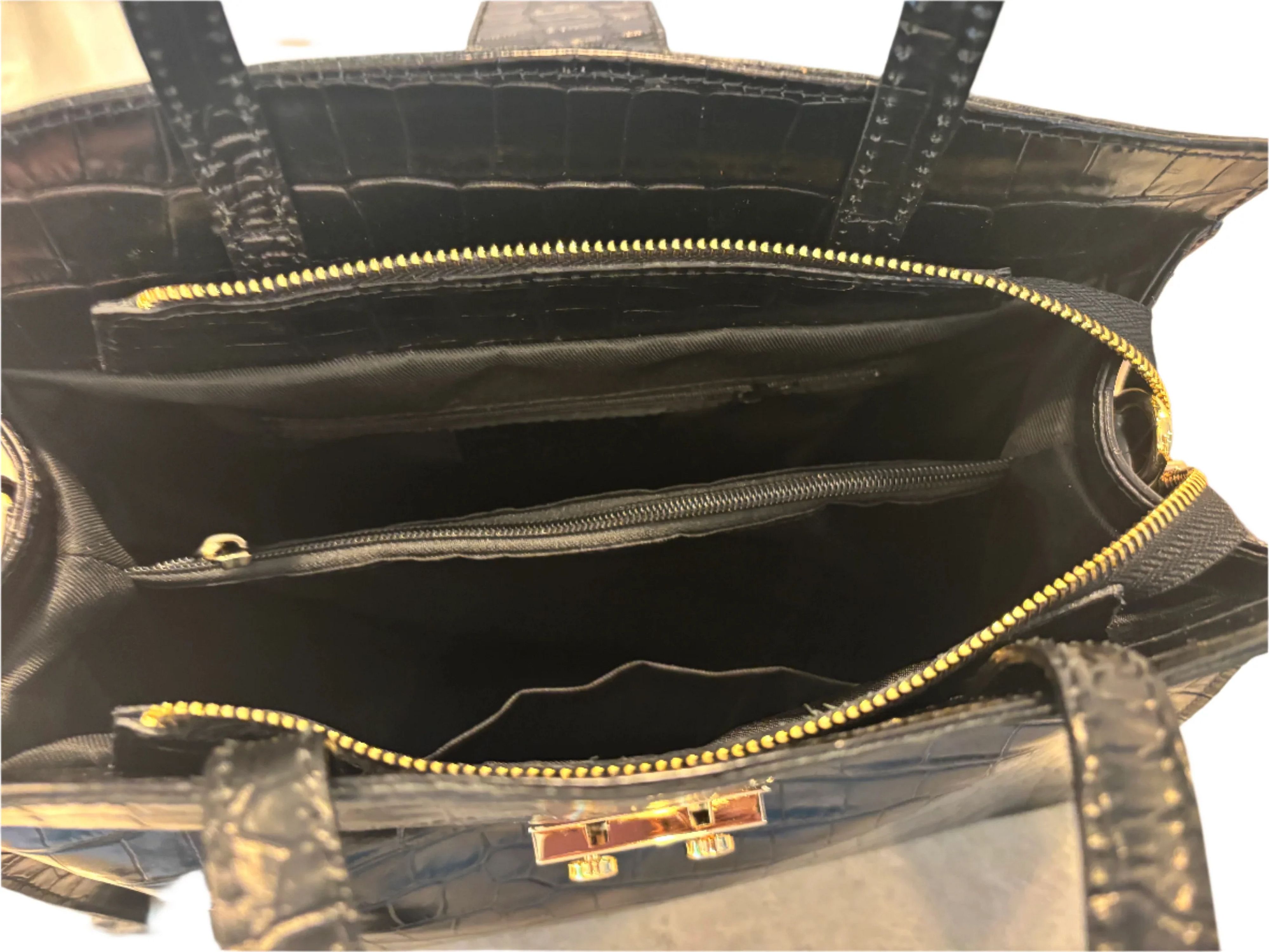 Meet Avery, your new favorite bag with a playful twist. Crafted from black croc-embossed leather, it shines with a chic gold closure and a convenient back zipper. Inside, a roomy middle zipper pocket keeps your essentials organized, while the shoulder strap lets you carry it with ease and style. Perfect for adding a bold touch to any outfit!
