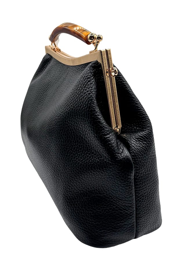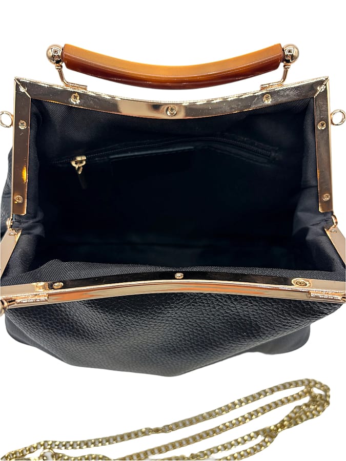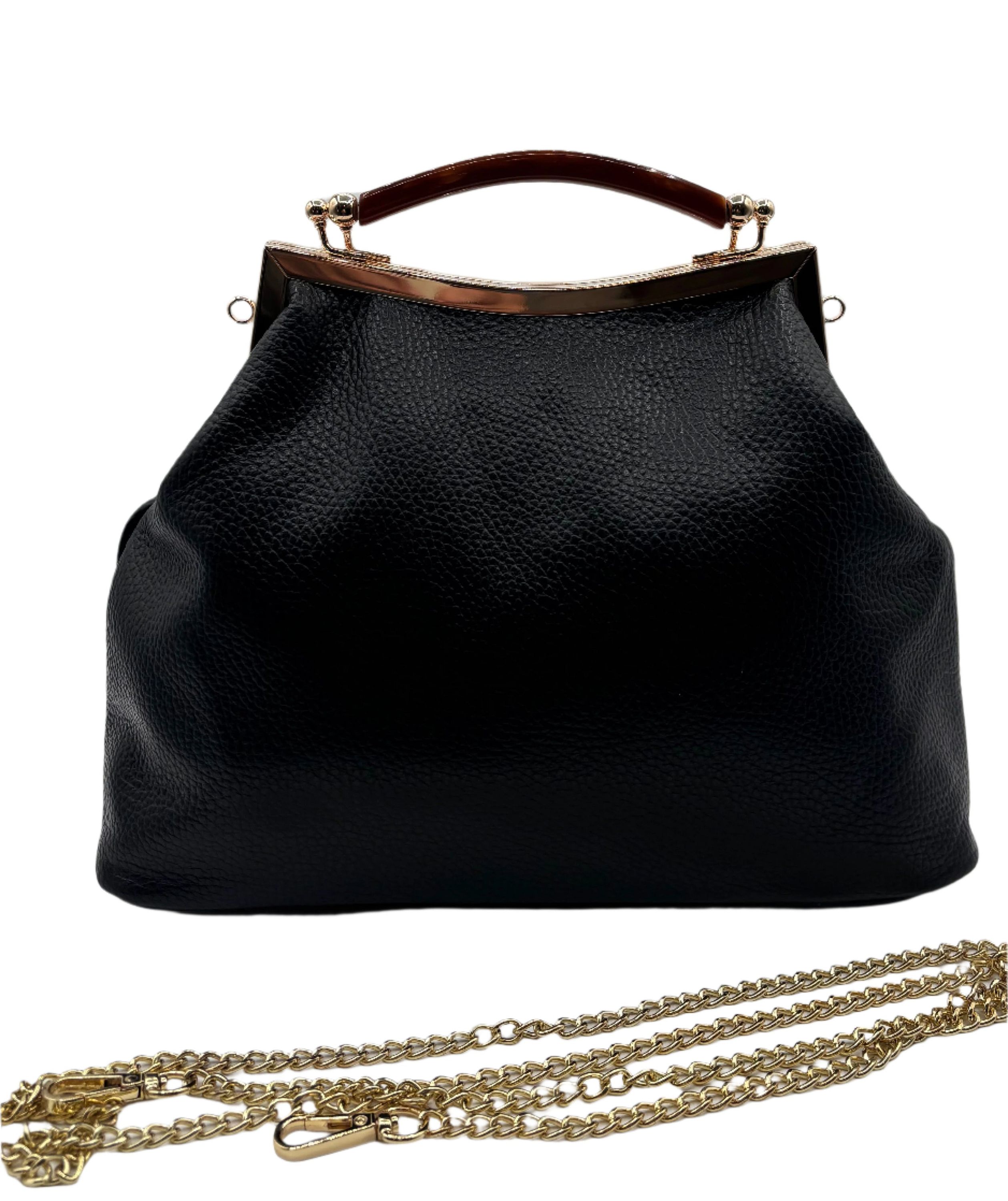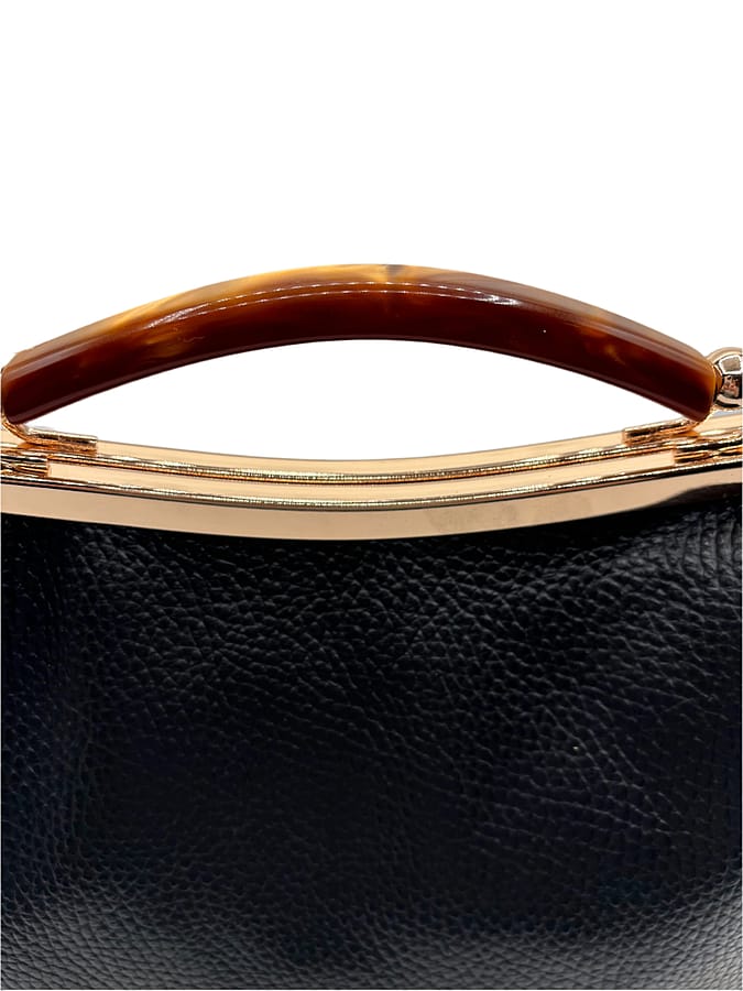 Experience the unique style and versatility of Lola! This eye-catching bag features a faux tortoise handle, gold hardware, and a removable chain shoulder strap. Keep your essentials secure with the inside zipper pocket. Stand out from the crowd with Lola's distinct shape and elegant design.