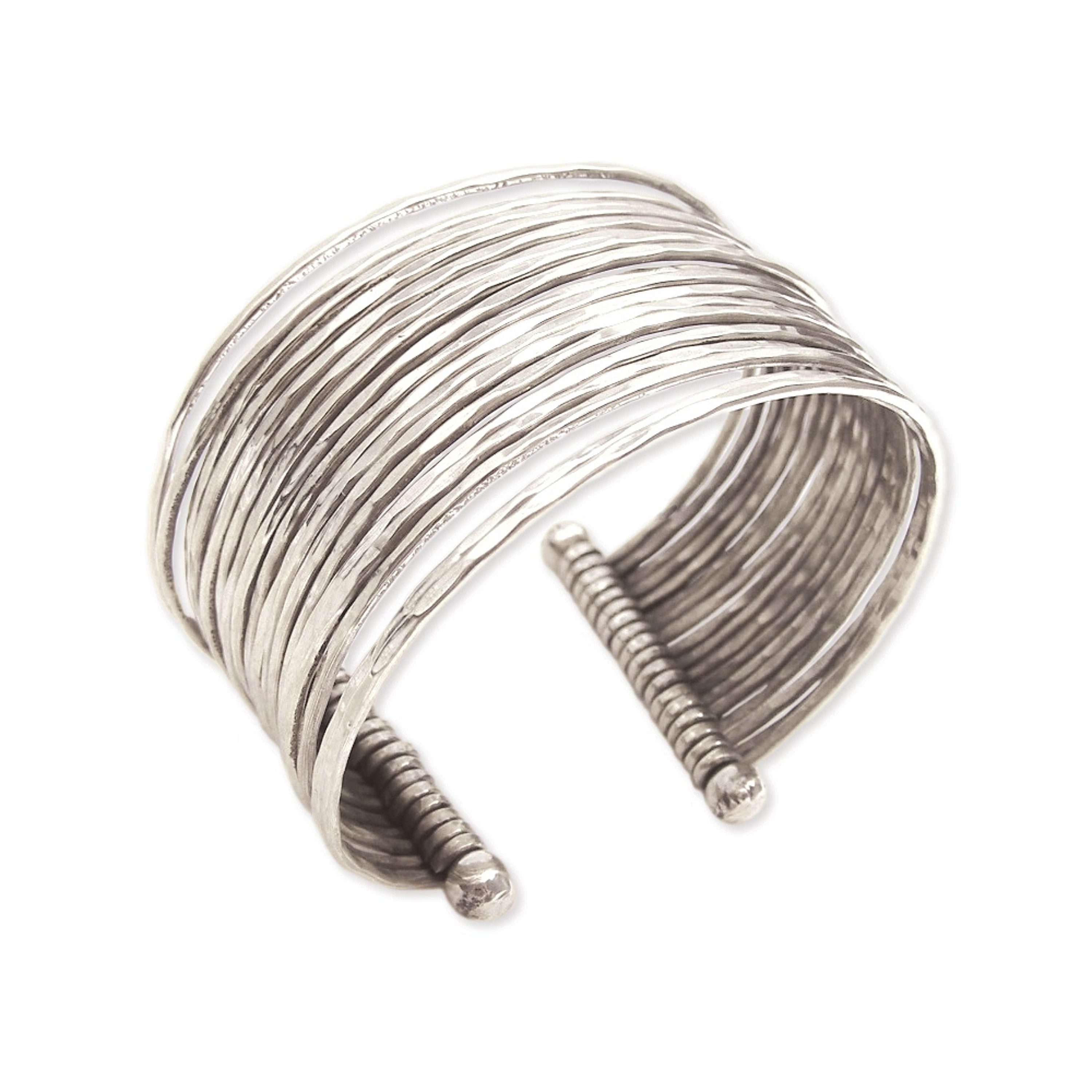Stunning multi row hammered cuff adds flair to any outfit. Shiny silver plate finish catches the light. 1 1/2" wide. Open cuff easy to put on and adjusts for perfect fit. Substantial look with surprisingly lightweight feel. Handmade in India.