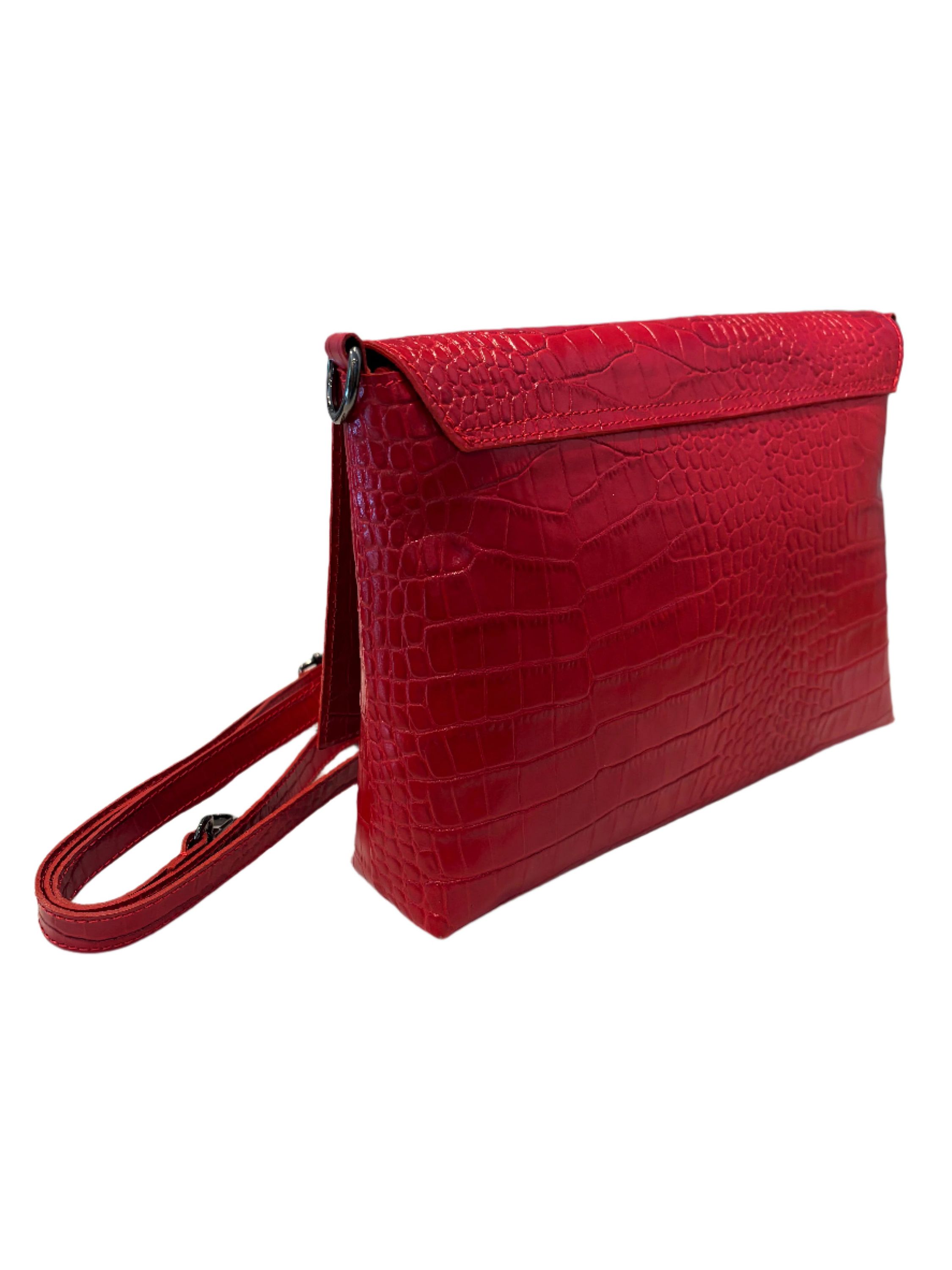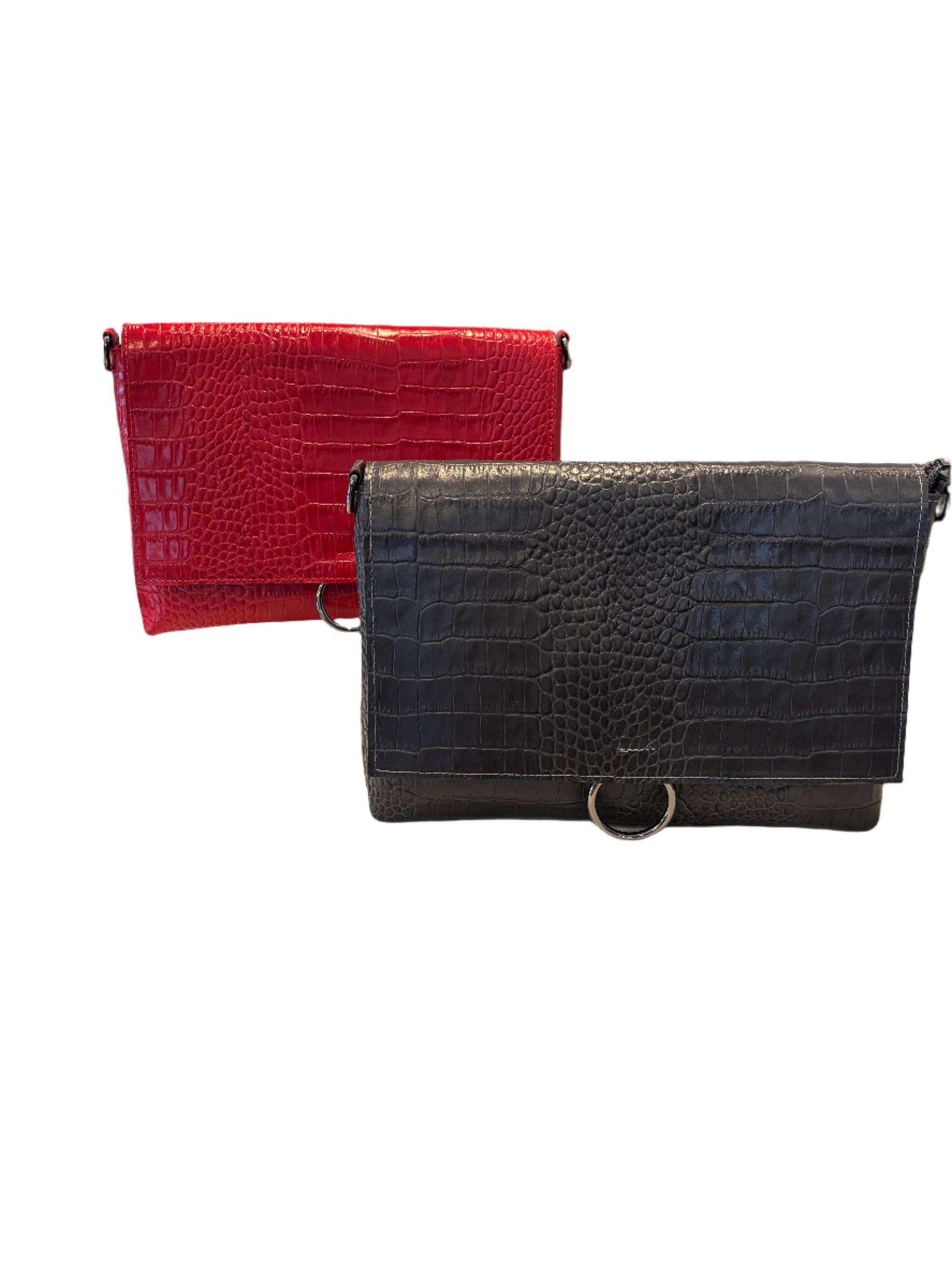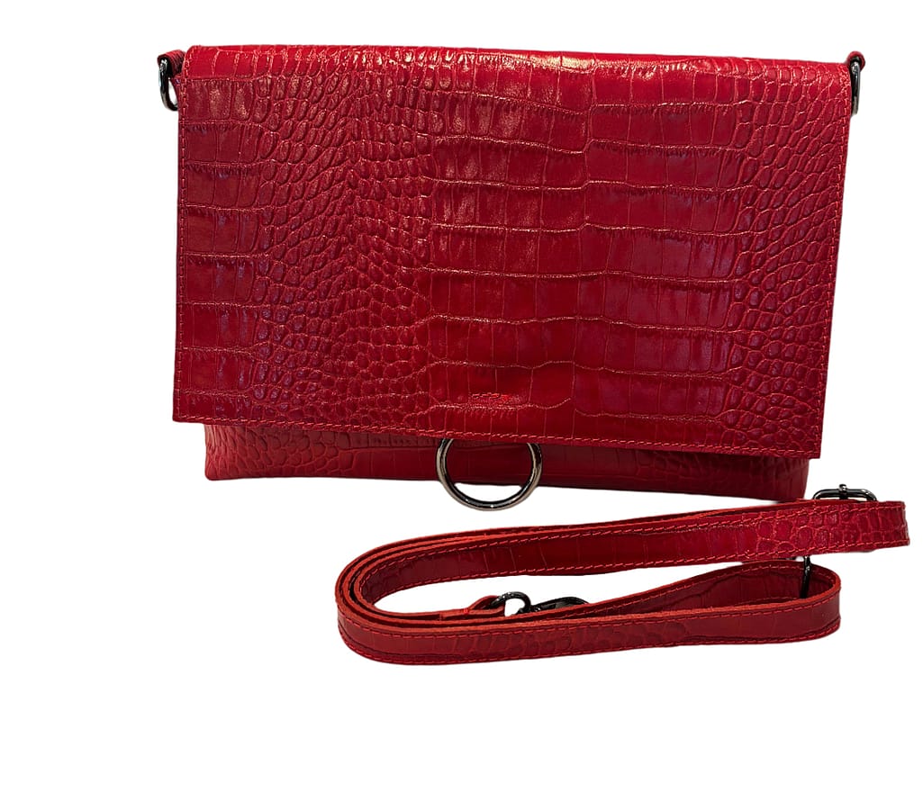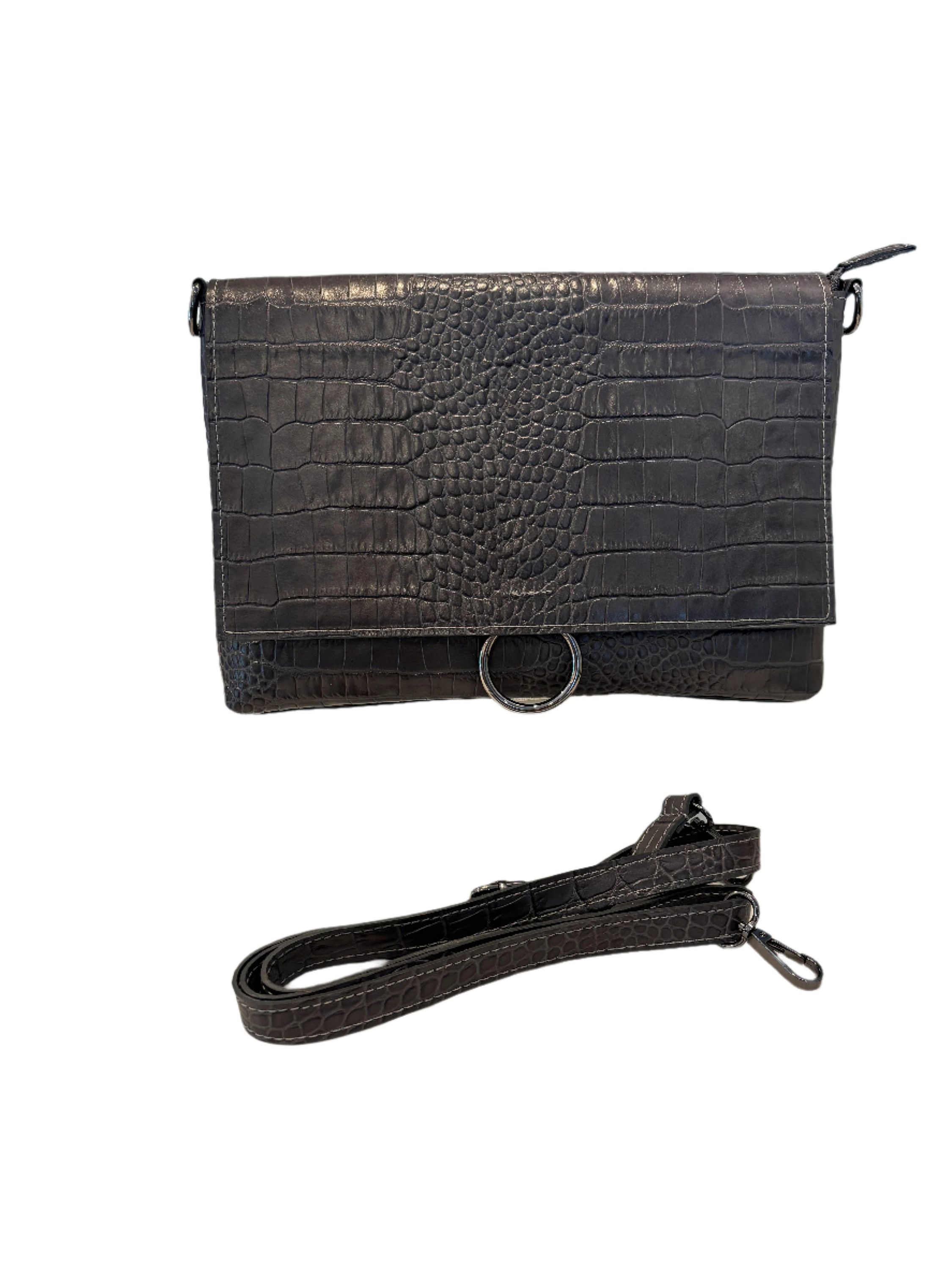 The Madison bag features a distinctive gunmetal ring snap closure and a secure zipper hidden beneath the flap. Designed for versatility, it can be elegantly carried as a clutch or worn comfortably with its adjustable crossbody strap, making it a refined accessory for any occasion.