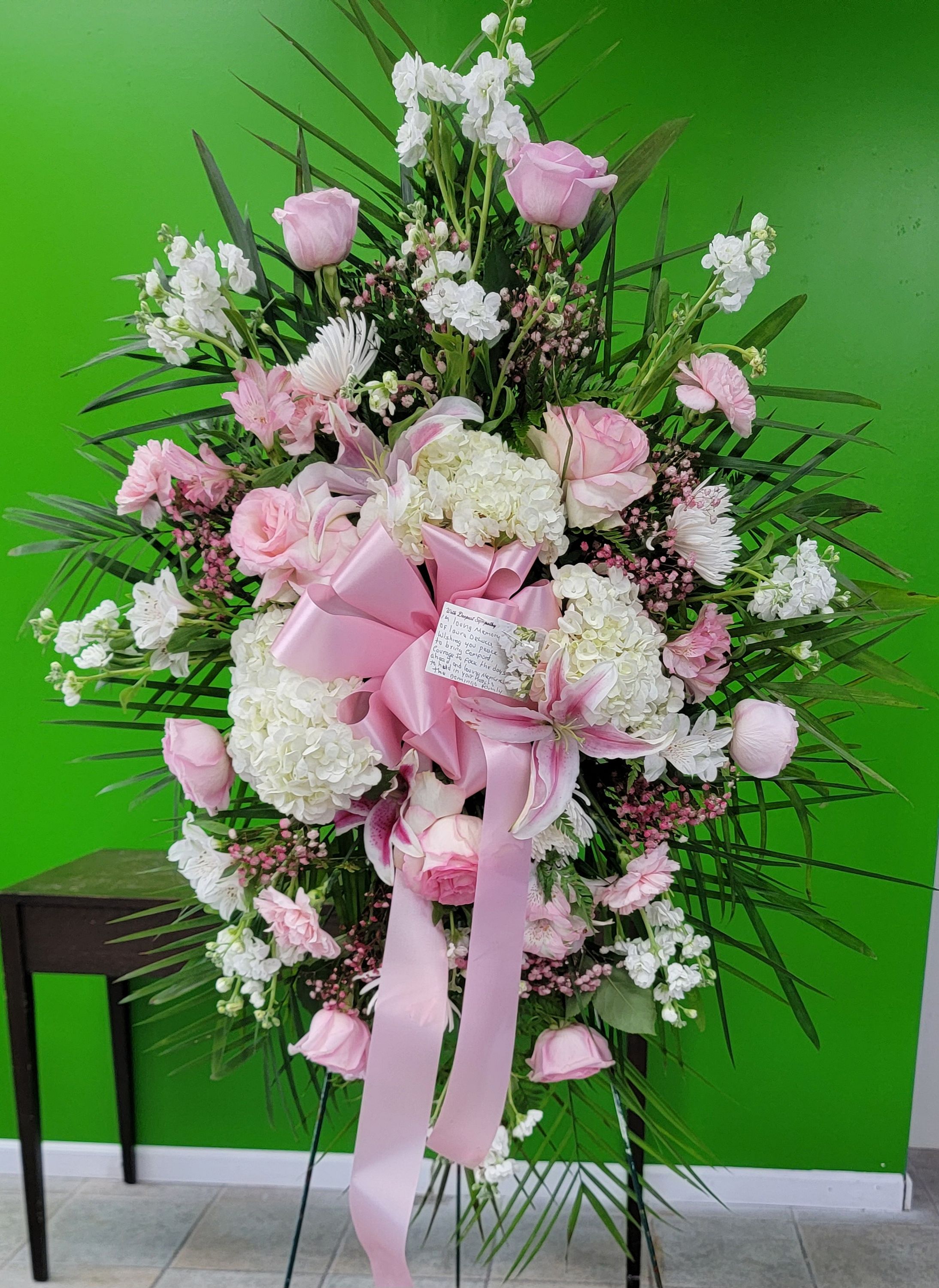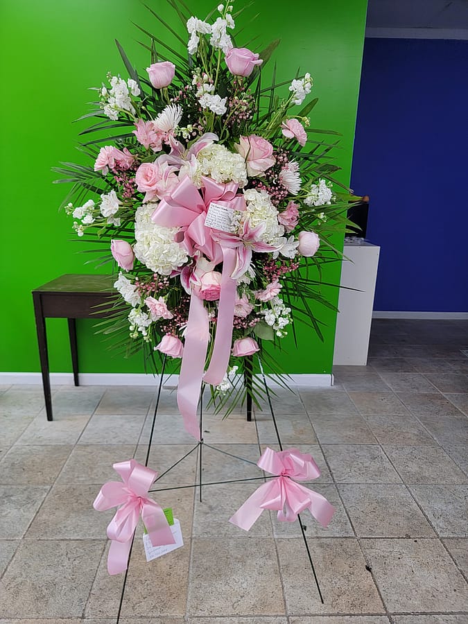 Pink & white floral standing spray. Perfect to honor our loved ones.