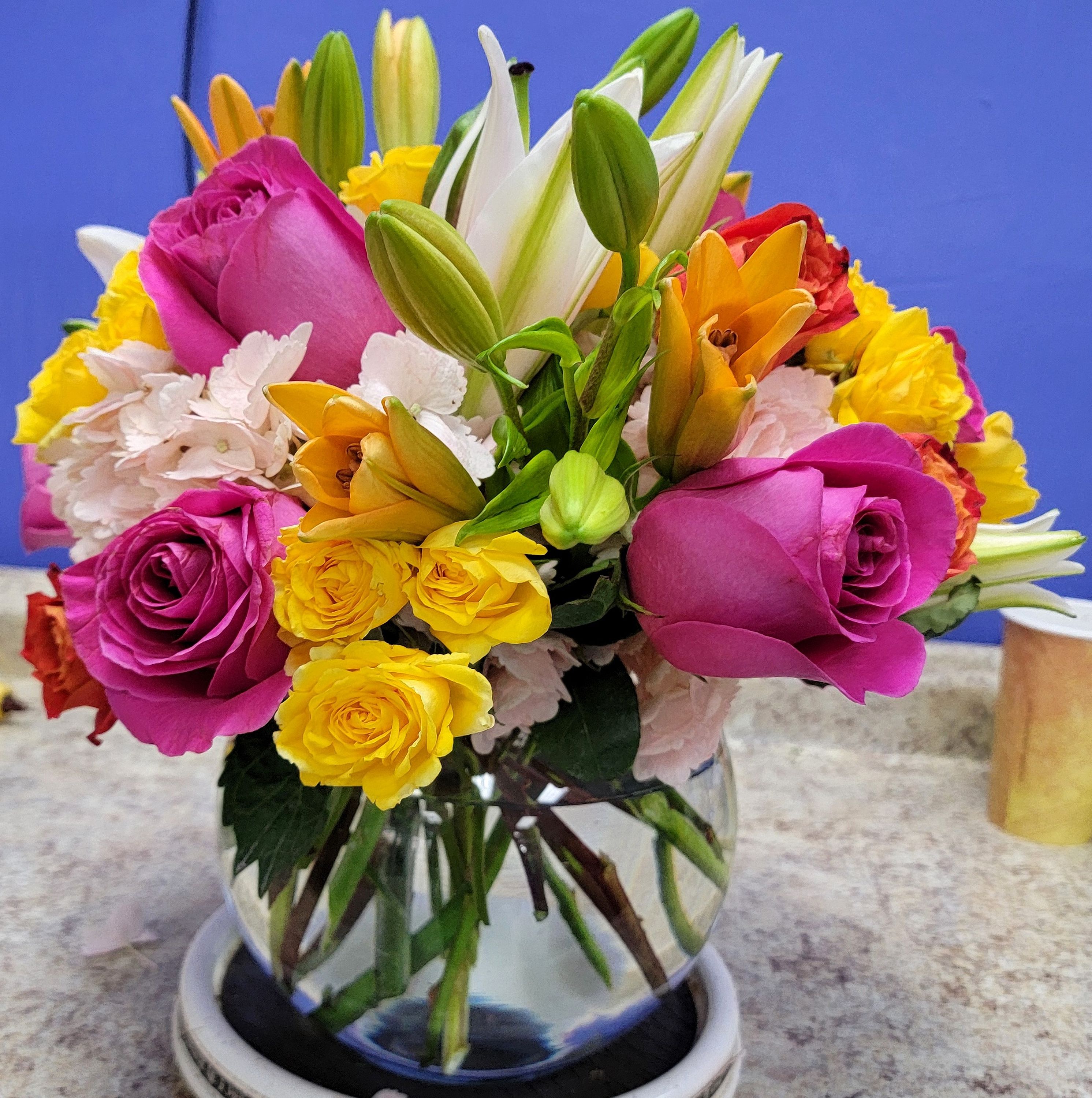 Assortment of bright and colorful flowers in glass bowl. *Flowers vary with each order*