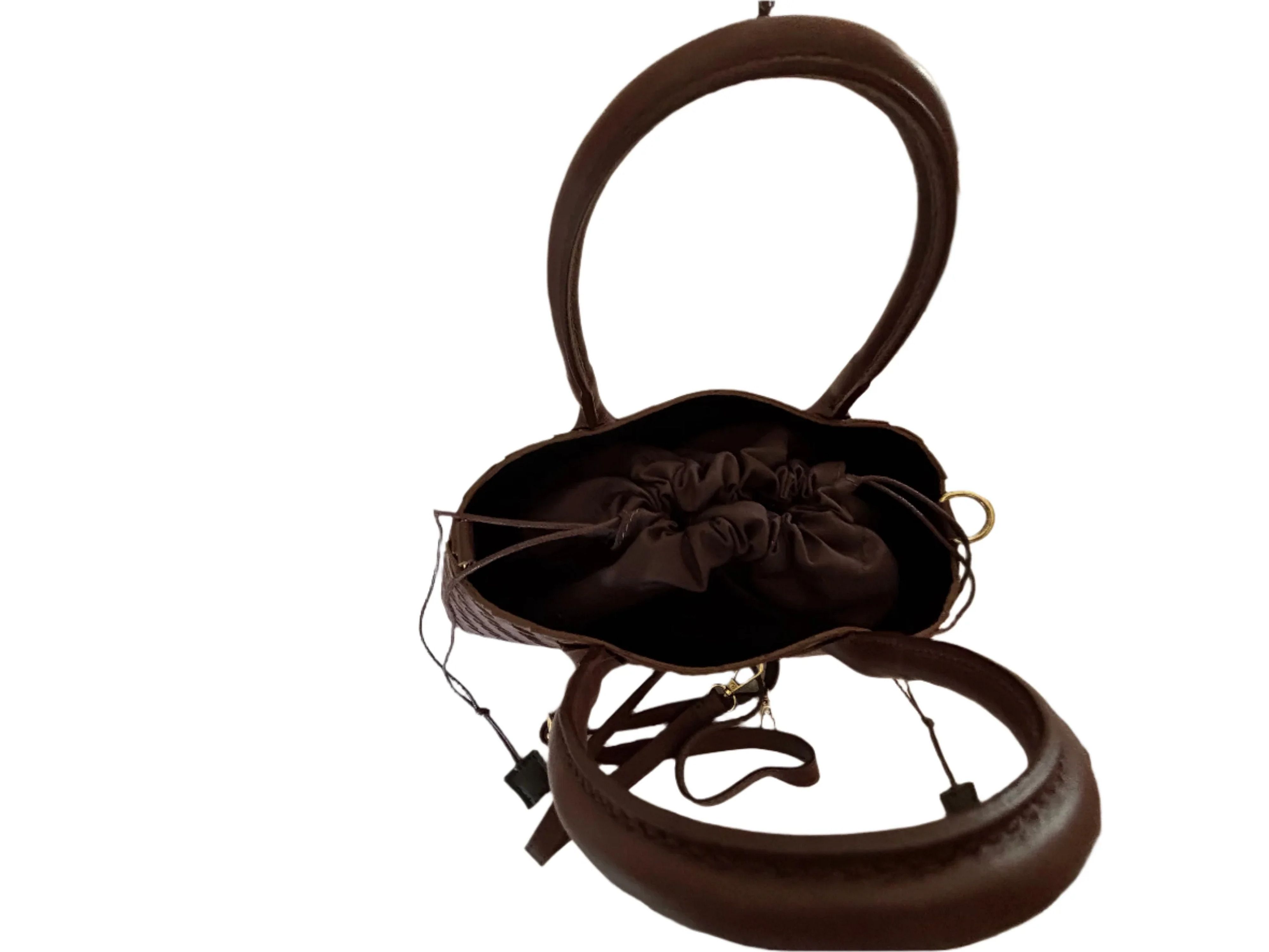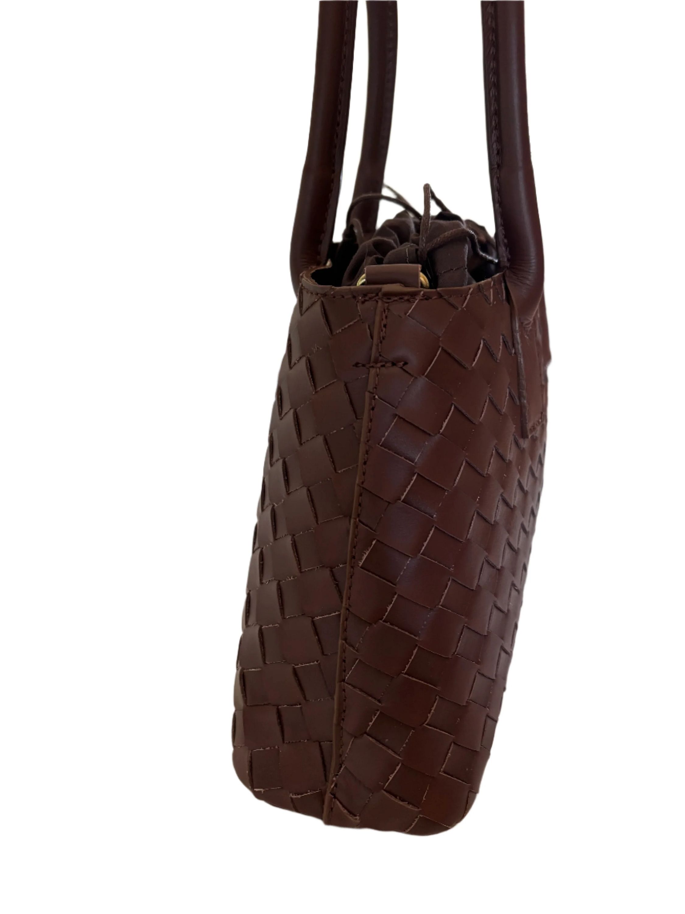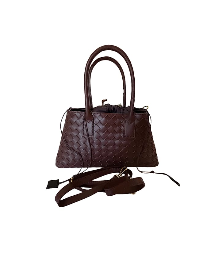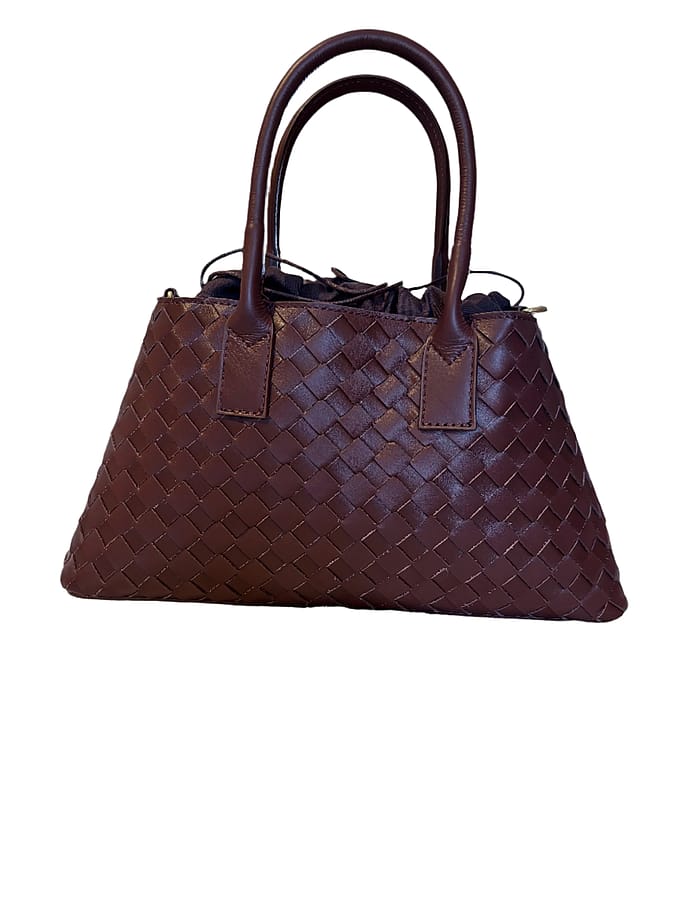 The Oriana woven leather bag features a removable fabric pouch insert with a convenient drawstring closure, complemented by sturdy top handles and an adjustable crossbody strap. This design offers versatile carrying options while maintaining a refined and elegant look, perfect for those who appreciate both style and functionality.