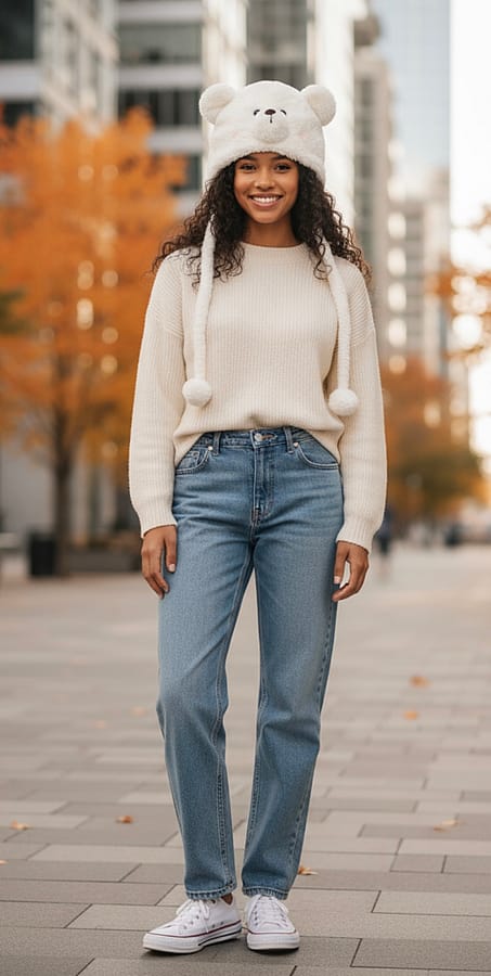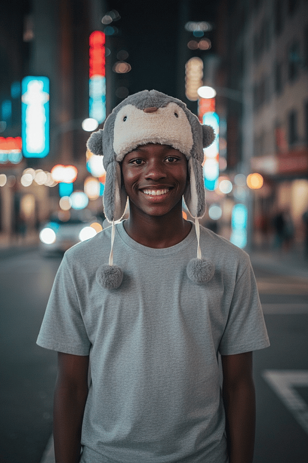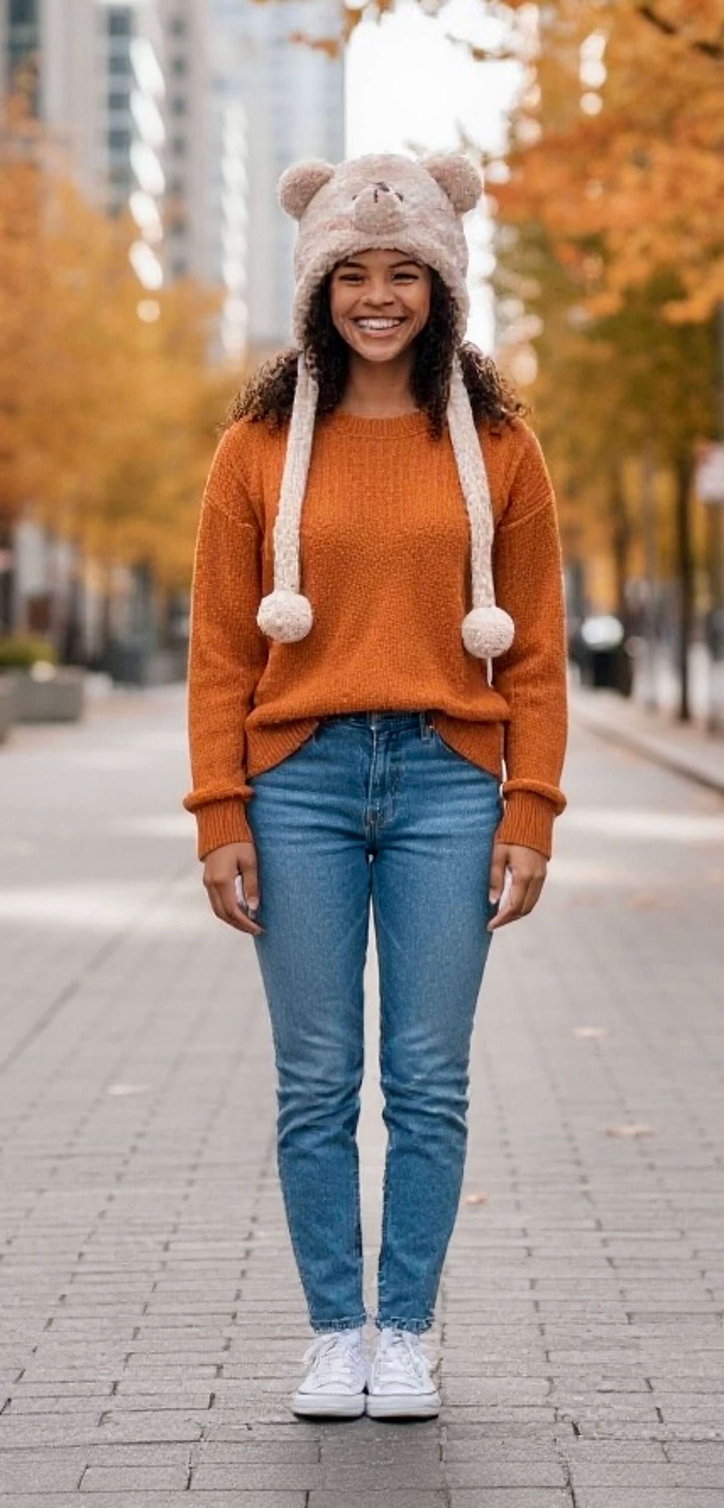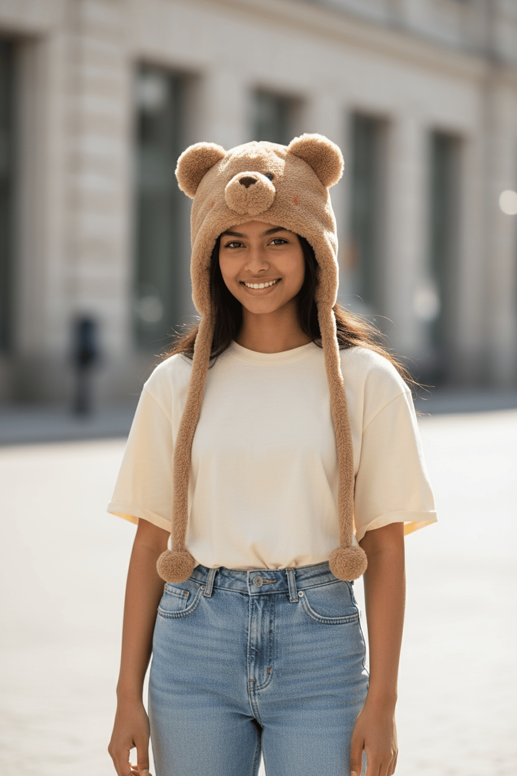Whether it’s a bear or a penguin, you will look adorable. Super soft and cozy, these hats will keep you cute and warm! The bear comes in ivory, beige and brown. The penguin comes in gray.