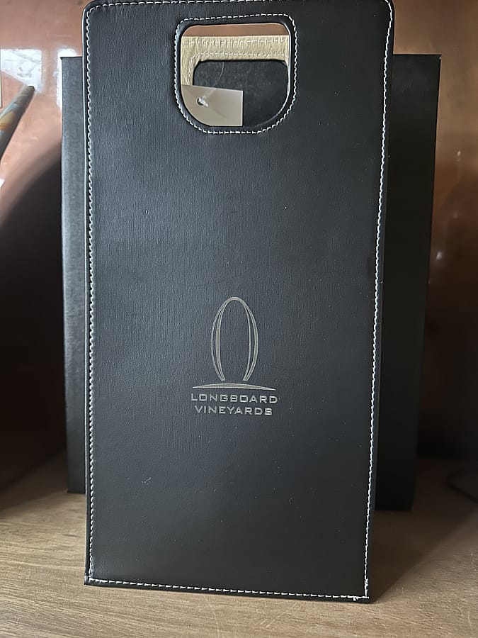 This black leatherette wine tote with white contrast stitching features the embossed Longboard surfboard logo, bringing a touch of refinement to any gift or outing. Lined with soft fabric and crafted for durability, it’s ideal for transporting one or two bottles safely — from the tasting room to the beach, picnic, or dinner party.