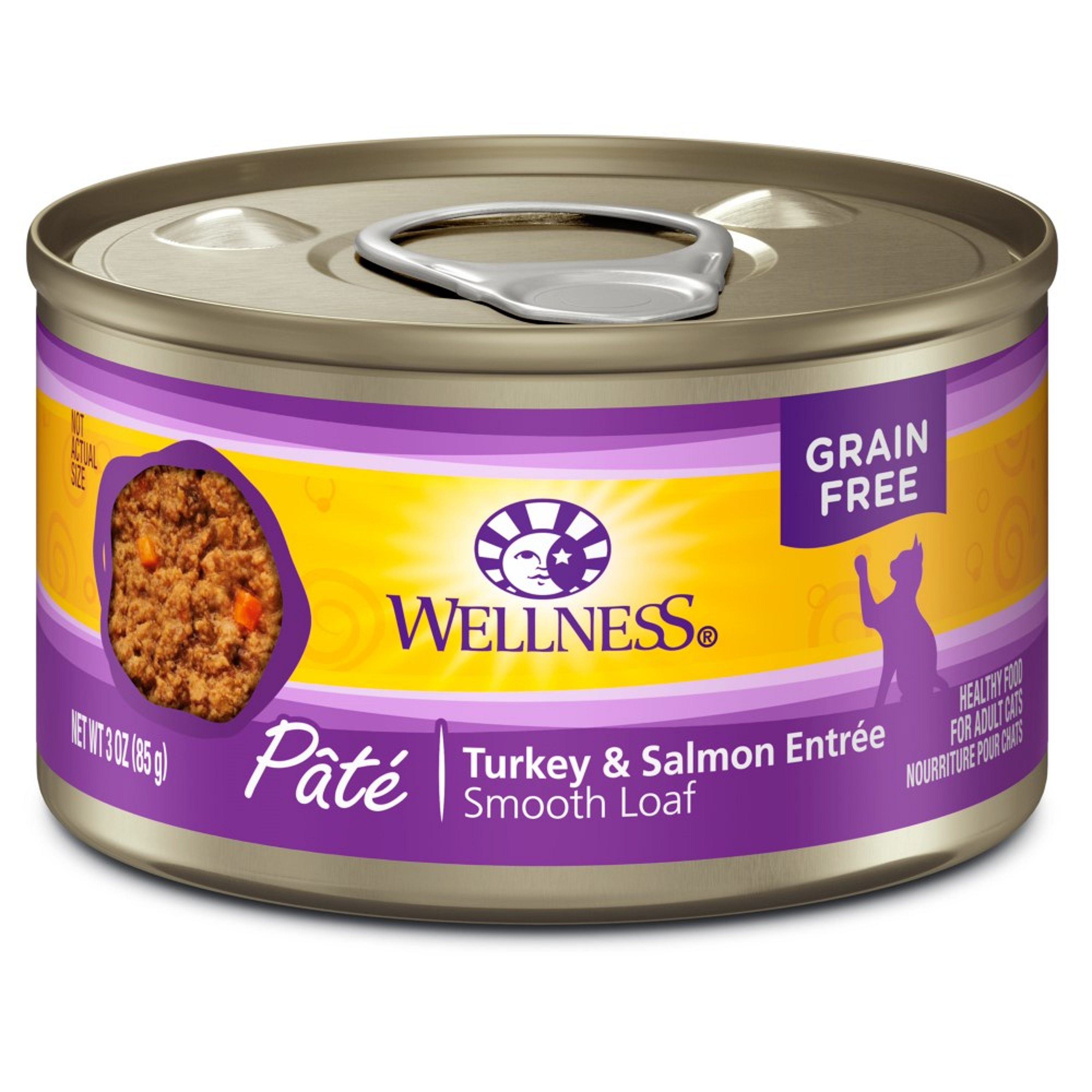 Wellness Grain Free Canned Turkey & Salmon Recipe is an excellent source of high quality protein and essential fatty acids, made with natural, wholesome ingredients free from carageenan, artificial colors, flavors or preservatives.
