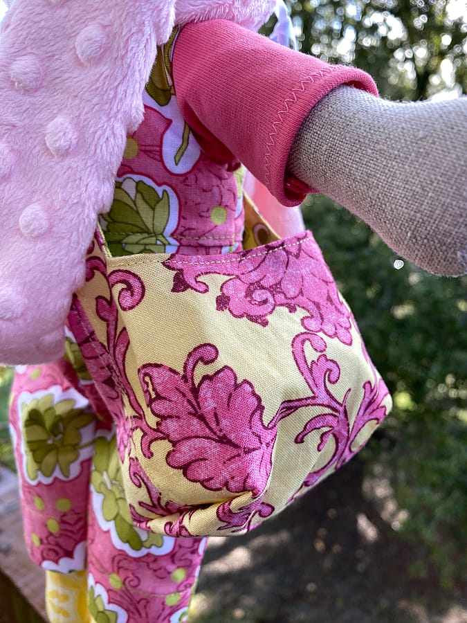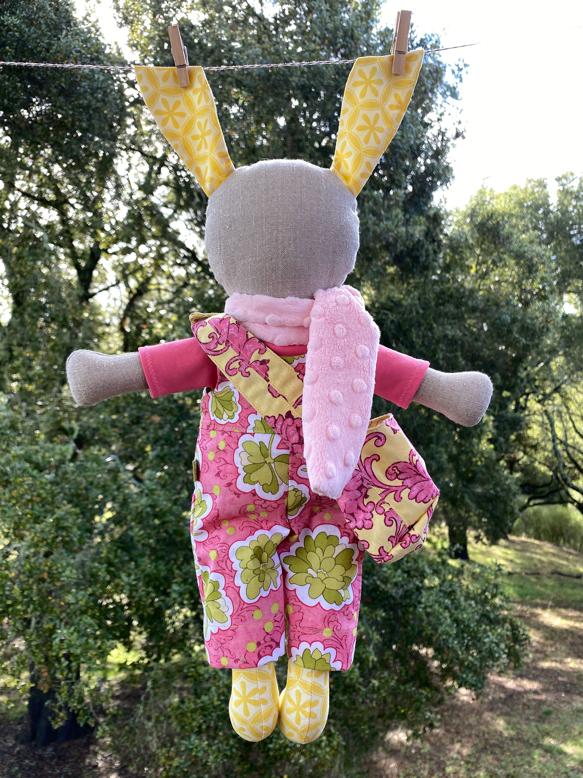 Dressed in lively floral dungarees, a cozy pink T-shirt, and matching little panties, she’s all set for cheerful adventures. Her cuddly textured scarf adds an extra pop of fun, while her roomy shoulder bag is perfect for carrying tiny treasures wherever she hops. With long expressive ears, a sweet embroidered face, and a delightful mix of prints, she radiates joy from head to toe.