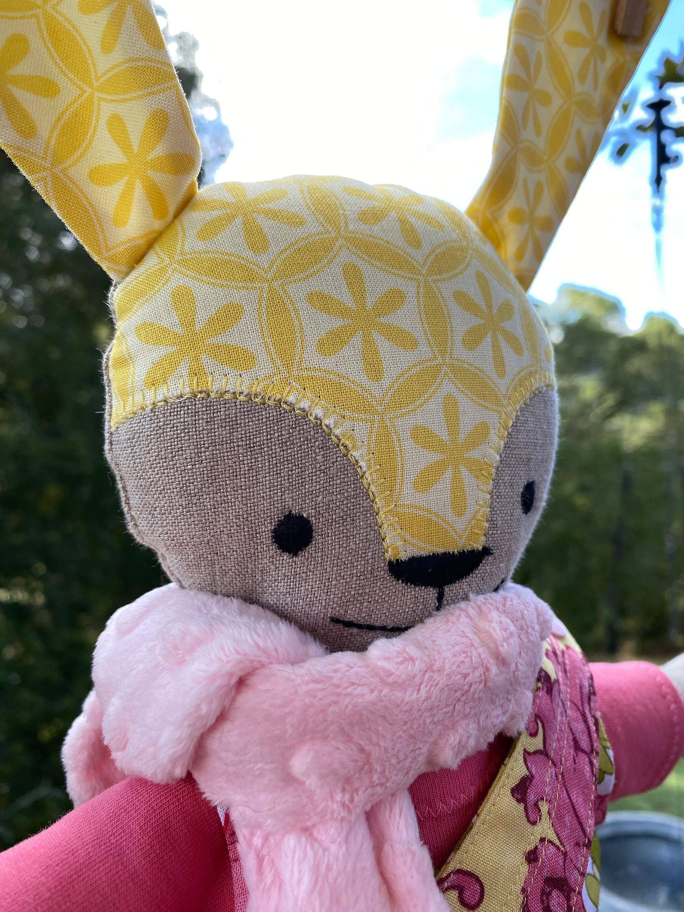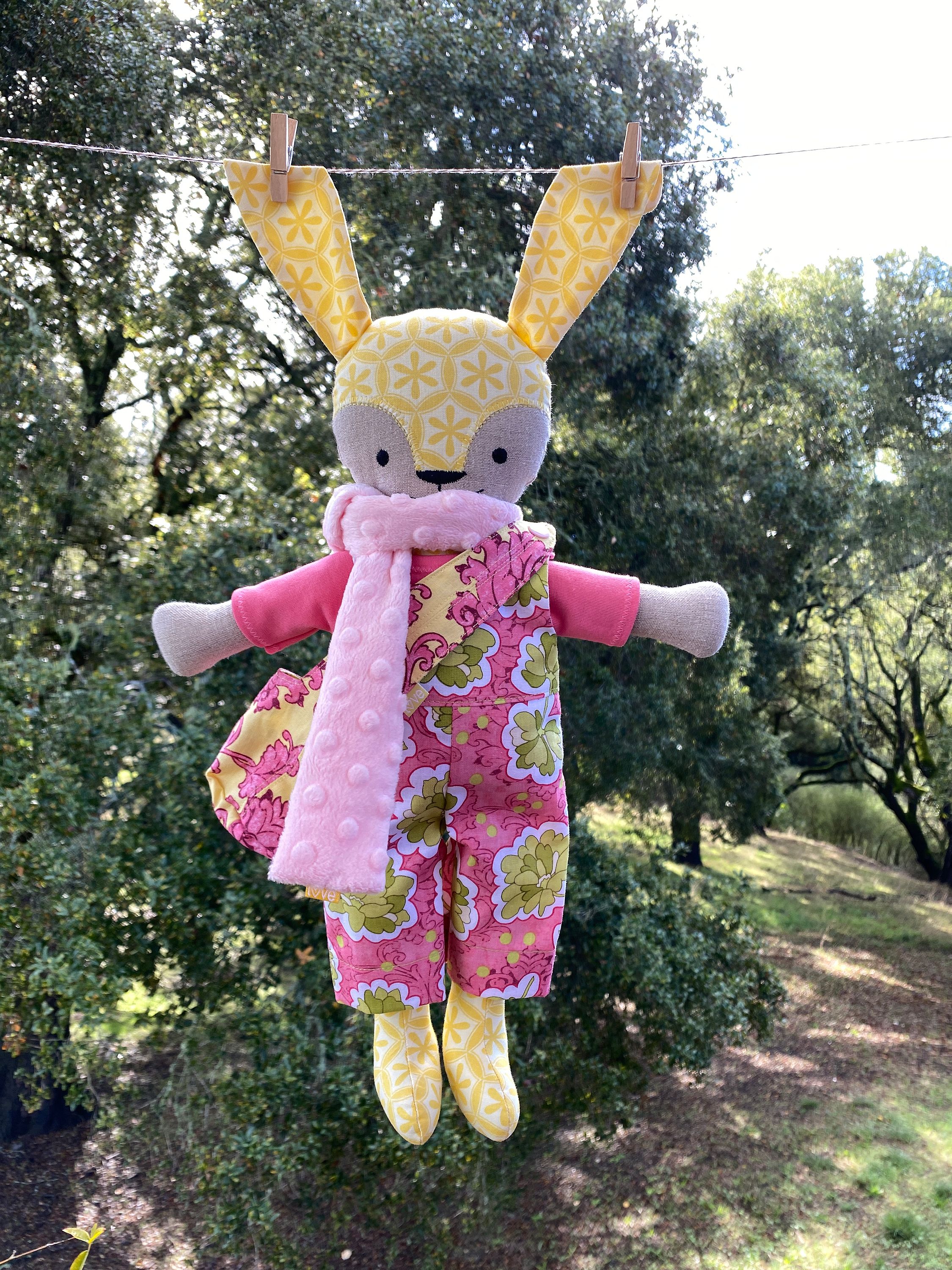 Bursting with color and personality, this handmade 15-inch bunny doll is locally crafted from soft linen and vibrant quilt–cotton fabrics to bring pure happiness to little hands and big imaginations. Every stitch is lovingly placed, giving her a warm, homespun charm that makes her feel instantly special.