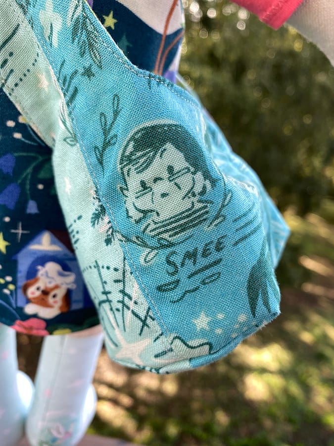 Dressed for adventure, she wears a reversible dress featuring playful scenes of fairies, forests, and starlit skies. Flip it inside out for a whole new look—it’s like getting two outfits in one! Her matching reversible messenger bag swings over her shoulder, roomy enough for tiny treasures, keepsakes, and all the imaginative trinkets picked up along the way. Under her dress, she wears a soft T-shirt and sweet little panties, completing her ready-for-anything wardrobe.