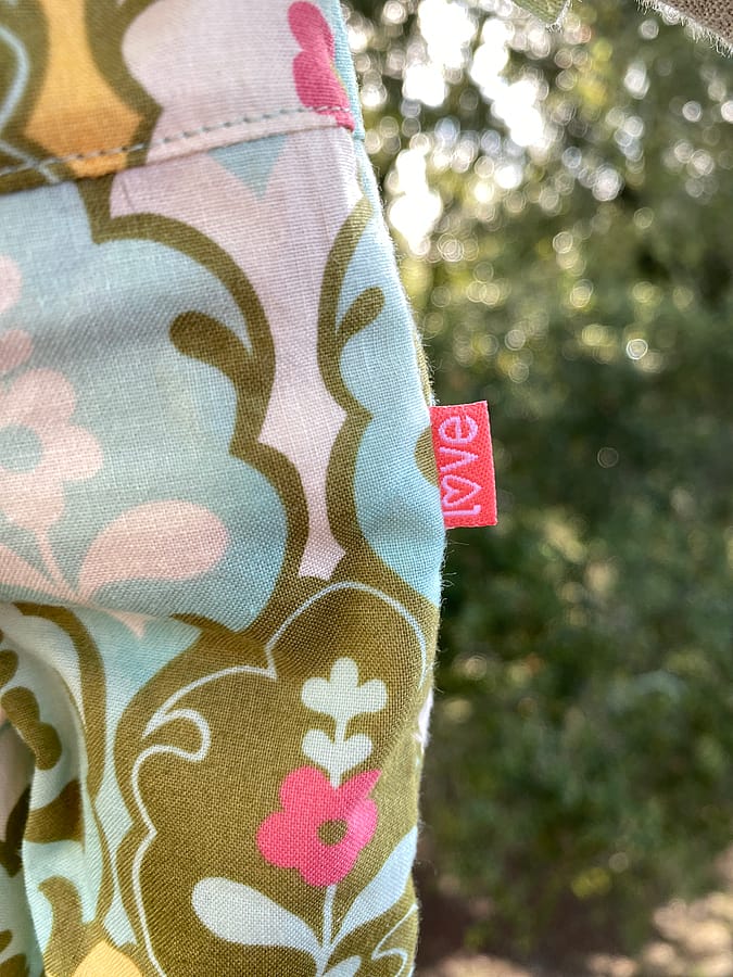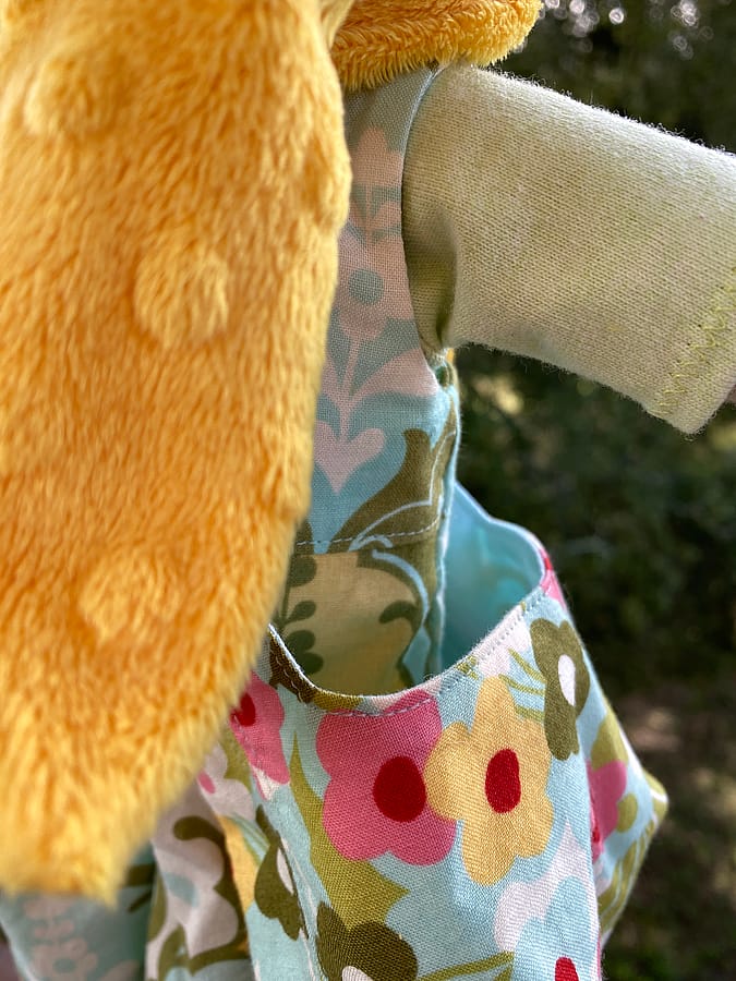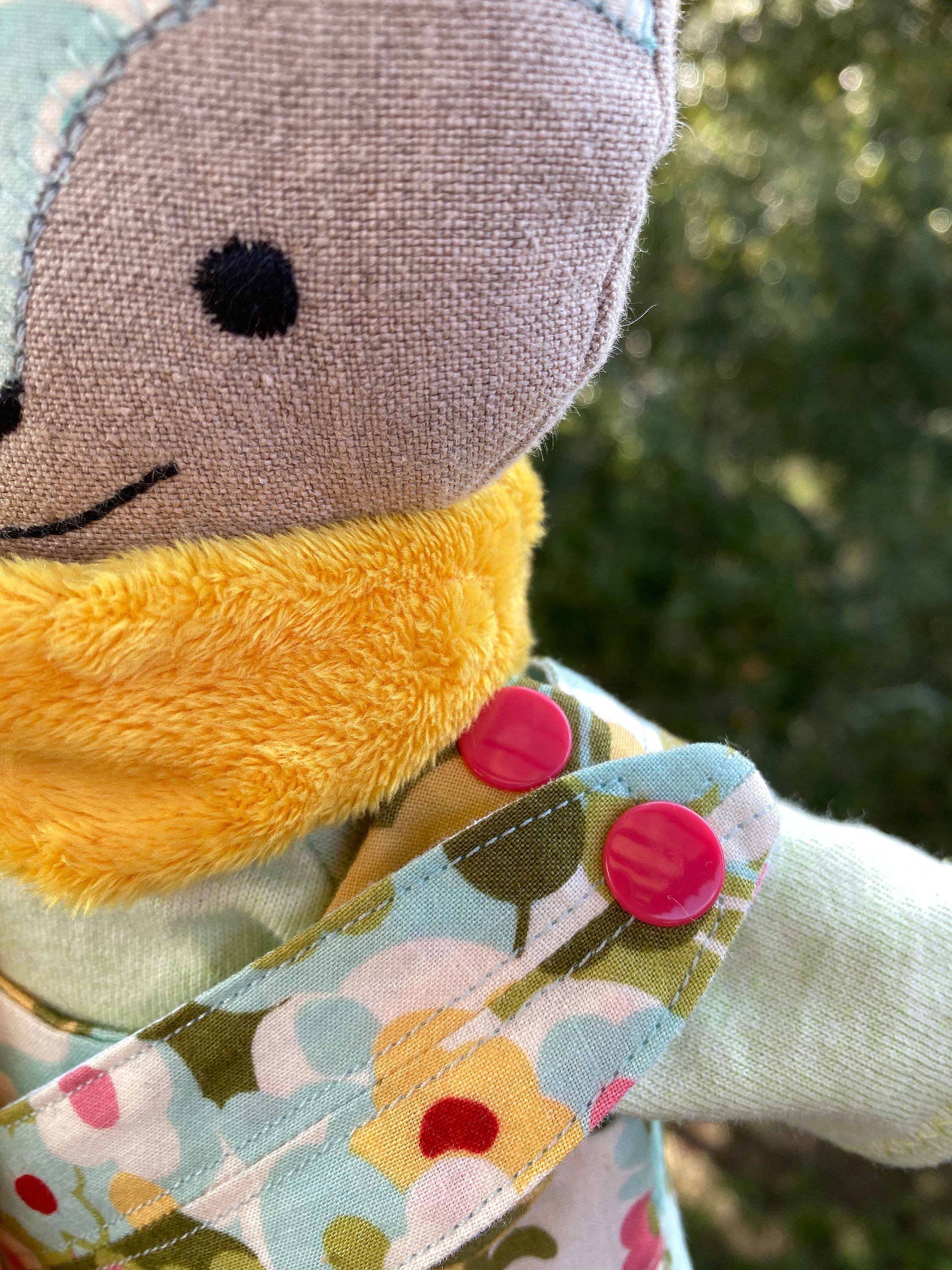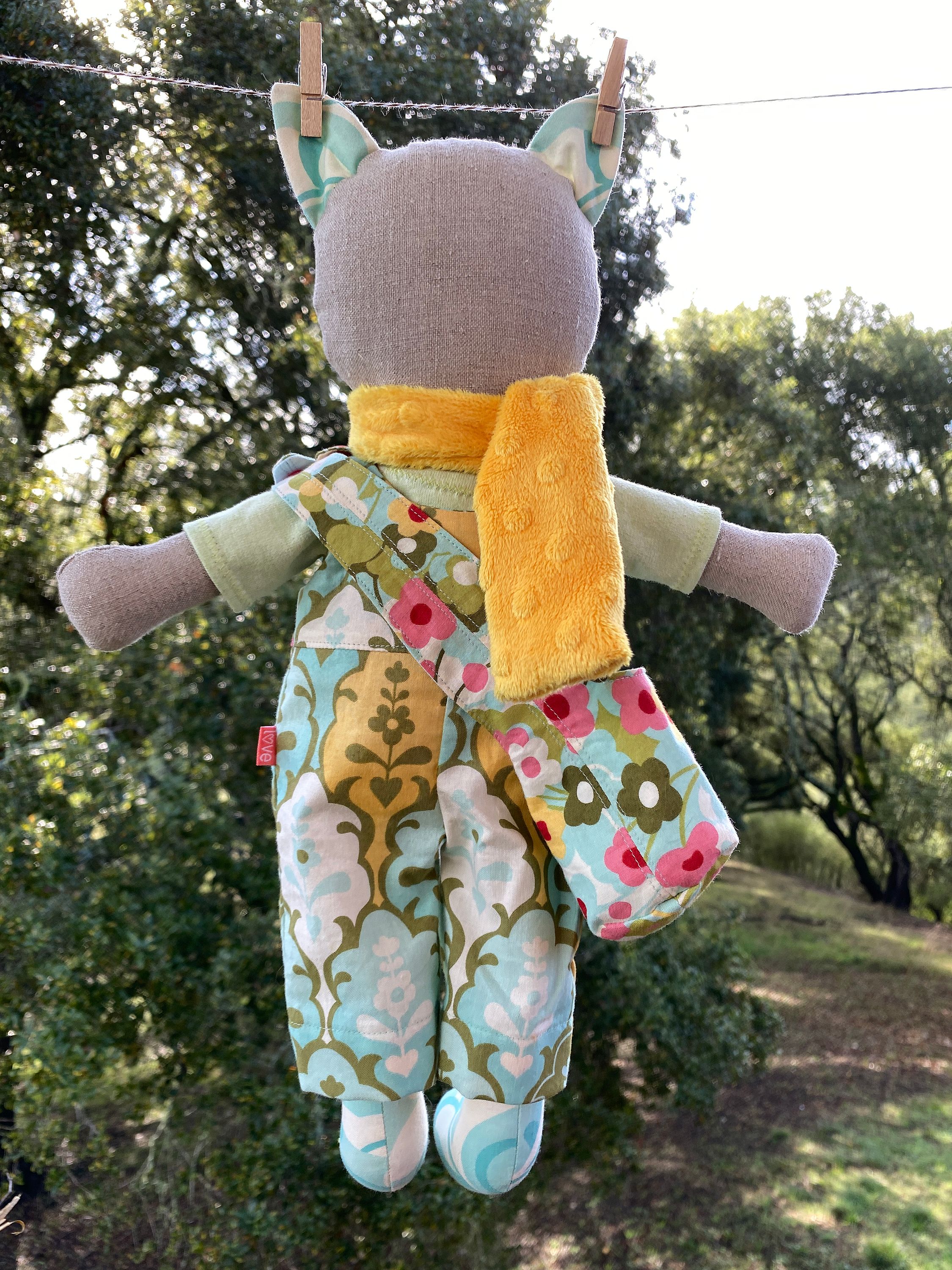 Dressed in bold, botanical-print dungarees paired with a soft pastel T-shirt and sweet little panties, she’s ready for any kind of exploring. Her cozy golden scarf adds a warm pop of sunshine, perfect for snuggles or outdoor pretend play. And her reversible shoulder bag, adorned with whimsical florals and cheerful colors, is just the right size for carrying tiny treasures, secrets, or whatever her day’s adventure requires.