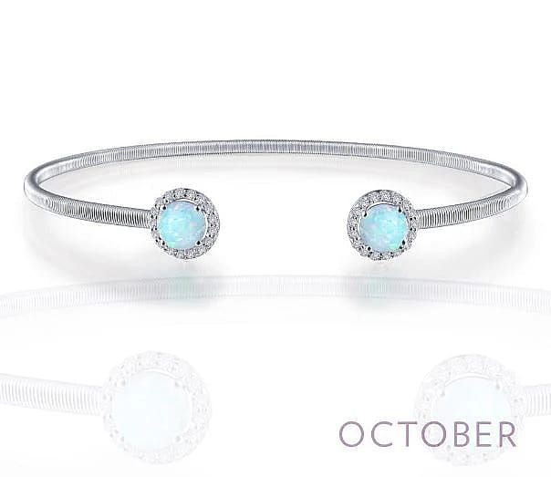 October - Opal. Adorn yourself with Lafonn's birthstone jewelry. This flexible stackable open cuff halo bangle bracelet is set with Lafonn's signature Lassaire simulated diamonds and simulated opals. The bracelet is in sterling silver bonded with platinum