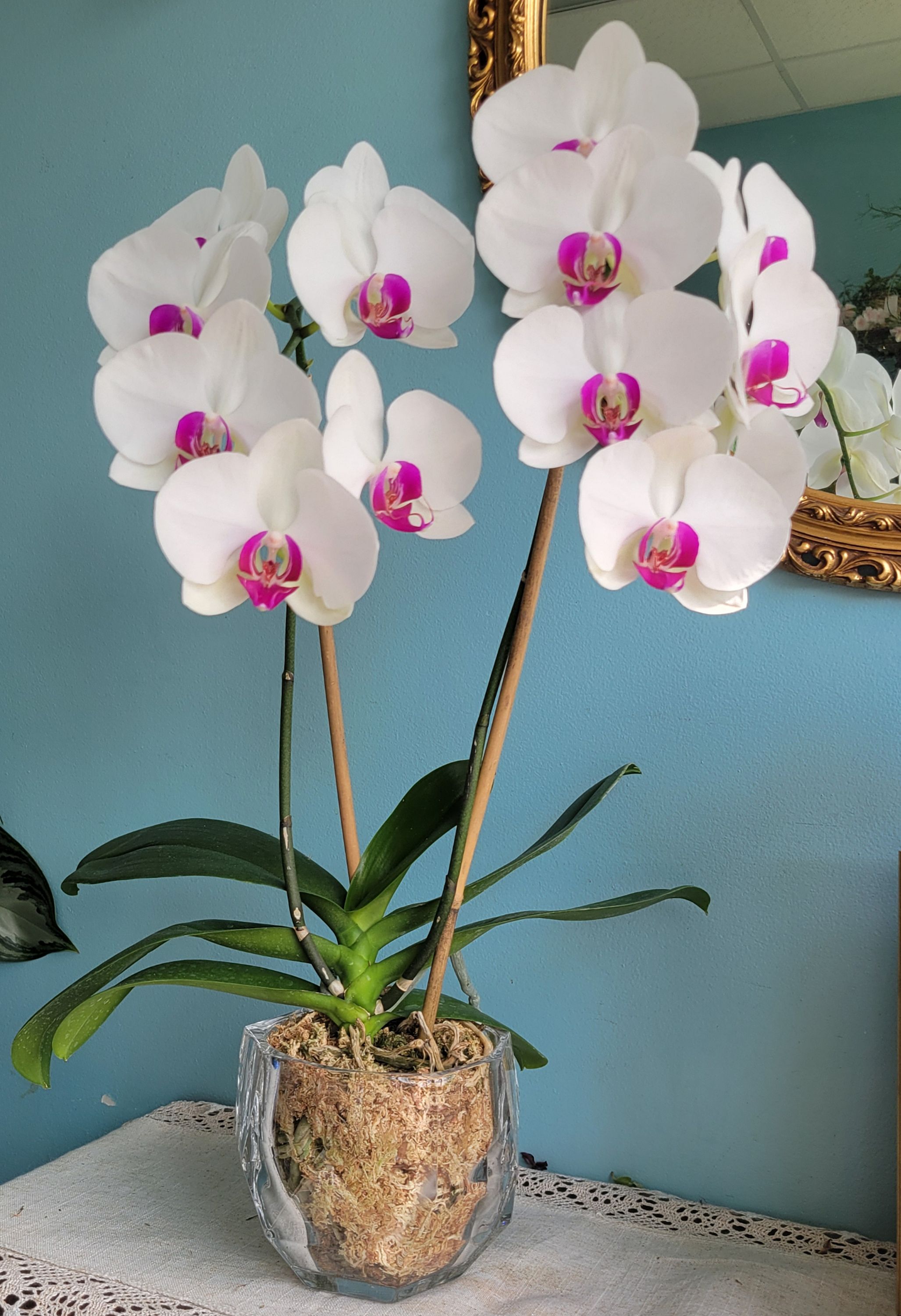 Add a touch of elegance and tranquility to your space with this stunning Phalaenopsis orchid plant, artfully displayed in a beautiful glass faceted bowl. Known for its graceful, long-lasting blooms, the Phalaenopsis orchid exudes sophistication and charm and will add lasting beauty and elegance to any setting.