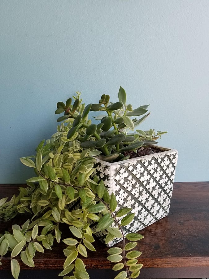 Designer selected assortment of succulent plants potted in a green and white, geometrically patterned stone square pot.