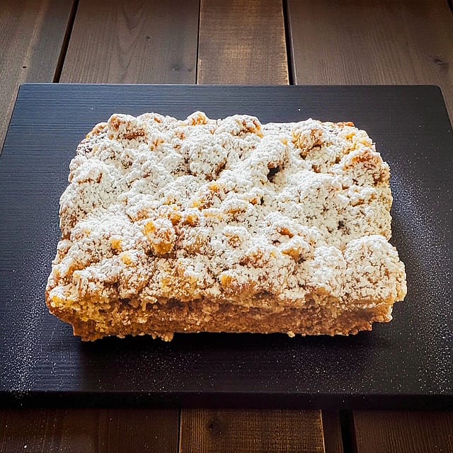 An 8 x 8 tray of moist pumpkin pie cake made with real pumpkin and pumpkin pie spice, topped with crumb cake topping and powdered sugar.
