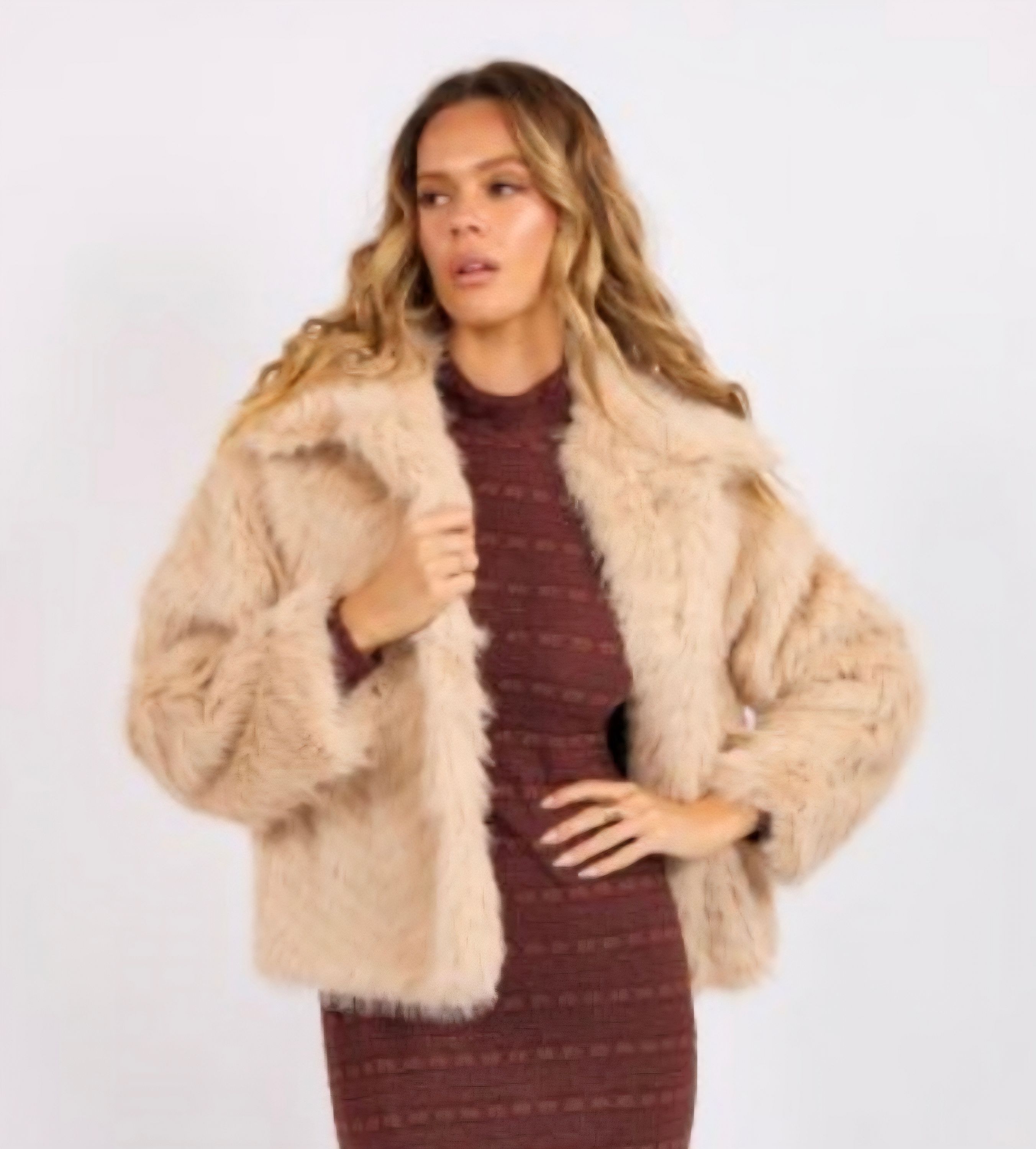 Elevate your wardrobe with this stunning faux-fur cozy and fashion-forward piece in two-tone taupes. Only one left size { L }