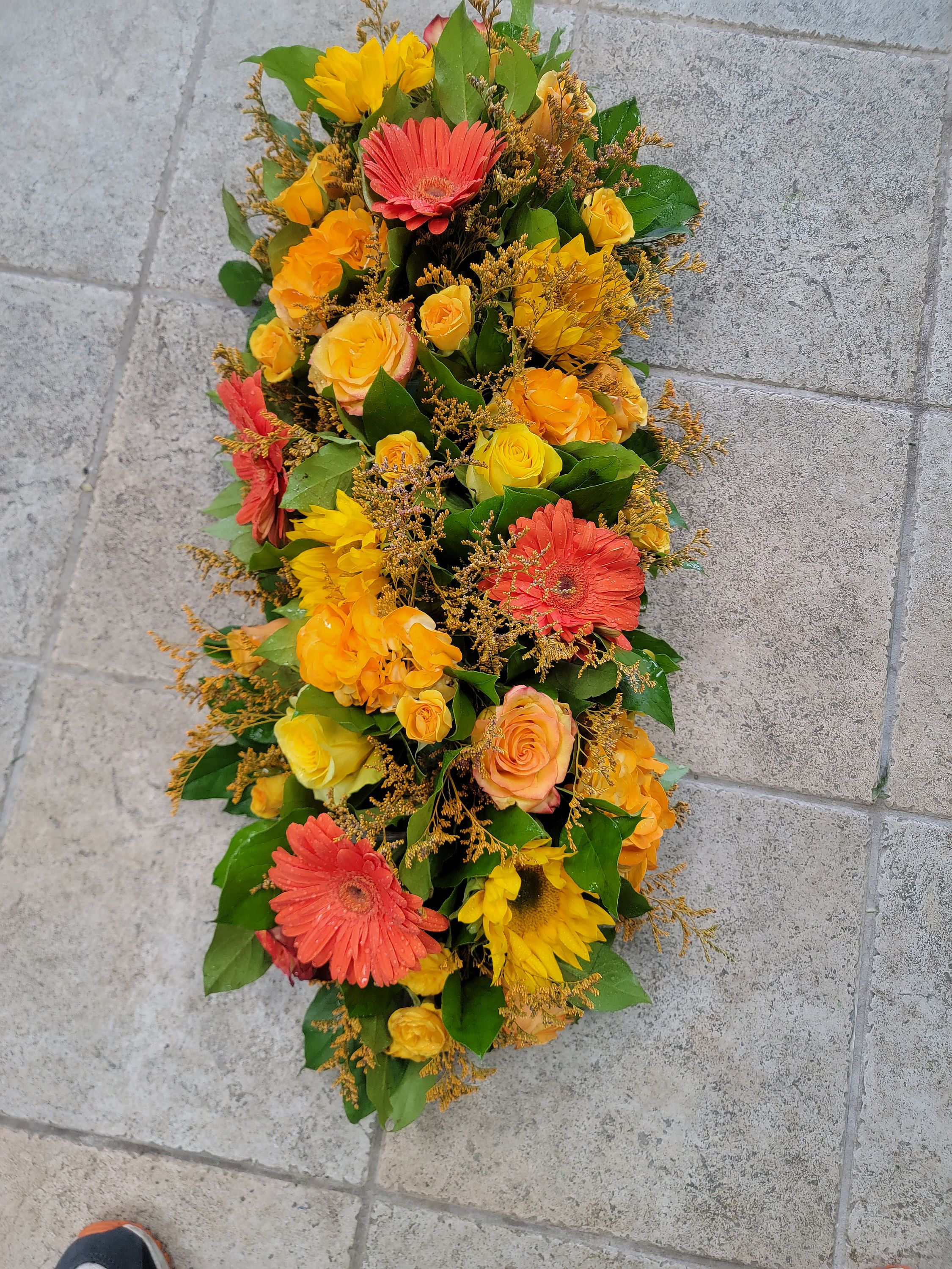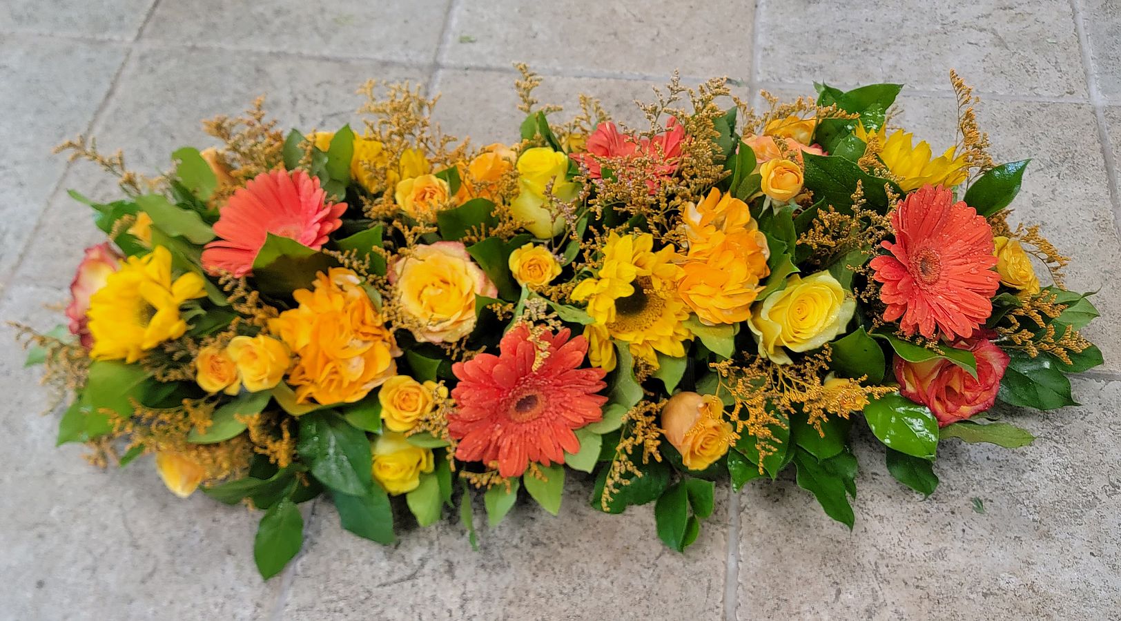 Variety of orange florals for a delightful centerpiece. 26-inch-long x 10-inch height *Each piece will vary*